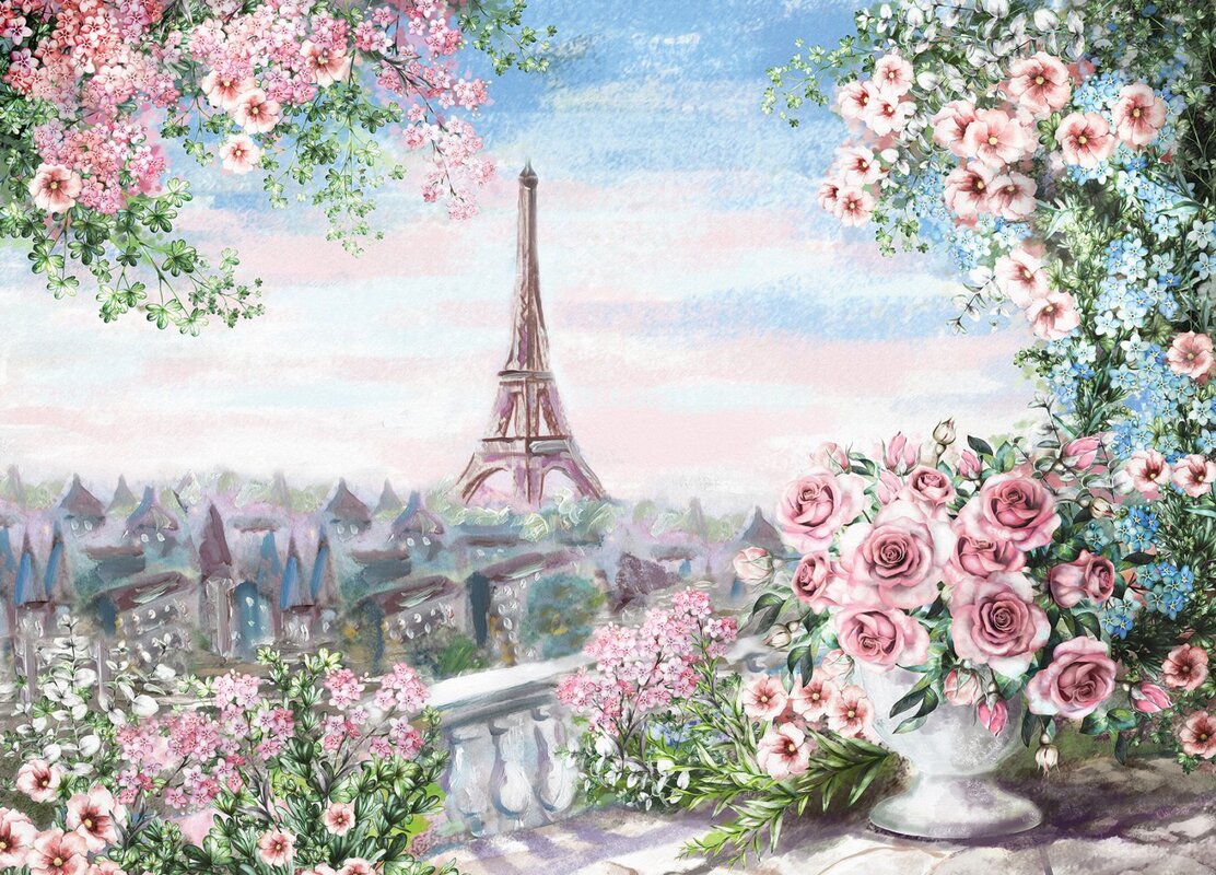 Fototapete: Blick auf die Pariser Landschaft von einem blumengefüllten Balkon