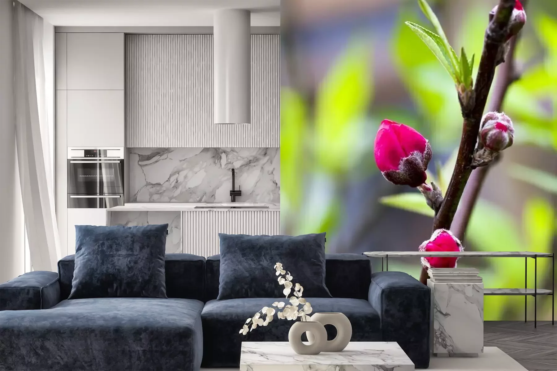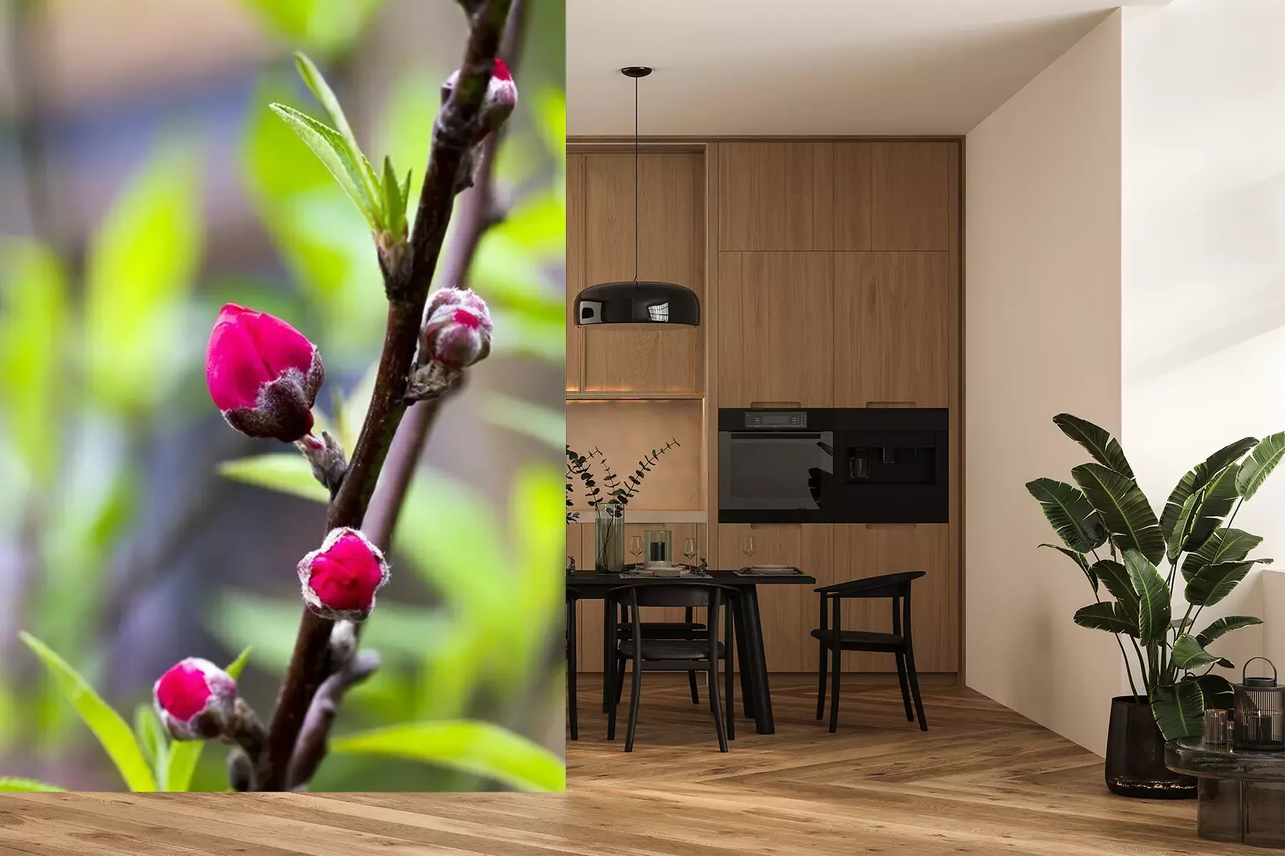 Das Material Premium+ besteht aus einer strukturierten Vinyl-Oberschicht und einem Trägermaterial (Vlies) mit einer Grammatur von 255 g/m², das kleine Unebenheiten der Wand zuverlässig kaschiert. Die feine Sandstruktur verleiht der Oberfläche eine luxuriöse Haptik, während das halbmatte Finish die Tiefe der Farben betont. Das Material ist dampfdurchlässig – so kann diese Fototapete auch in Küchen und Badezimmern eingesetzt werden. Die maximale Breite einer Tapetenbahn beträgt 100 cm. Bei größeren Abmessungen besteht die Fototapete aus mehreren gleich großen Bahnen. Der Kleber wird direkt auf die Wand aufgetragen, und die Fototapete wird auf Stoß angebracht, was für einen ästhetischen Effekt ohne sichtbare Fugen sorgt. Die Oberfläche ist pflegeleicht und kann bei Bedarf sanft mit einem feuchten Tuch abgewischt werden.