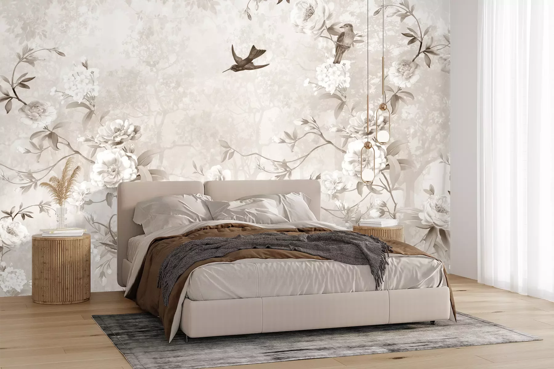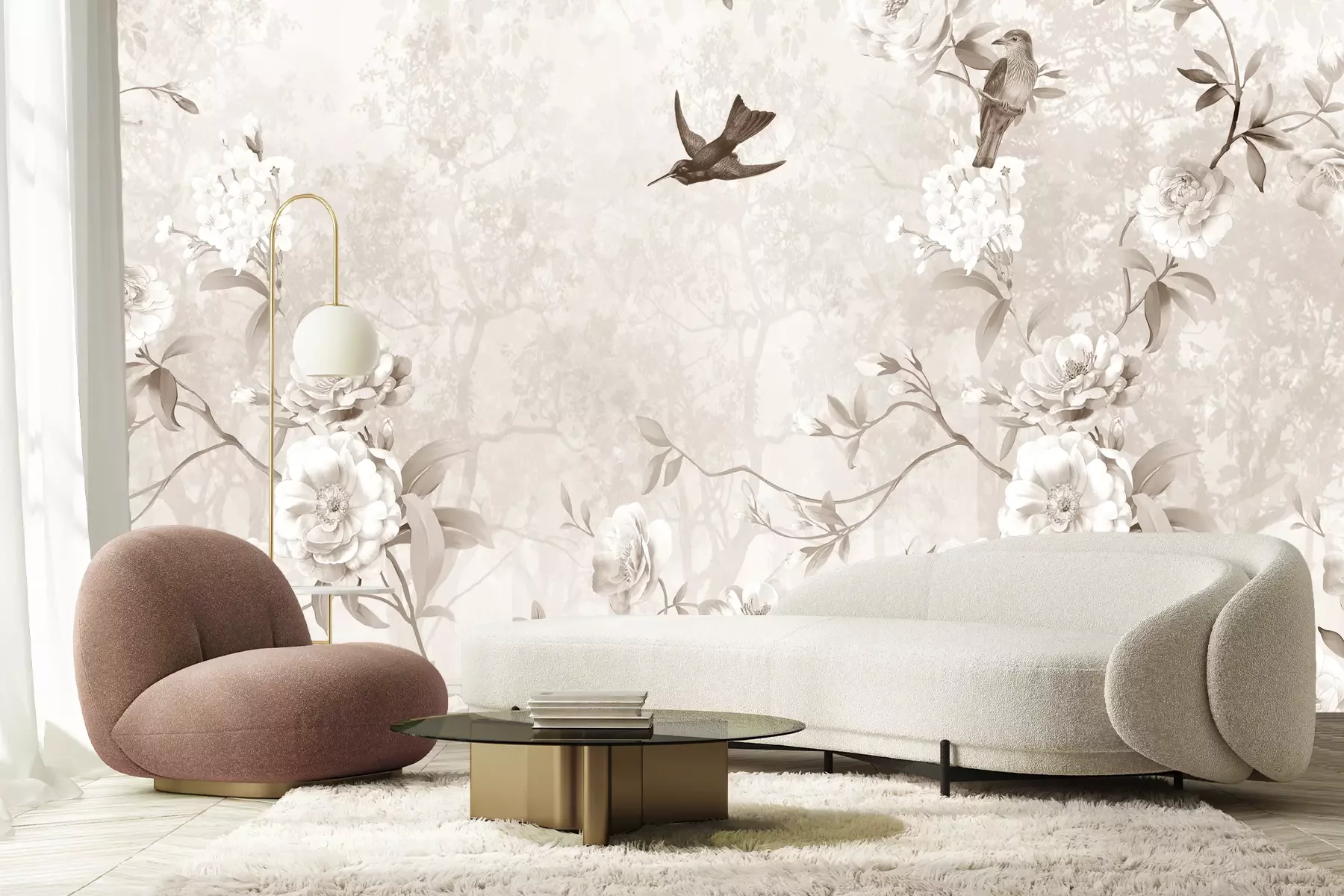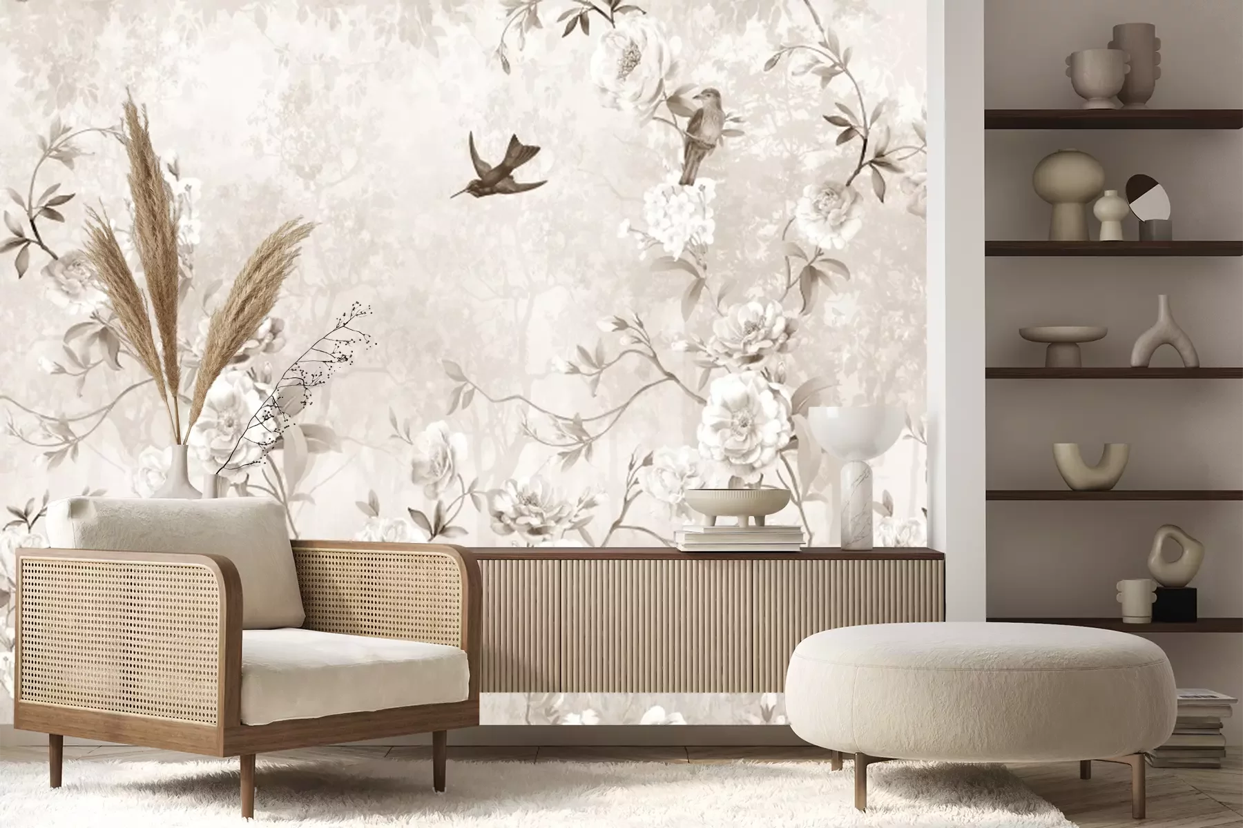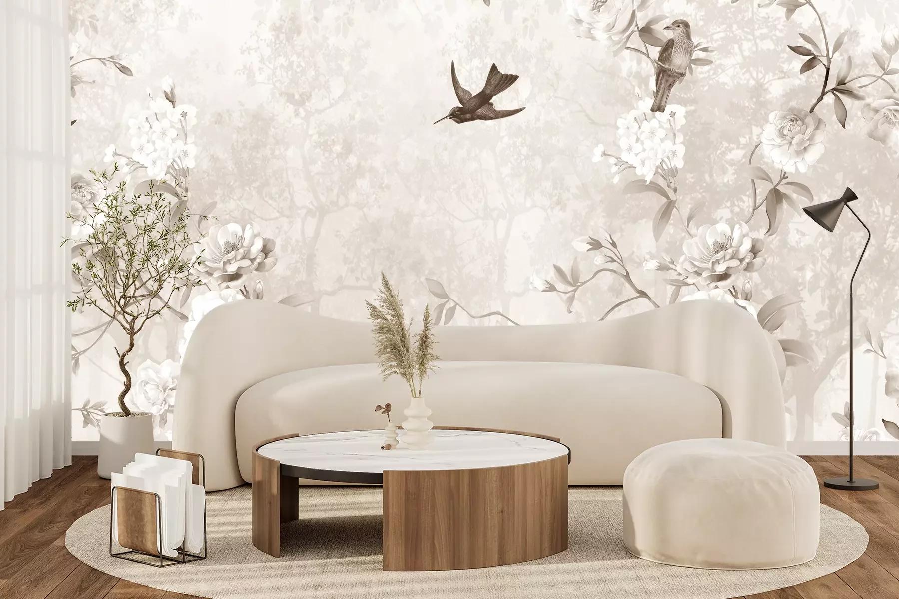 Blühende rosen und vögel in beigetönen