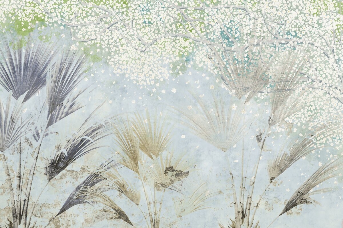 Fototapete: Blühender Baum und Palmblätter auf Betonhintergrund
