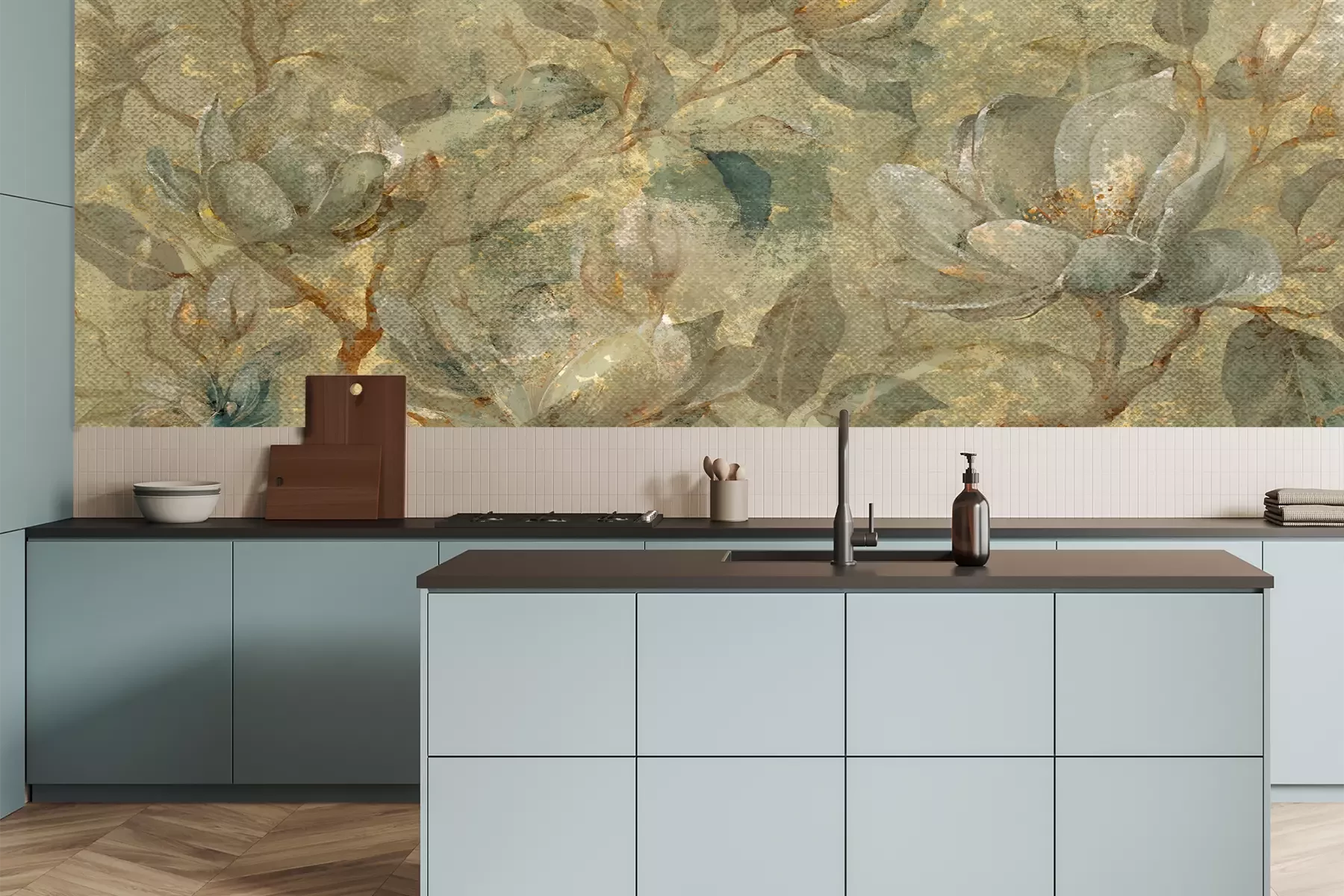 Das Material Premium+ besteht aus einer strukturierten Vinyl-Oberschicht und einem Trägermaterial (Vlies) mit einer Grammatur von 255 g/m², das kleine Unebenheiten der Wand zuverlässig kaschiert. Die feine Sandstruktur verleiht der Oberfläche eine luxuriöse Haptik, während das halbmatte Finish die Tiefe der Farben betont. Das Material ist dampfdurchlässig – so kann diese Fototapete auch in Küchen und Badezimmern eingesetzt werden. Die maximale Breite einer Tapetenbahn beträgt 100 cm. Bei größeren Abmessungen besteht die Fototapete aus mehreren gleich großen Bahnen. Der Kleber wird direkt auf die Wand aufgetragen, und die Fototapete wird auf Stoß angebracht, was für einen ästhetischen Effekt ohne sichtbare Fugen sorgt. Die Oberfläche ist pflegeleicht und kann bei Bedarf sanft mit einem feuchten Tuch abgewischt werden.