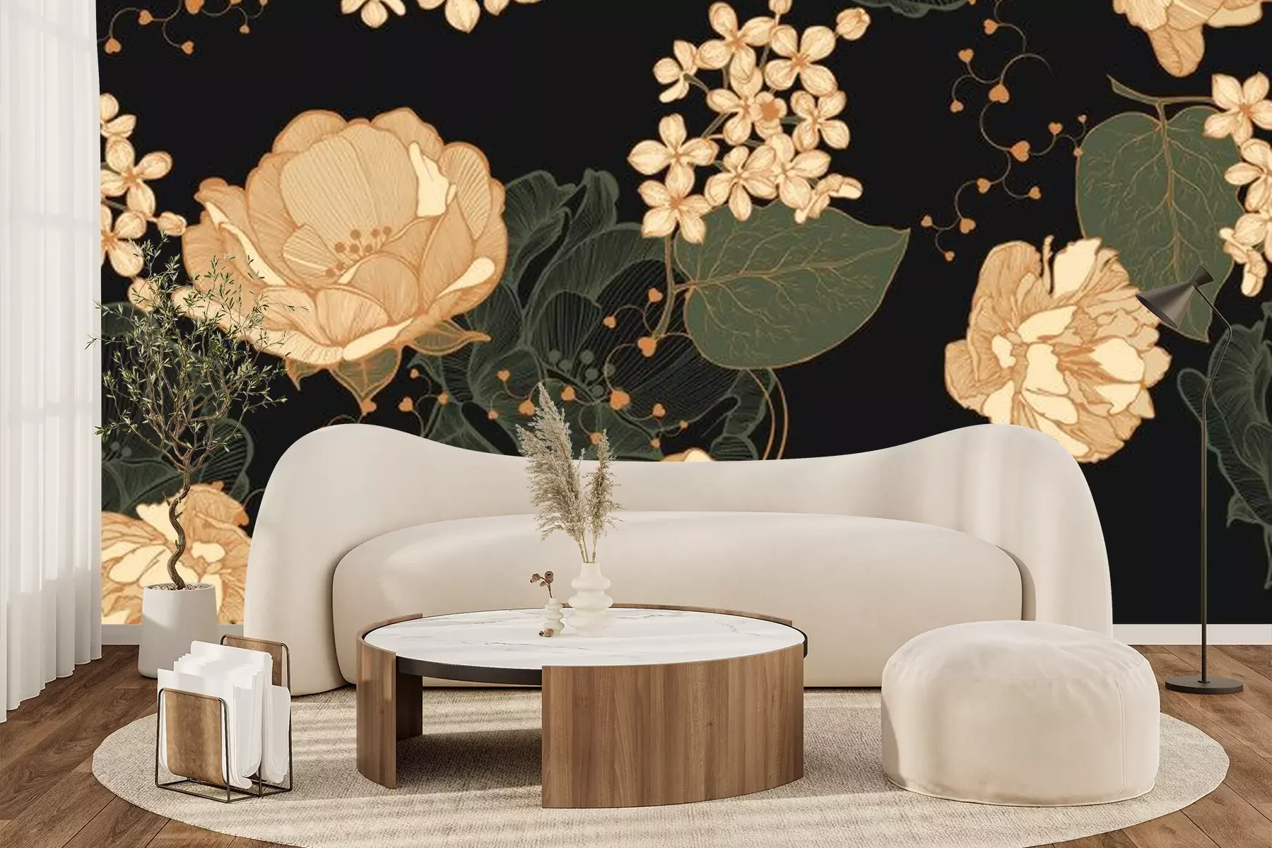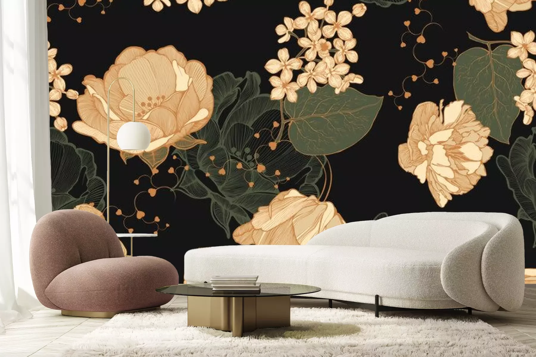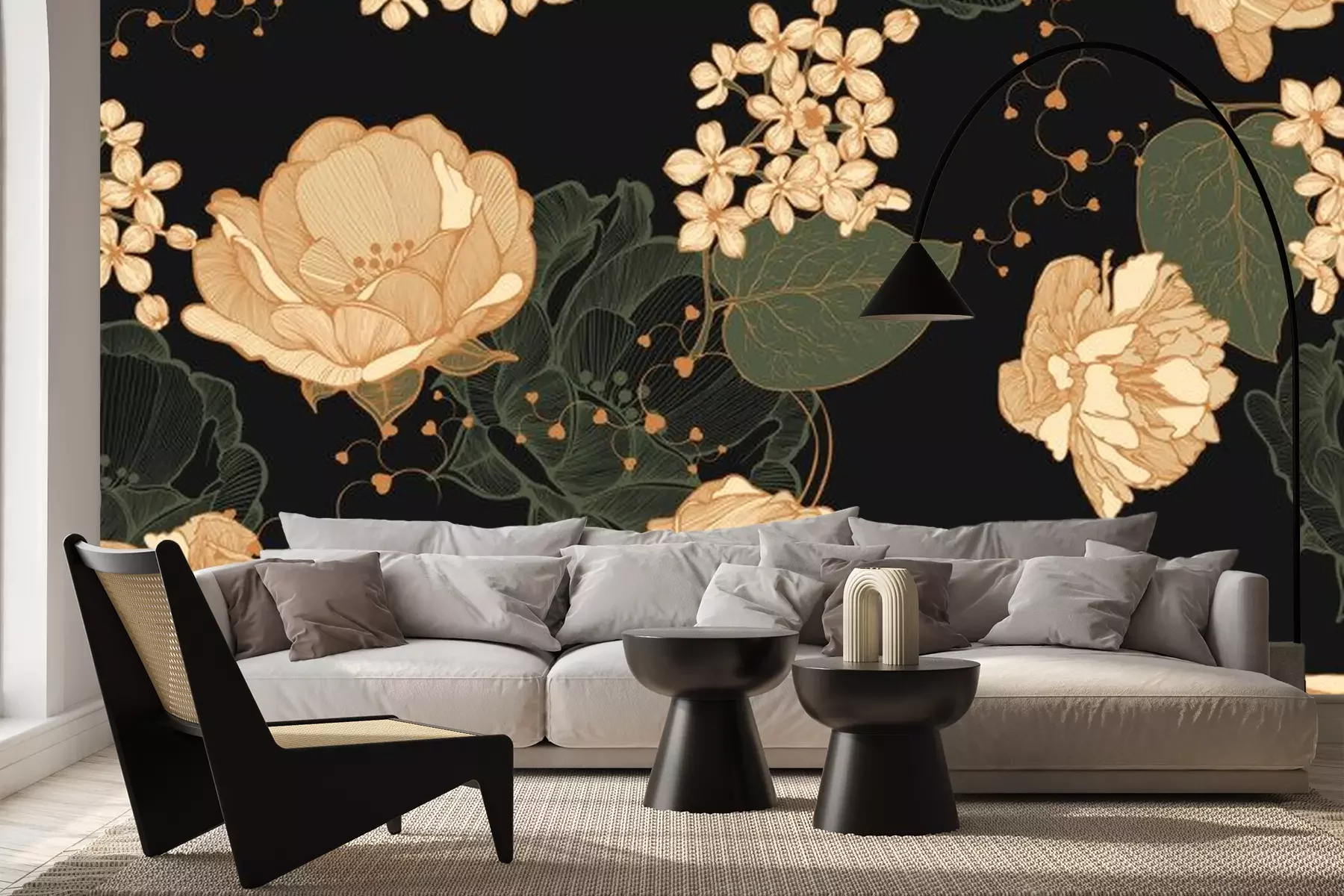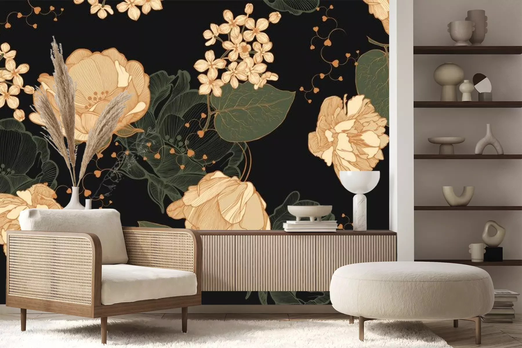 Fototapete Blumen im Retro-Stil auf schwarzem Hintergrund