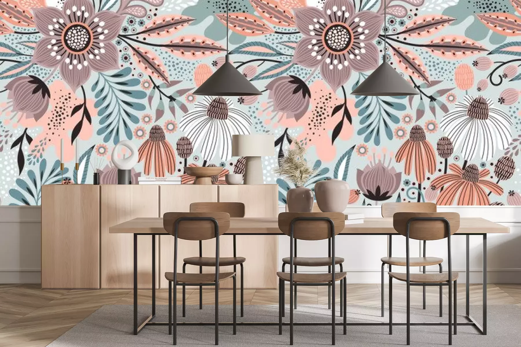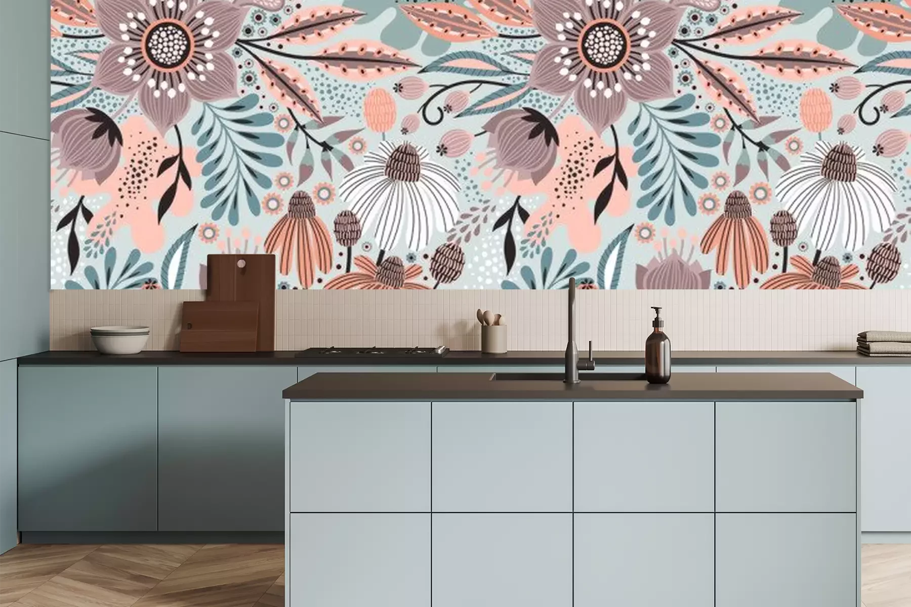Fototapete Blumenmuster auf weißem Hintergrund im skandinavischen Stil