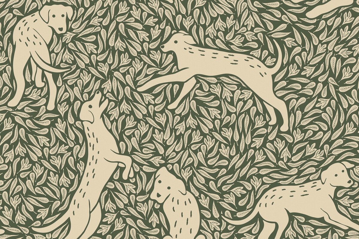 Fototapete: Botanisches Muster mit Hunden und Grünpflanzen