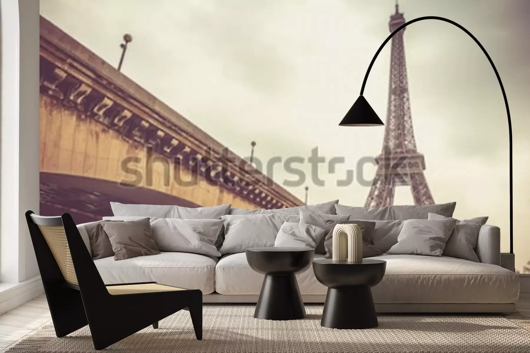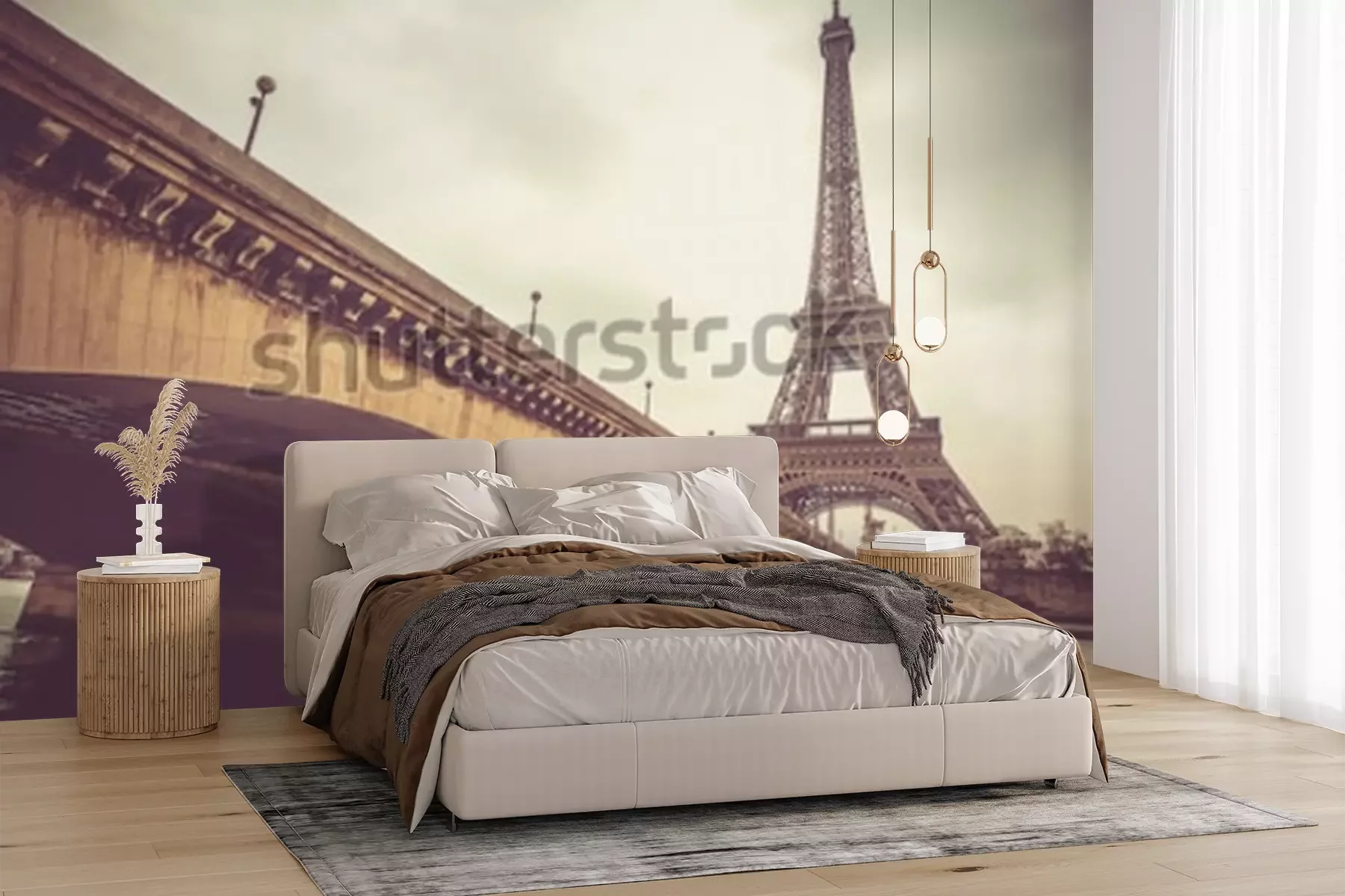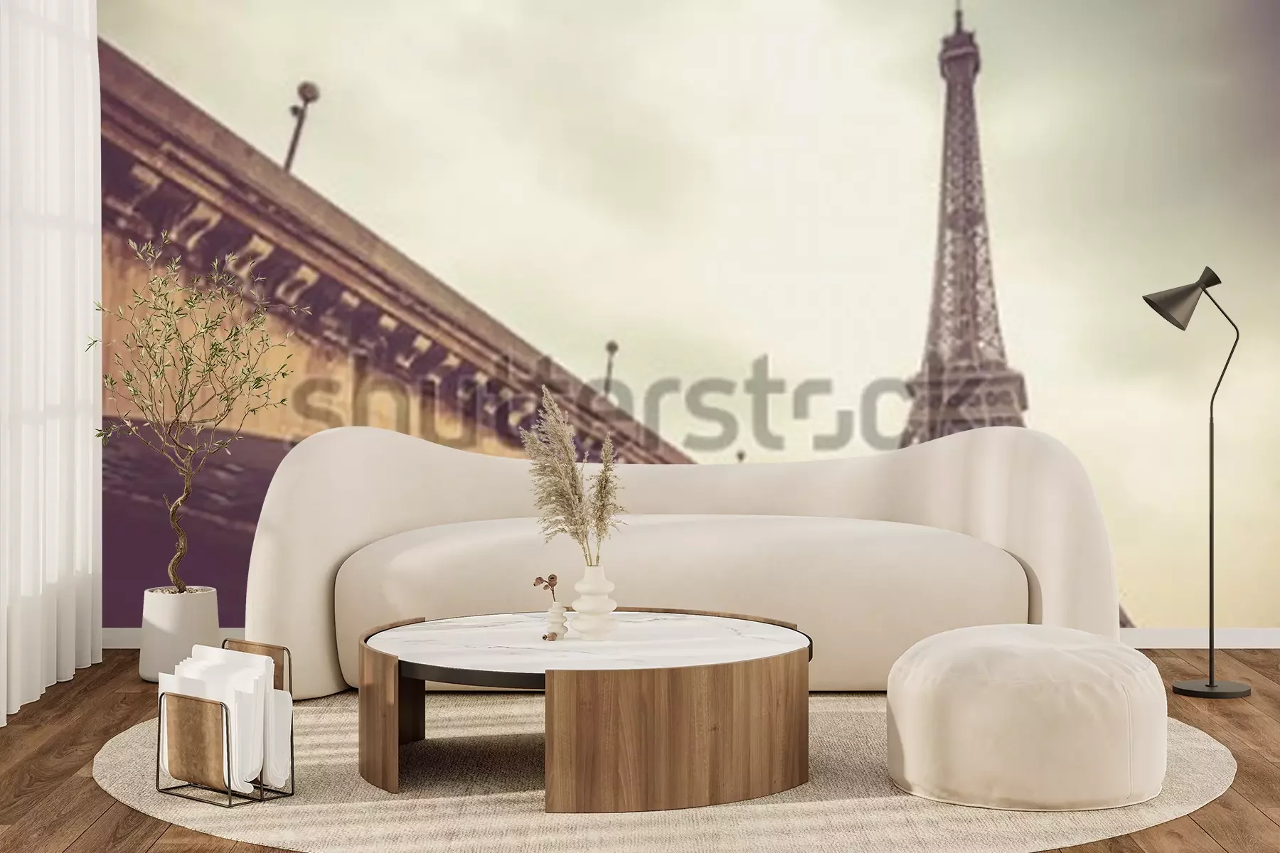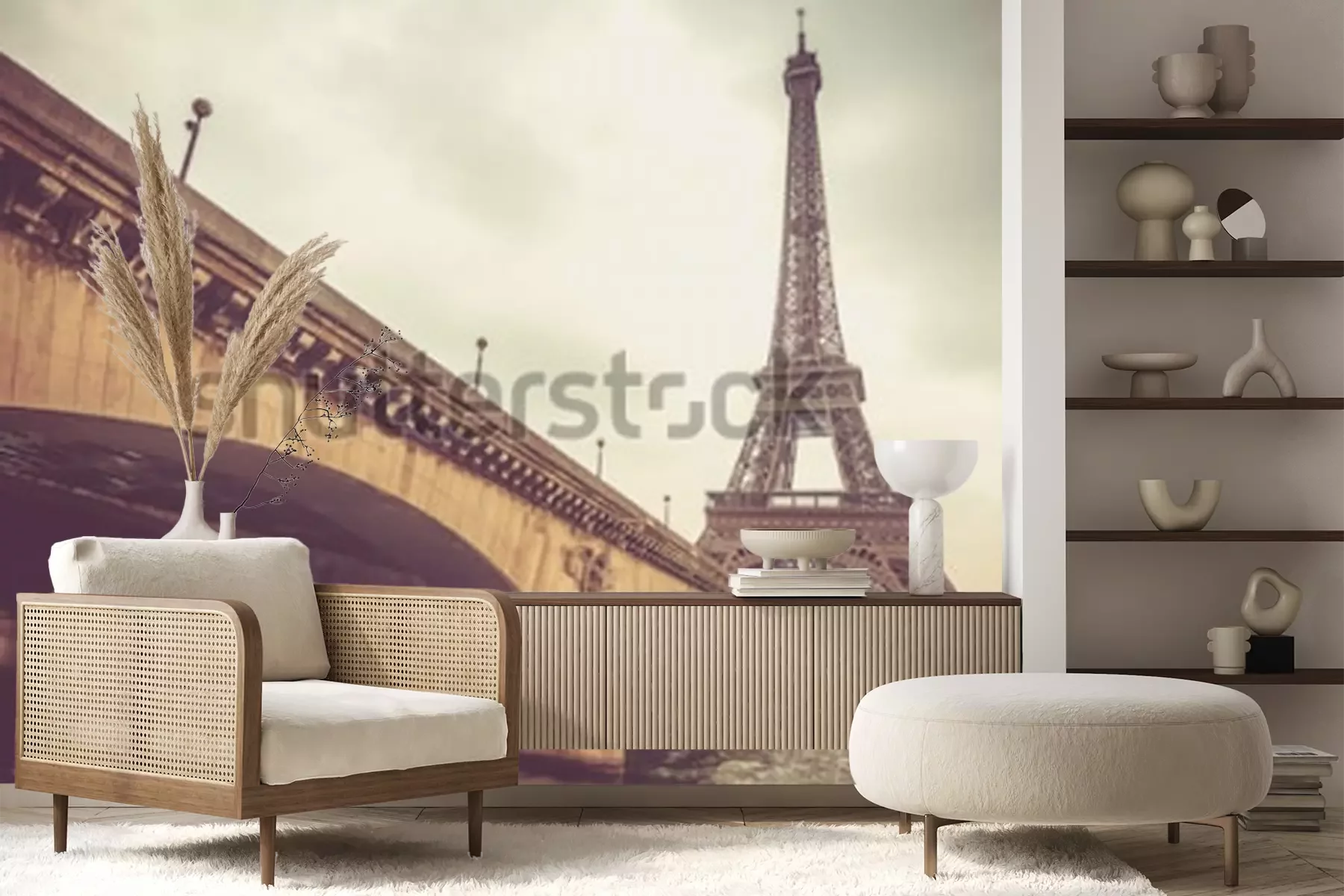 Fototapete Brücke und Eiffelturm am bewölkten Tag