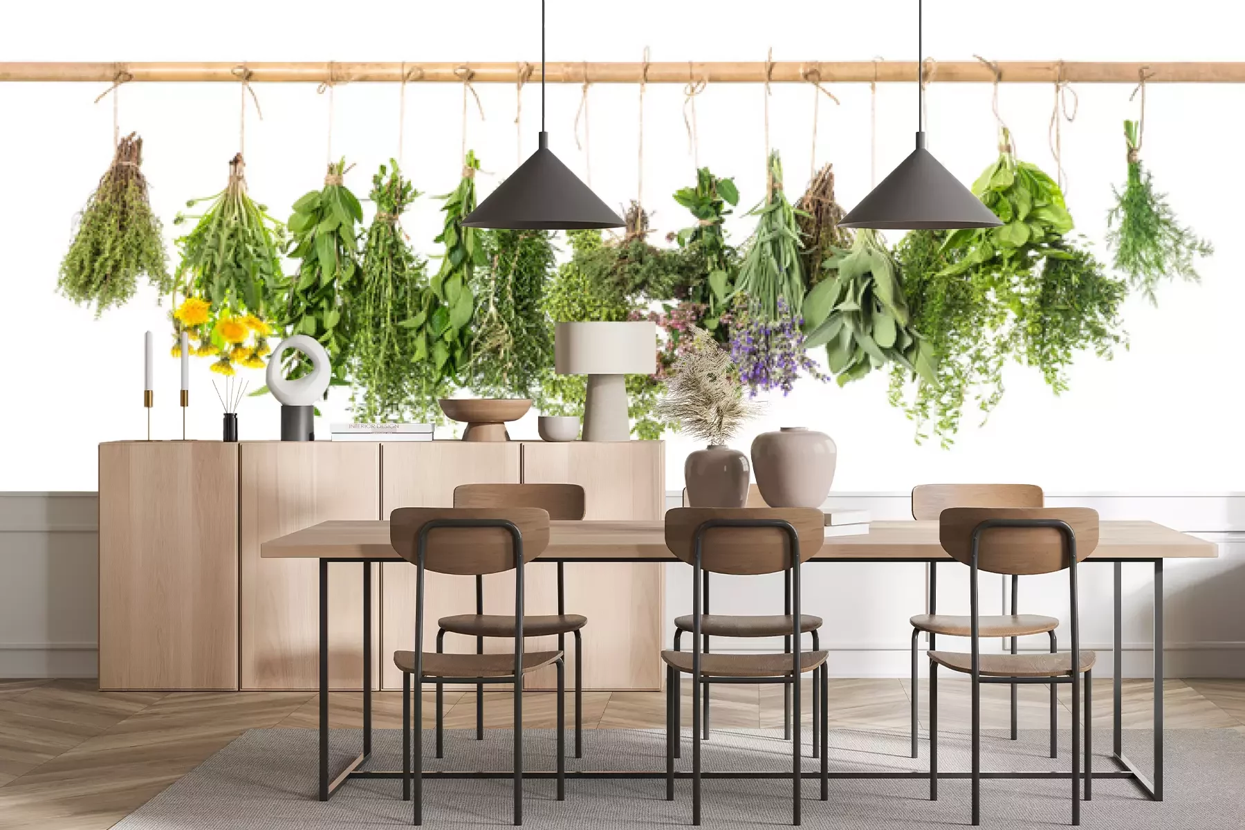Grüne Kräutersträuße hängen an einem ZweigFototapete