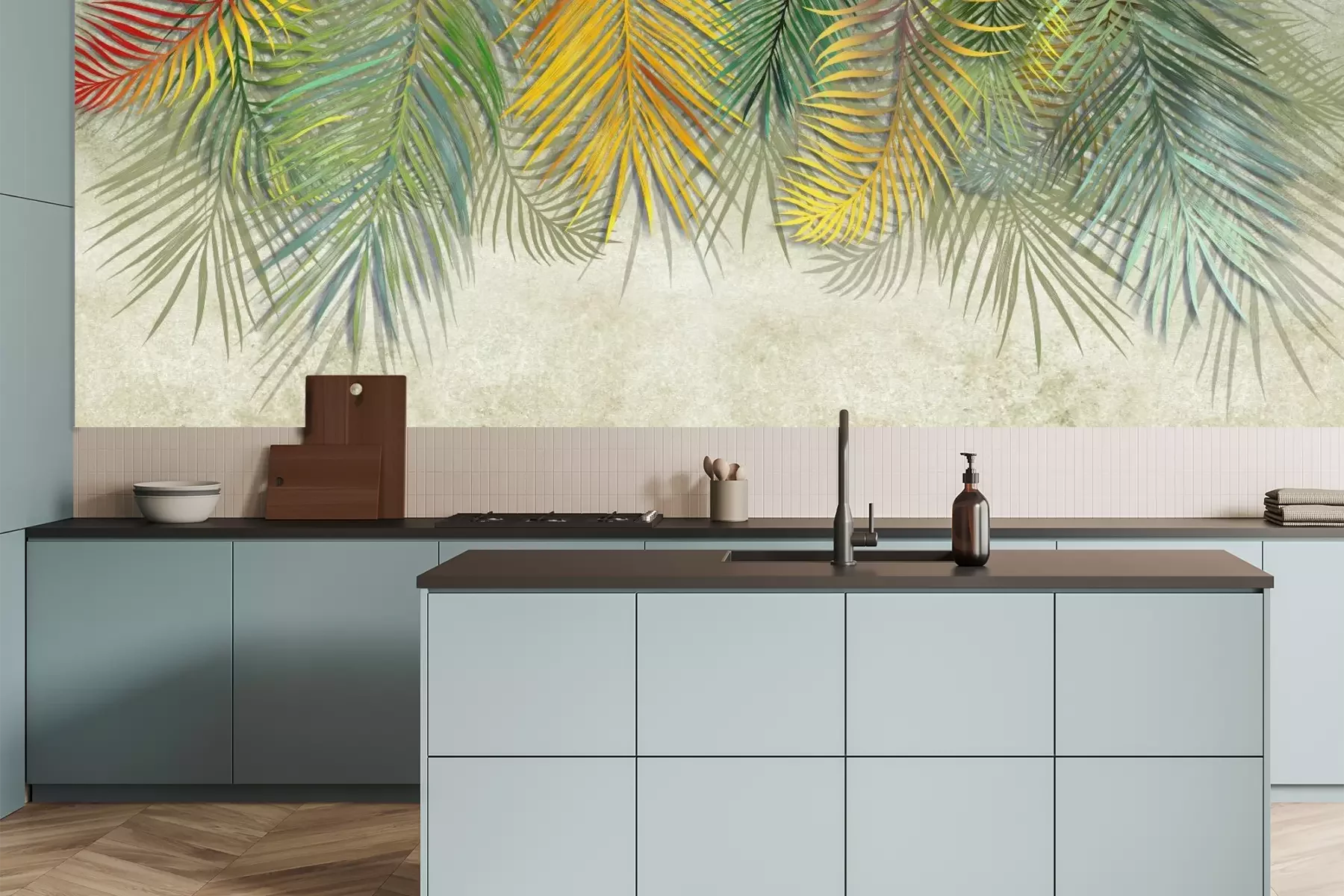 Das Material Premium+ besteht aus einer strukturierten Vinyl-Oberschicht und einem Trägermaterial (Vlies) mit einer Grammatur von 255 g/m², das kleine Unebenheiten der Wand zuverlässig kaschiert. Die feine Sandstruktur verleiht der Oberfläche eine luxuriöse Haptik, während das halbmatte Finish die Tiefe der Farben betont. Das Material ist dampfdurchlässig – so kann diese Fototapete auch in Küchen und Badezimmern eingesetzt werden. Die maximale Breite einer Tapetenbahn beträgt 100 cm. Bei größeren Abmessungen besteht die Fototapete aus mehreren gleich großen Bahnen. Der Kleber wird direkt auf die Wand aufgetragen, und die Fototapete wird auf Stoß angebracht, was für einen ästhetischen Effekt ohne sichtbare Fugen sorgt. Die Oberfläche ist pflegeleicht und kann bei Bedarf sanft mit einem feuchten Tuch abgewischt werden.