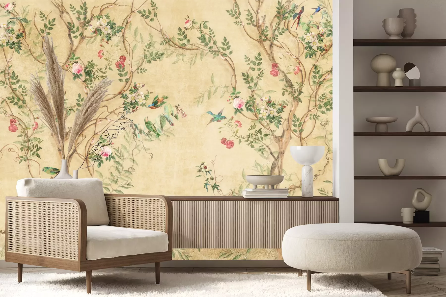 Das Material Premium+ besteht aus einer strukturierten Vinyl-Oberschicht und einem Trägermaterial (Vlies) mit einer Grammatur von 255 g/m², das kleine Unebenheiten der Wand zuverlässig kaschiert. Die feine Sandstruktur verleiht der Oberfläche eine luxuriöse Haptik, während das halbmatte Finish die Tiefe der Farben betont. Das Material ist dampfdurchlässig – so kann diese Fototapete auch in Küchen und Badezimmern eingesetzt werden. Die maximale Breite einer Tapetenbahn beträgt 100 cm. Bei größeren Abmessungen besteht die Fototapete aus mehreren gleich großen Bahnen. Der Kleber wird direkt auf die Wand aufgetragen, und die Fototapete wird auf Stoß angebracht, was für einen ästhetischen Effekt ohne sichtbare Fugen sorgt. Die Oberfläche ist pflegeleicht und kann bei Bedarf sanft mit einem feuchten Tuch abgewischt werden.