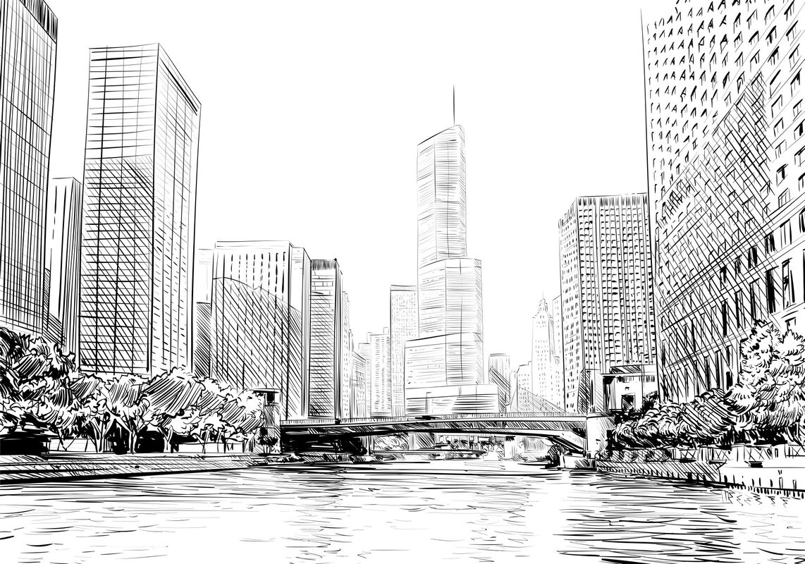 Fototapete: Chicago-Panorama schwarz-weiße Zeichnung mit Wolkenkratzern und Fluss