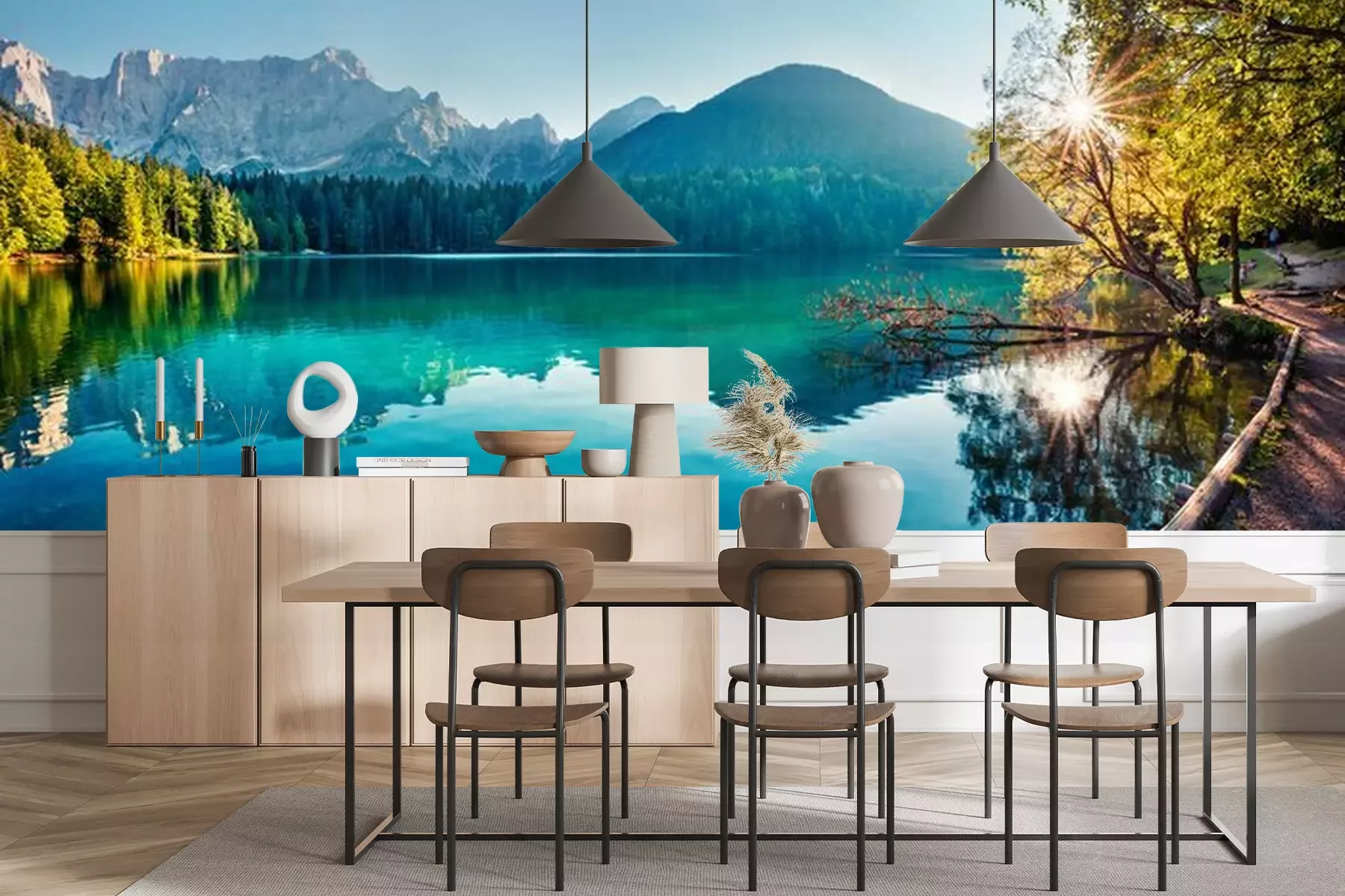 Das Material Premium+ besteht aus einer strukturierten Vinyl-Oberschicht und einem Trägermaterial (Vlies) mit einer Grammatur von 255 g/m², das kleine Unebenheiten der Wand zuverlässig kaschiert. Die feine Sandstruktur verleiht der Oberfläche eine luxuriöse Haptik, während das halbmatte Finish die Tiefe der Farben betont. Das Material ist dampfdurchlässig – so kann diese Fototapete auch in Küchen und Badezimmern eingesetzt werden. Die maximale Breite einer Tapetenbahn beträgt 100 cm. Bei größeren Abmessungen besteht die Fototapete aus mehreren gleich großen Bahnen. Der Kleber wird direkt auf die Wand aufgetragen, und die Fototapete wird auf Stoß angebracht, was für einen ästhetischen Effekt ohne sichtbare Fugen sorgt. Die Oberfläche ist pflegeleicht und kann bei Bedarf sanft mit einem feuchten Tuch abgewischt werden.