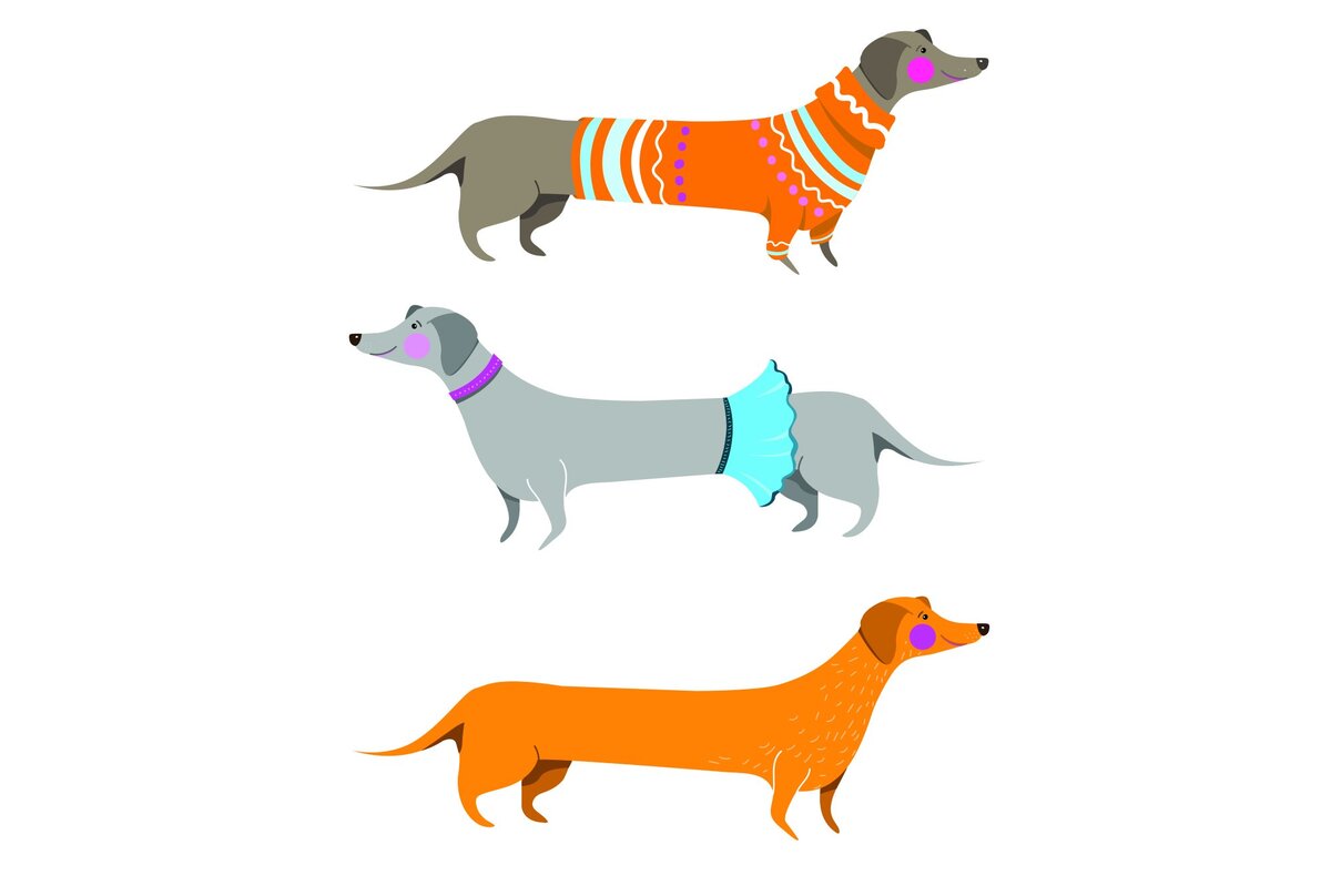 Fototapete: Dackel in Kleidung auf weißem Hintergrund