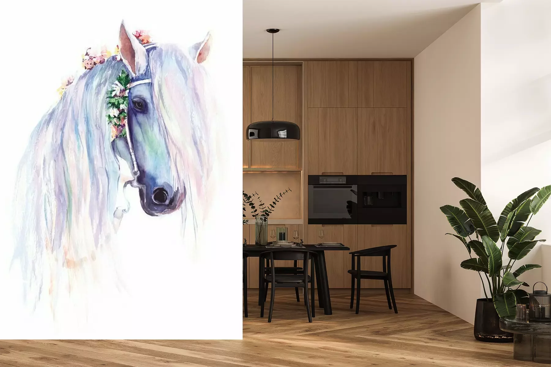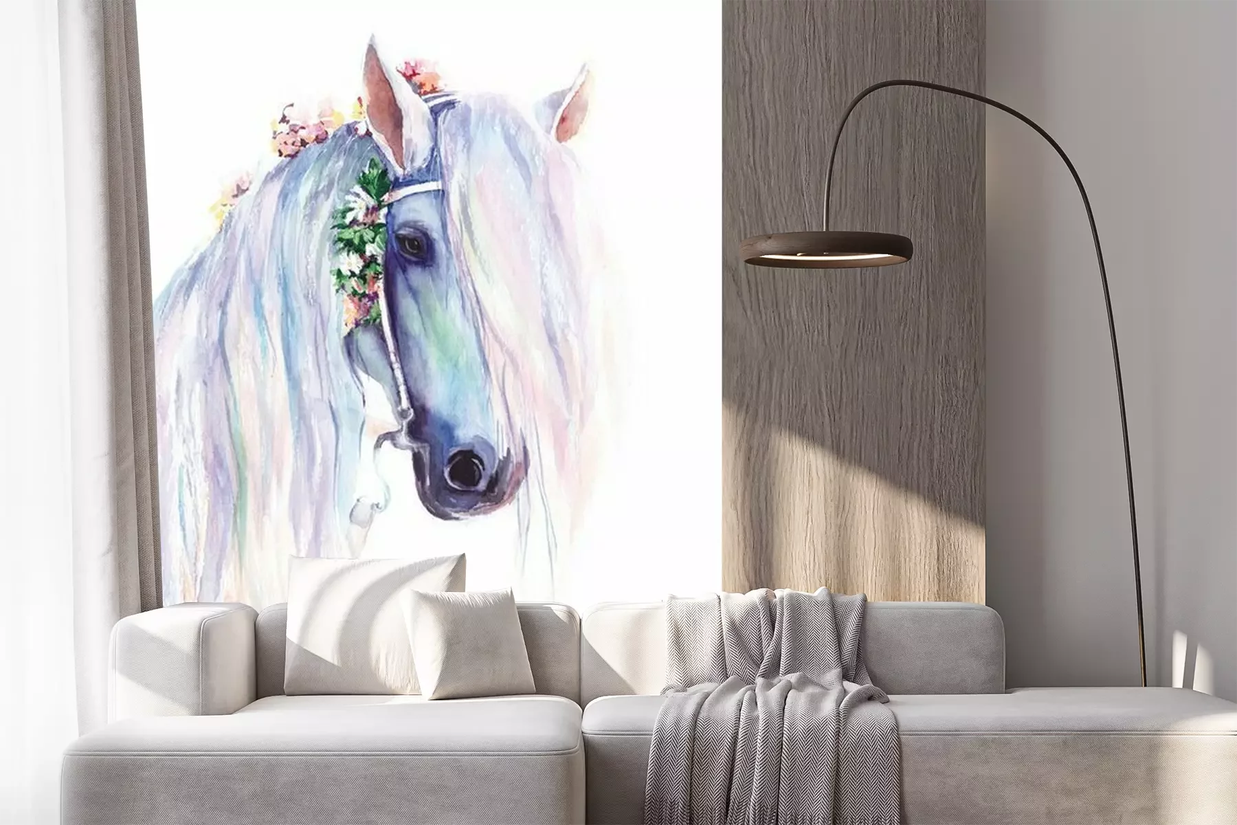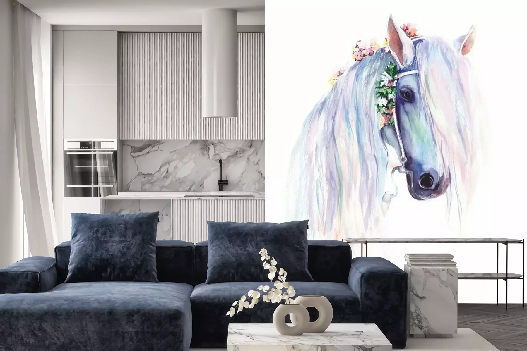 Fototapete Das blaue Pferd mit Blumen in der Mähne. Ursprüngliche Aquarellmalerei.