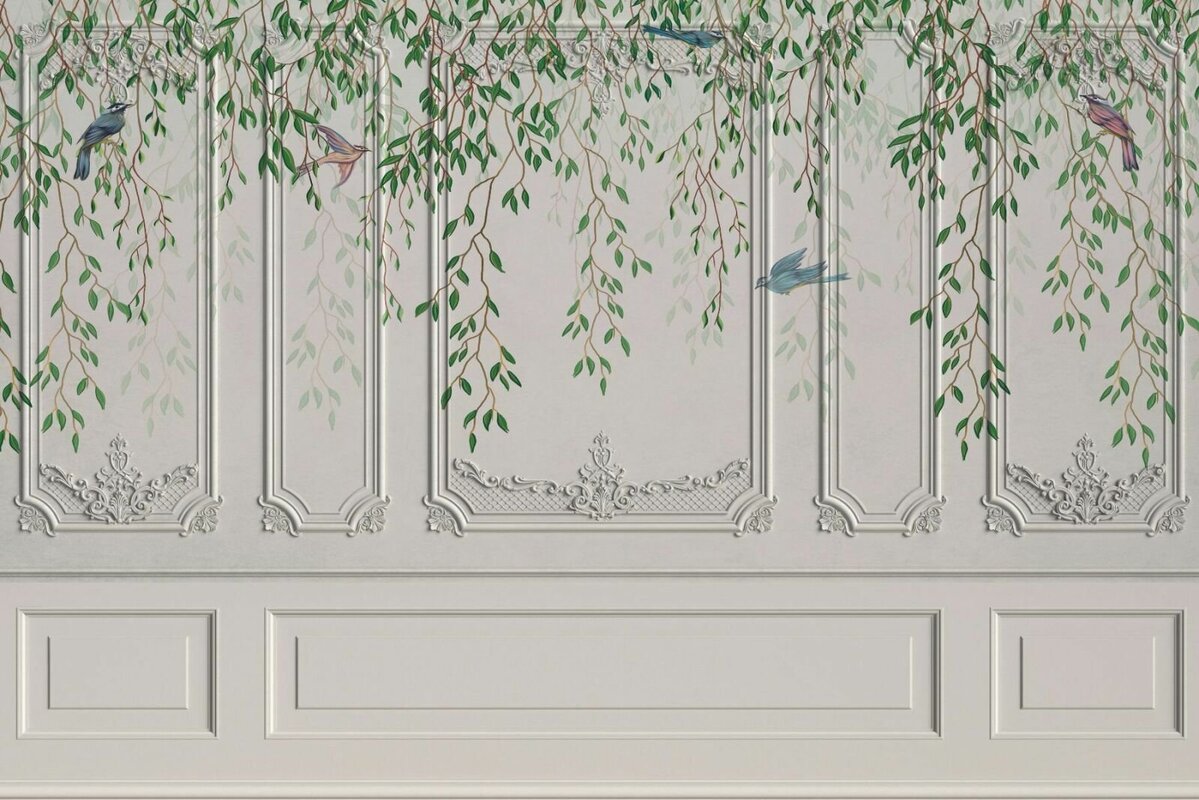 Dekorative wand mit vögeln und pflanzen