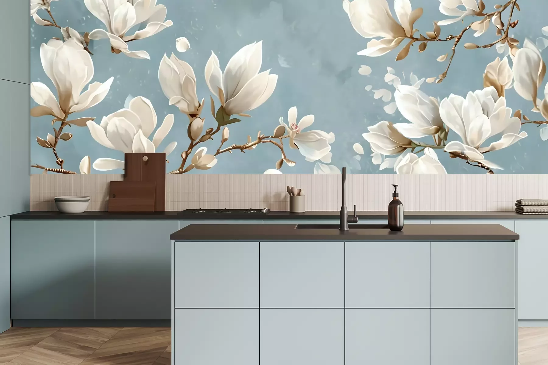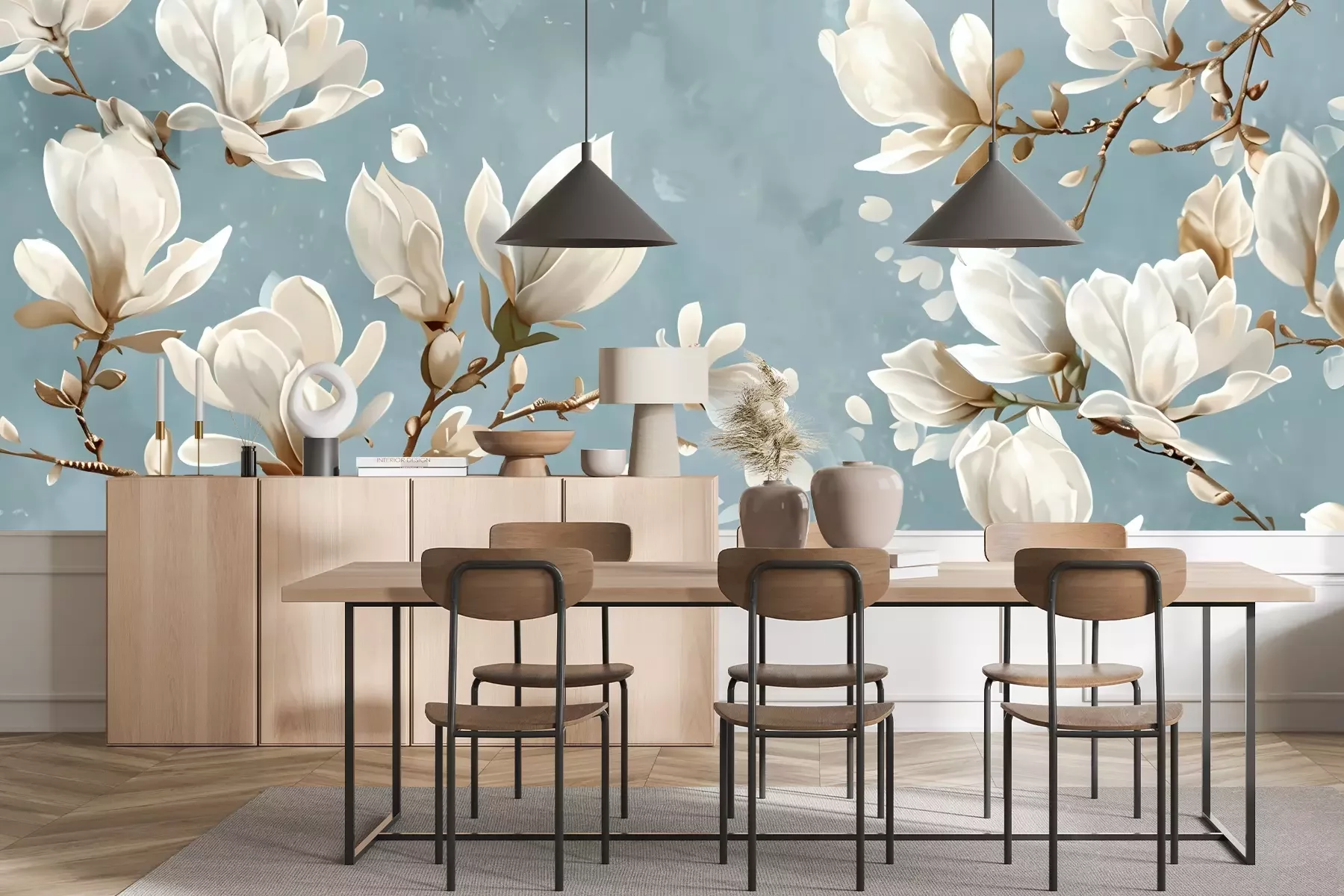 Das Material Premium+ besteht aus einer strukturierten Vinyl-Oberschicht und einem Trägermaterial (Vlies) mit einer Grammatur von 255 g/m², das kleine Unebenheiten der Wand zuverlässig kaschiert. Die feine Sandstruktur verleiht der Oberfläche eine luxuriöse Haptik, während das halbmatte Finish die Tiefe der Farben betont. Das Material ist dampfdurchlässig – so kann diese Fototapete auch in Küchen und Badezimmern eingesetzt werden. Die maximale Breite einer Tapetenbahn beträgt 100 cm. Bei größeren Abmessungen besteht die Fototapete aus mehreren gleich großen Bahnen. Der Kleber wird direkt auf die Wand aufgetragen, und die Fototapete wird auf Stoß angebracht, was für einen ästhetischen Effekt ohne sichtbare Fugen sorgt. Die Oberfläche ist pflegeleicht und kann bei Bedarf sanft mit einem feuchten Tuch abgewischt werden.