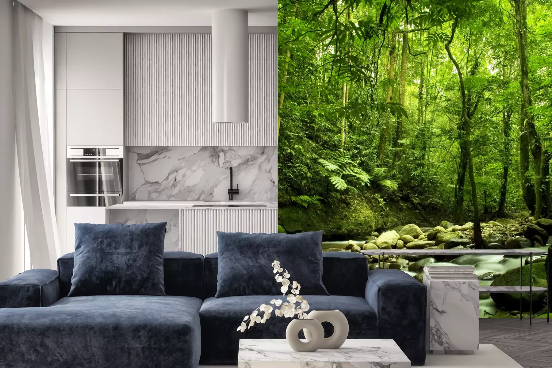 Das Material Premium+ besteht aus einer strukturierten Vinyl-Oberschicht und einem Trägermaterial (Vlies) mit einer Grammatur von 255 g/m², das kleine Unebenheiten der Wand zuverlässig kaschiert. Die feine Sandstruktur verleiht der Oberfläche eine luxuriöse Haptik, während das halbmatte Finish die Tiefe der Farben betont. Das Material ist dampfdurchlässig – so kann diese Fototapete auch in Küchen und Badezimmern eingesetzt werden. Die maximale Breite einer Tapetenbahn beträgt 100 cm. Bei größeren Abmessungen besteht die Fototapete aus mehreren gleich großen Bahnen. Der Kleber wird direkt auf die Wand aufgetragen, und die Fototapete wird auf Stoß angebracht, was für einen ästhetischen Effekt ohne sichtbare Fugen sorgt. Die Oberfläche ist pflegeleicht und kann bei Bedarf sanft mit einem feuchten Tuch abgewischt werden.