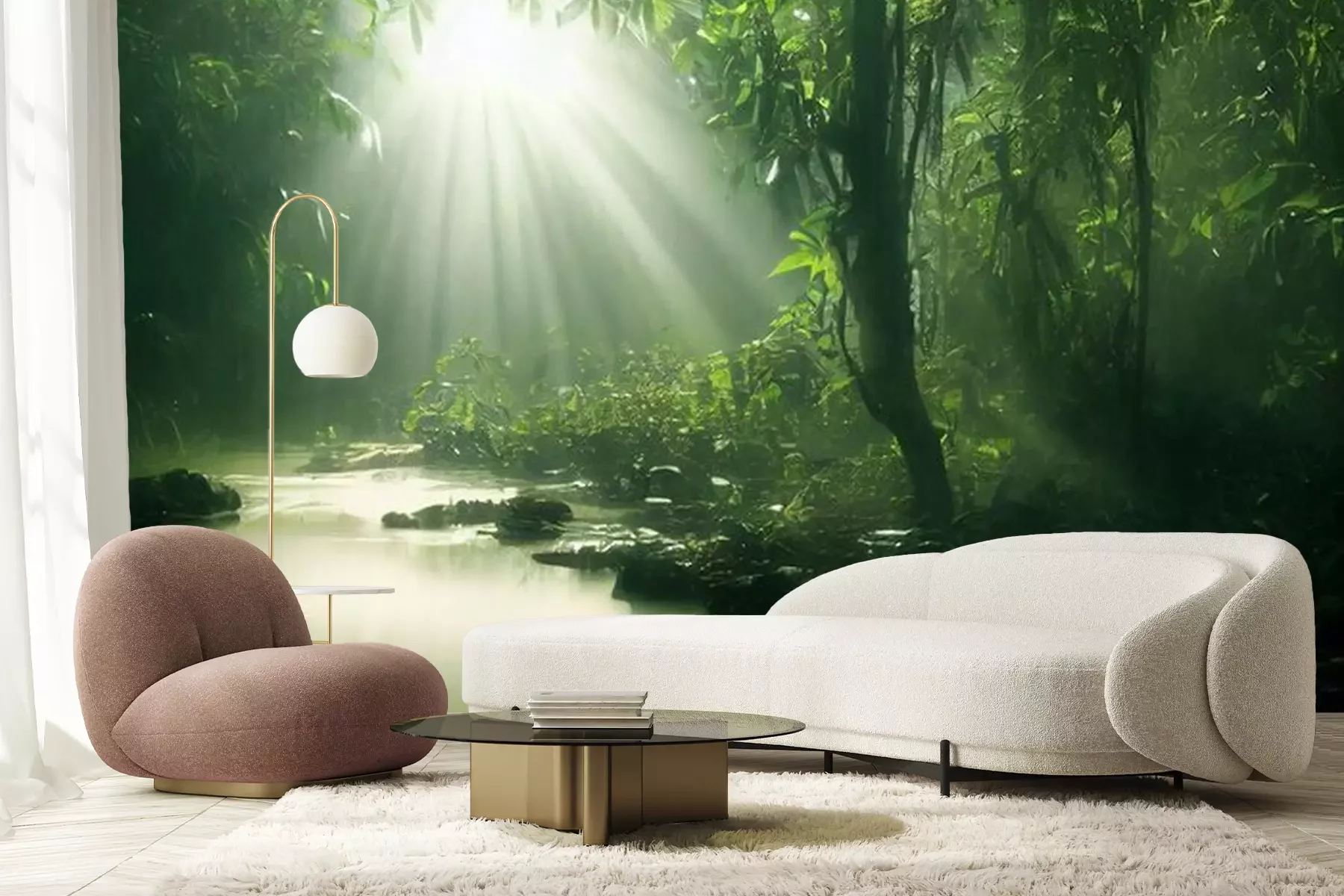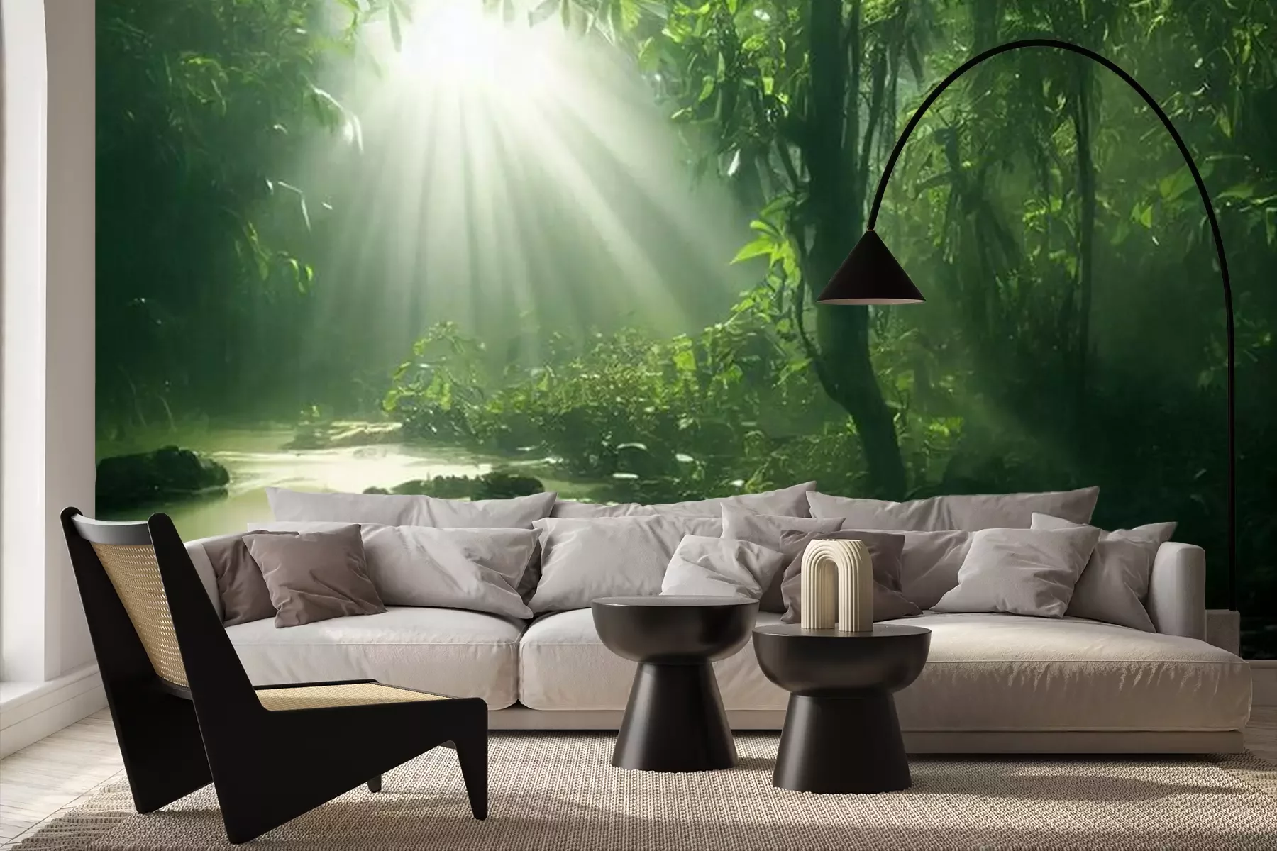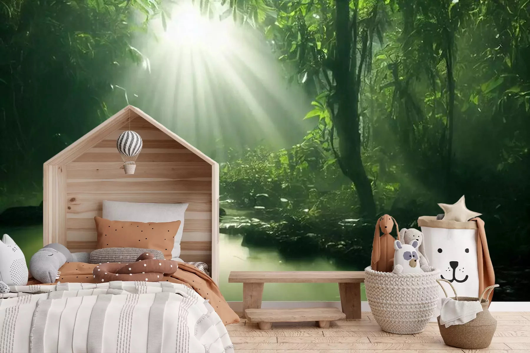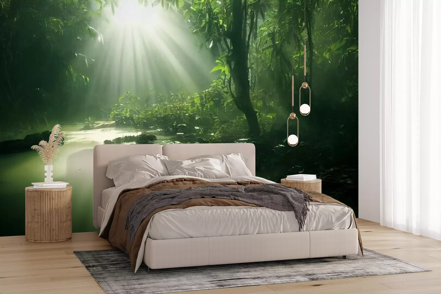 Fototapete Dunkelgrüner Wald in den Sonnenstrahlen