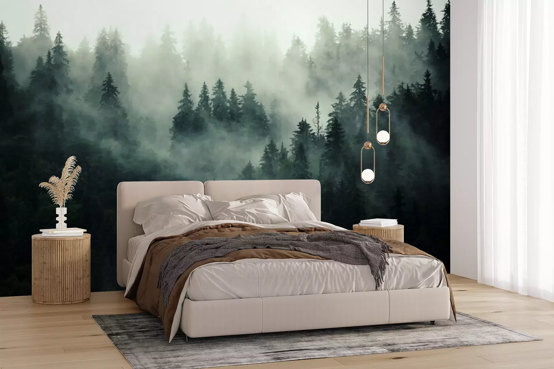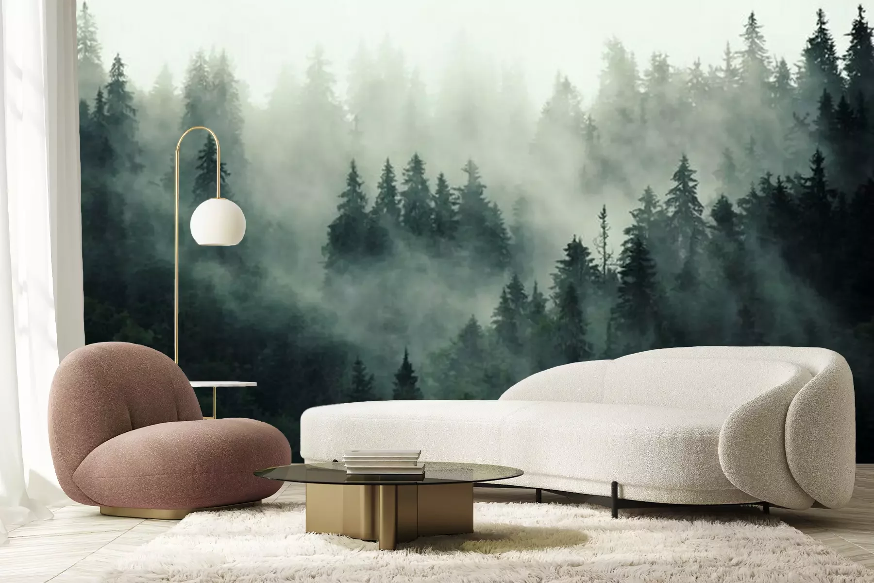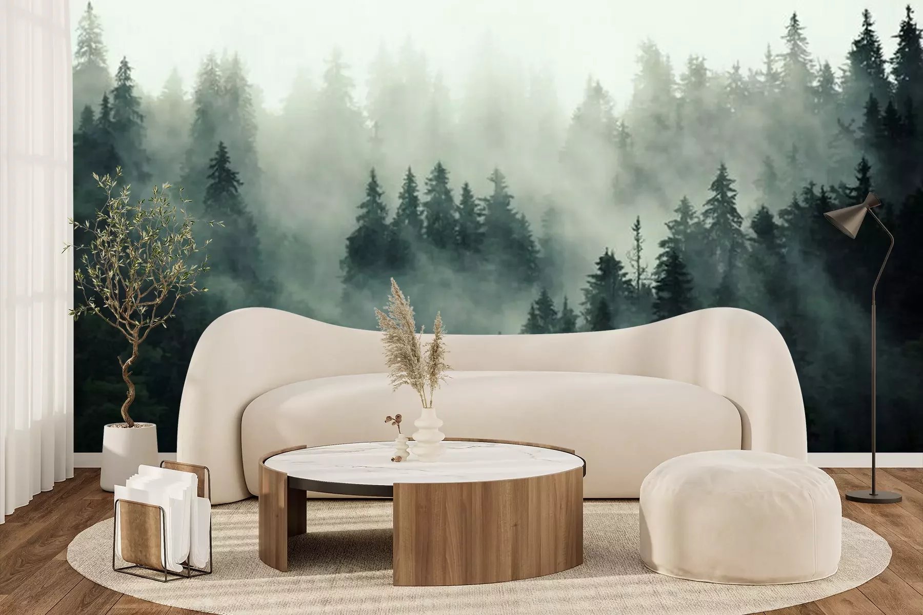 Rosa nebel über dem waldFototapete