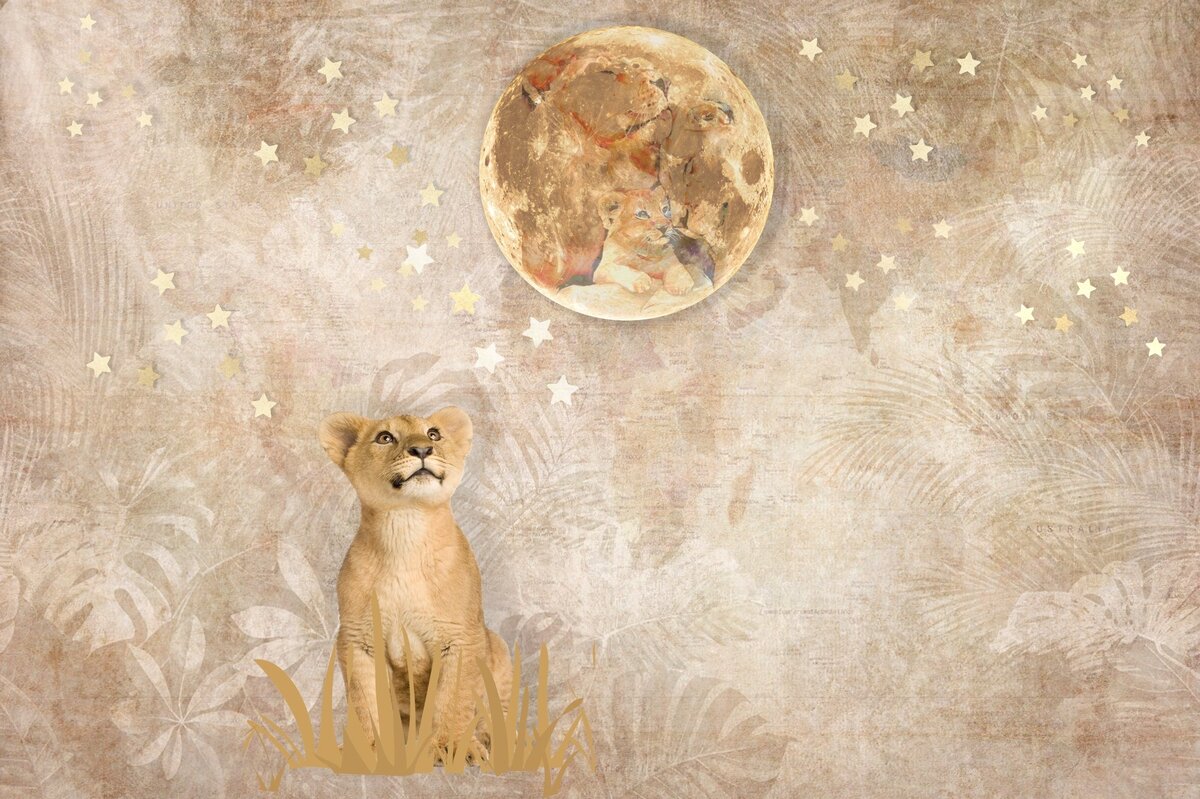 Fototapete: Ein kleiner Löwe und ein Vollmond auf einem Aquarellhintergrund