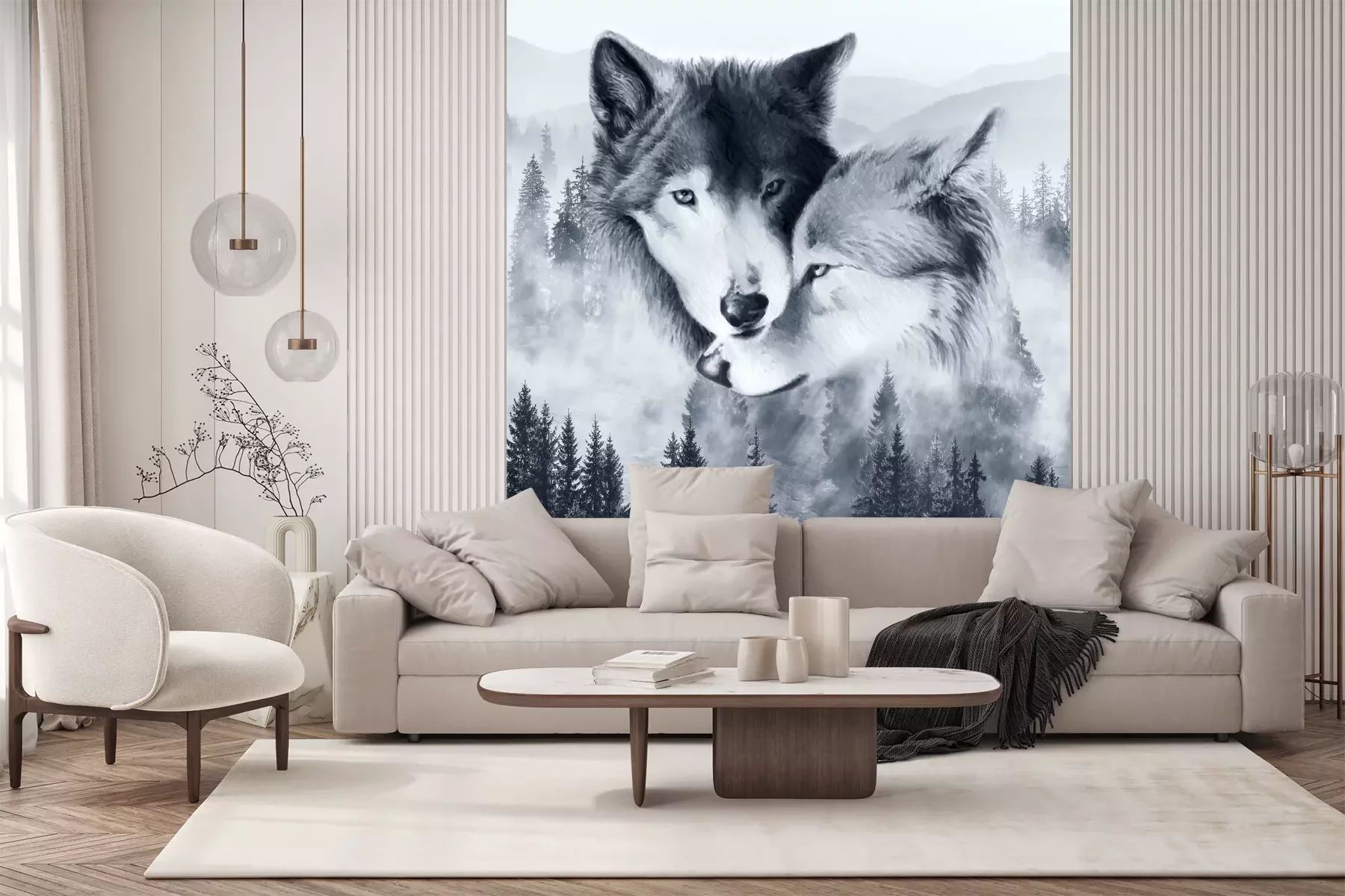 Die Fototapeten werden in Bahnen geliefert. Die Größe und die Anzahl der Bahnen, aus denen die gesamte Fototapete besteht, hängen vom gewählten Material ab. Wenn die Größe die maximale Breite des Materials überschreitet, besteht der Ausdruck aus mehreren gleich großen Bahnen.