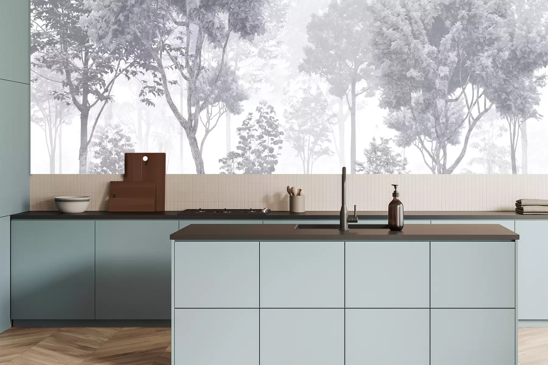 Das Material Premium+ besteht aus einer strukturierten Vinyl-Oberschicht und einem Trägermaterial (Vlies) mit einer Grammatur von 255 g/m², das kleine Unebenheiten der Wand zuverlässig kaschiert. Die feine Sandstruktur verleiht der Oberfläche eine luxuriöse Haptik, während das halbmatte Finish die Tiefe der Farben betont. Das Material ist dampfdurchlässig – so kann diese Fototapete auch in Küchen und Badezimmern eingesetzt werden. Die maximale Breite einer Tapetenbahn beträgt 100 cm. Bei größeren Abmessungen besteht die Fototapete aus mehreren gleich großen Bahnen. Der Kleber wird direkt auf die Wand aufgetragen, und die Fototapete wird auf Stoß angebracht, was für einen ästhetischen Effekt ohne sichtbare Fugen sorgt. Die Oberfläche ist pflegeleicht und kann bei Bedarf sanft mit einem feuchten Tuch abgewischt werden.