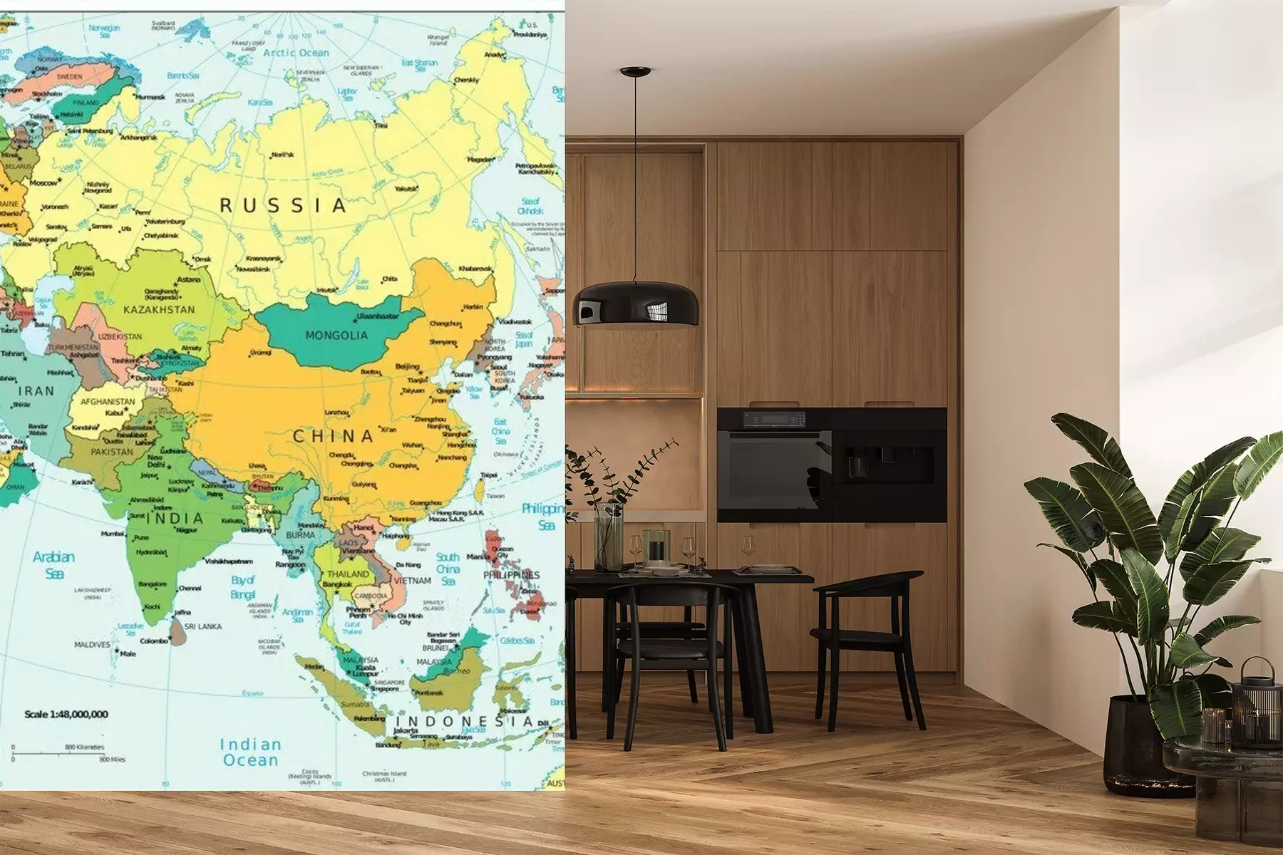 Das Material Premium+ besteht aus einer strukturierten Vinyl-Oberschicht und einem Trägermaterial (Vlies) mit einer Grammatur von 255 g/m², das kleine Unebenheiten der Wand zuverlässig kaschiert. Die feine Sandstruktur verleiht der Oberfläche eine luxuriöse Haptik, während das halbmatte Finish die Tiefe der Farben betont. Das Material ist dampfdurchlässig – so kann diese Fototapete auch in Küchen und Badezimmern eingesetzt werden. Die maximale Breite einer Tapetenbahn beträgt 100 cm. Bei größeren Abmessungen besteht die Fototapete aus mehreren gleich großen Bahnen. Der Kleber wird direkt auf die Wand aufgetragen, und die Fototapete wird auf Stoß angebracht, was für einen ästhetischen Effekt ohne sichtbare Fugen sorgt. Die Oberfläche ist pflegeleicht und kann bei Bedarf sanft mit einem feuchten Tuch abgewischt werden.