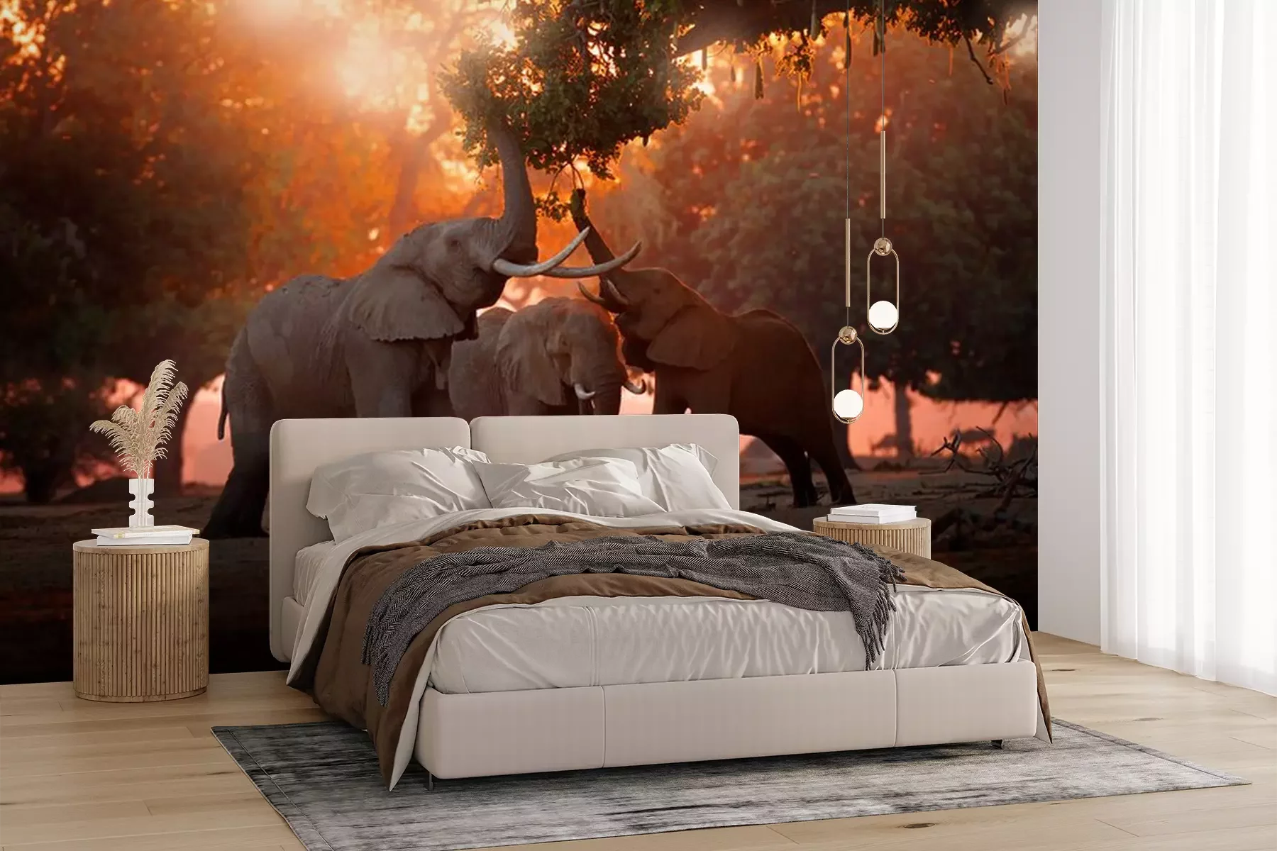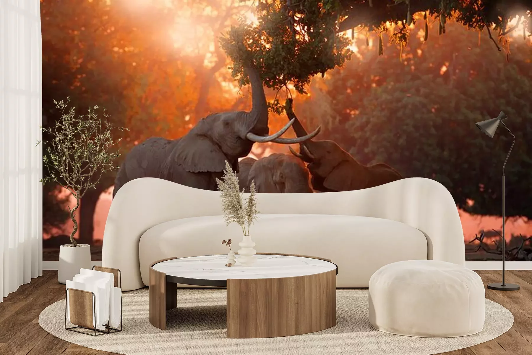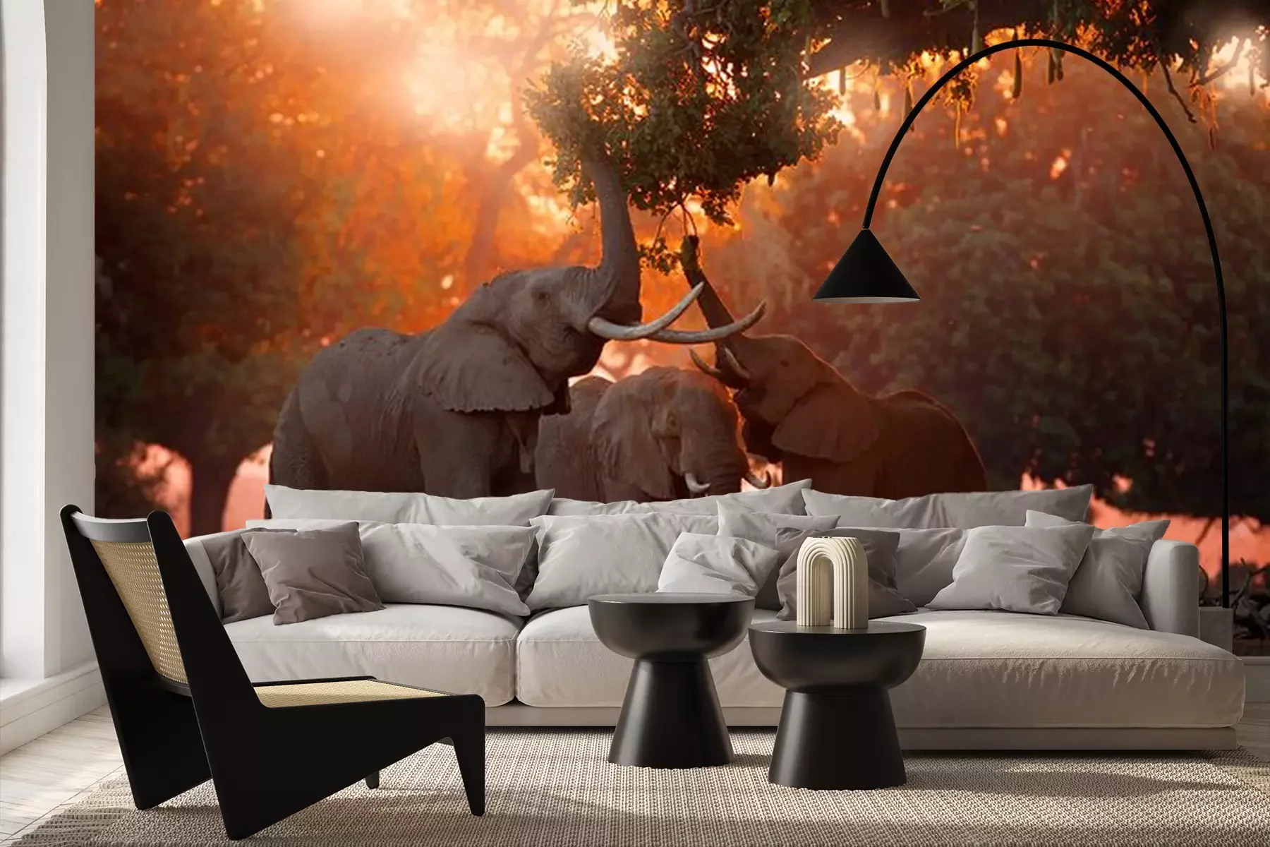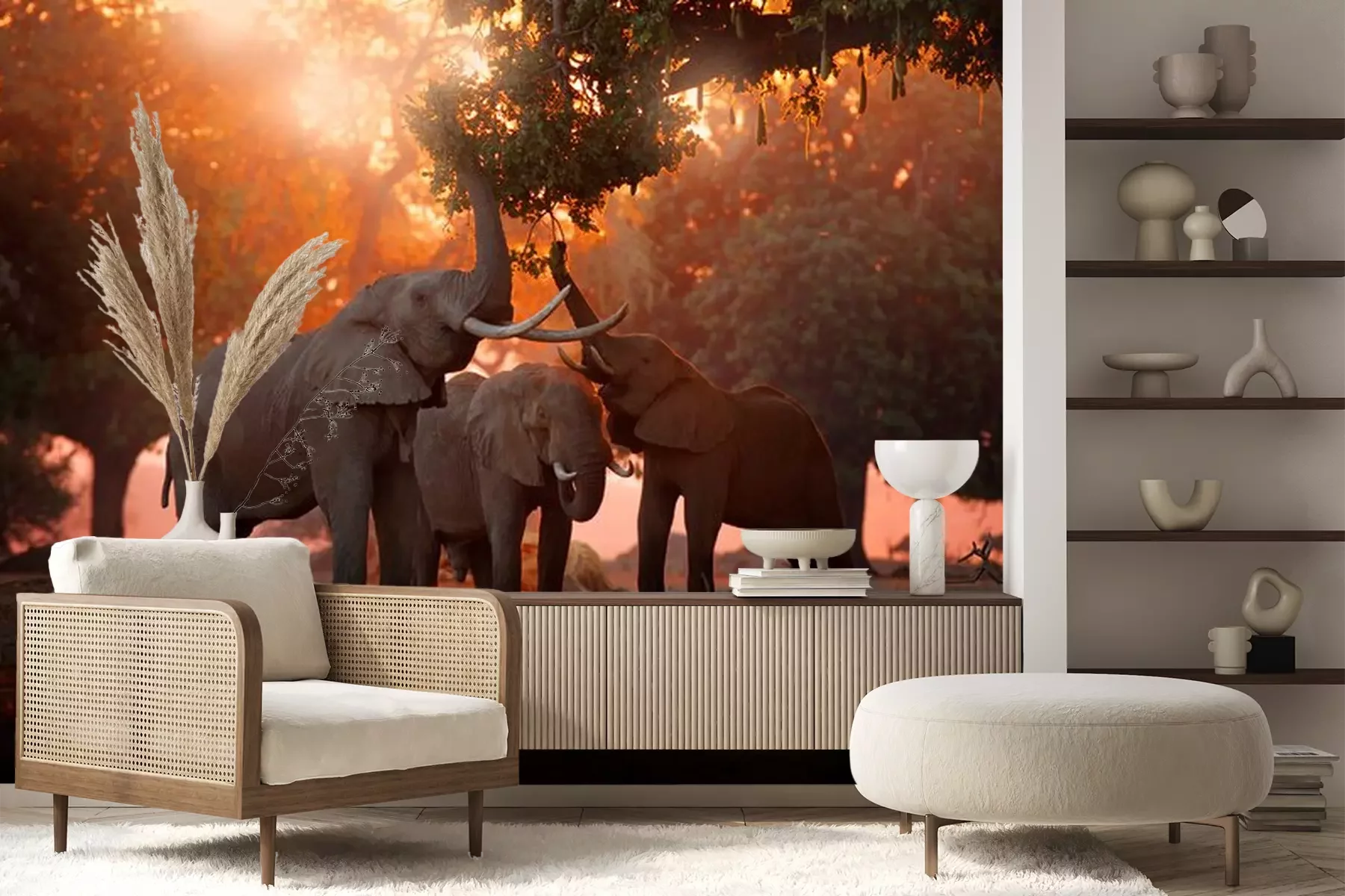 Fototapete Elefanten vor einem orangefarbenen Himmel