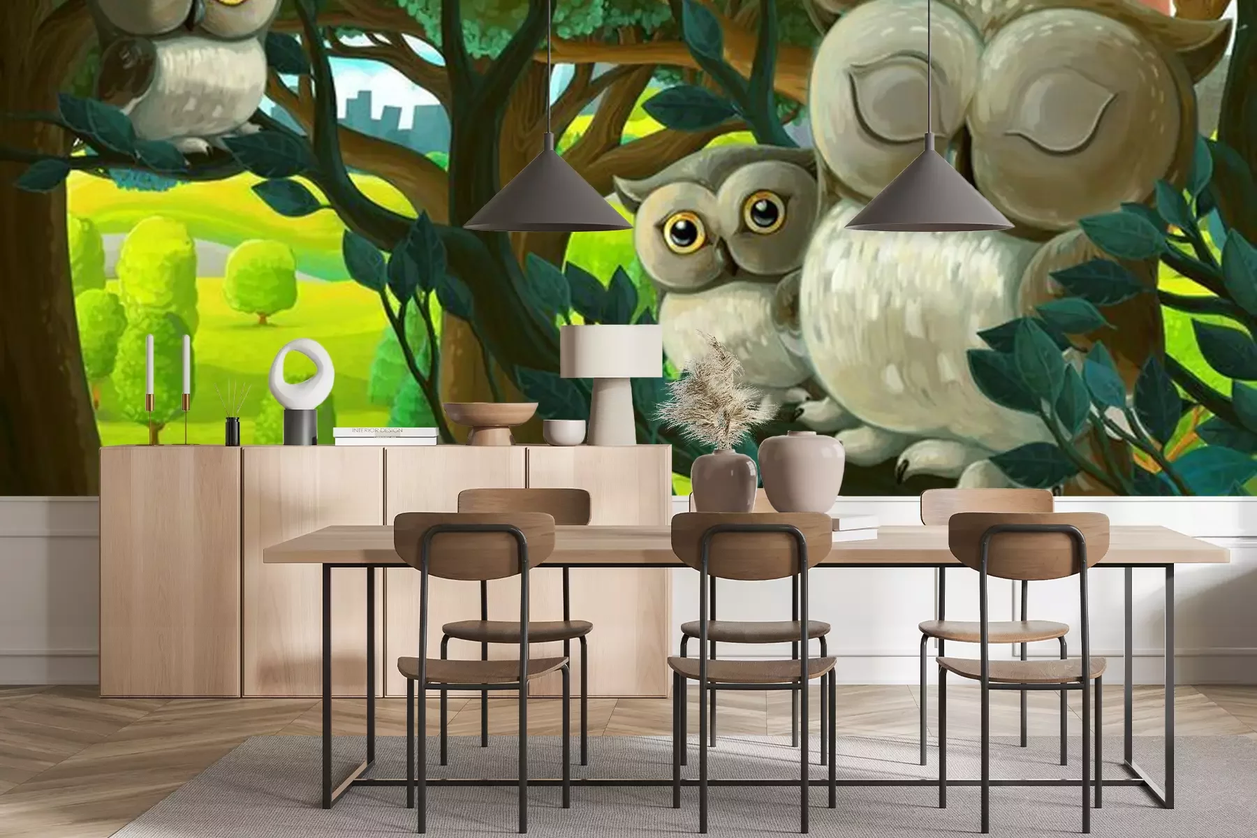 Fototapete Eulen wie aus dem Cartoon auf einem Ast sitzend