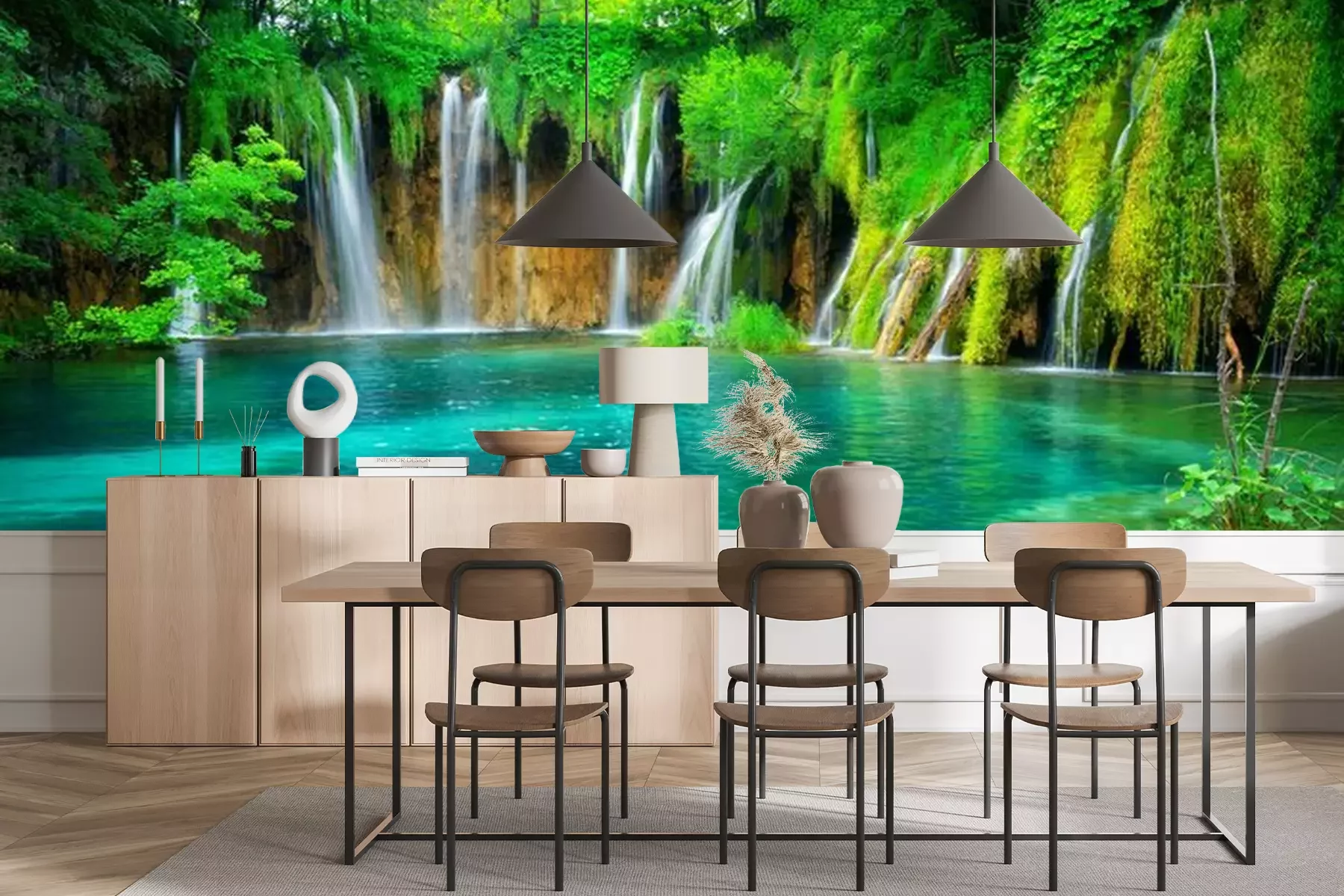 Das Material Premium+ besteht aus einer strukturierten Vinyl-Oberschicht und einem Trägermaterial (Vlies) mit einer Grammatur von 255 g/m², das kleine Unebenheiten der Wand zuverlässig kaschiert. Die feine Sandstruktur verleiht der Oberfläche eine luxuriöse Haptik, während das halbmatte Finish die Tiefe der Farben betont. Das Material ist dampfdurchlässig – so kann diese Fototapete auch in Küchen und Badezimmern eingesetzt werden. Die maximale Breite einer Tapetenbahn beträgt 100 cm. Bei größeren Abmessungen besteht die Fototapete aus mehreren gleich großen Bahnen. Der Kleber wird direkt auf die Wand aufgetragen, und die Fototapete wird auf Stoß angebracht, was für einen ästhetischen Effekt ohne sichtbare Fugen sorgt. Die Oberfläche ist pflegeleicht und kann bei Bedarf sanft mit einem feuchten Tuch abgewischt werden.