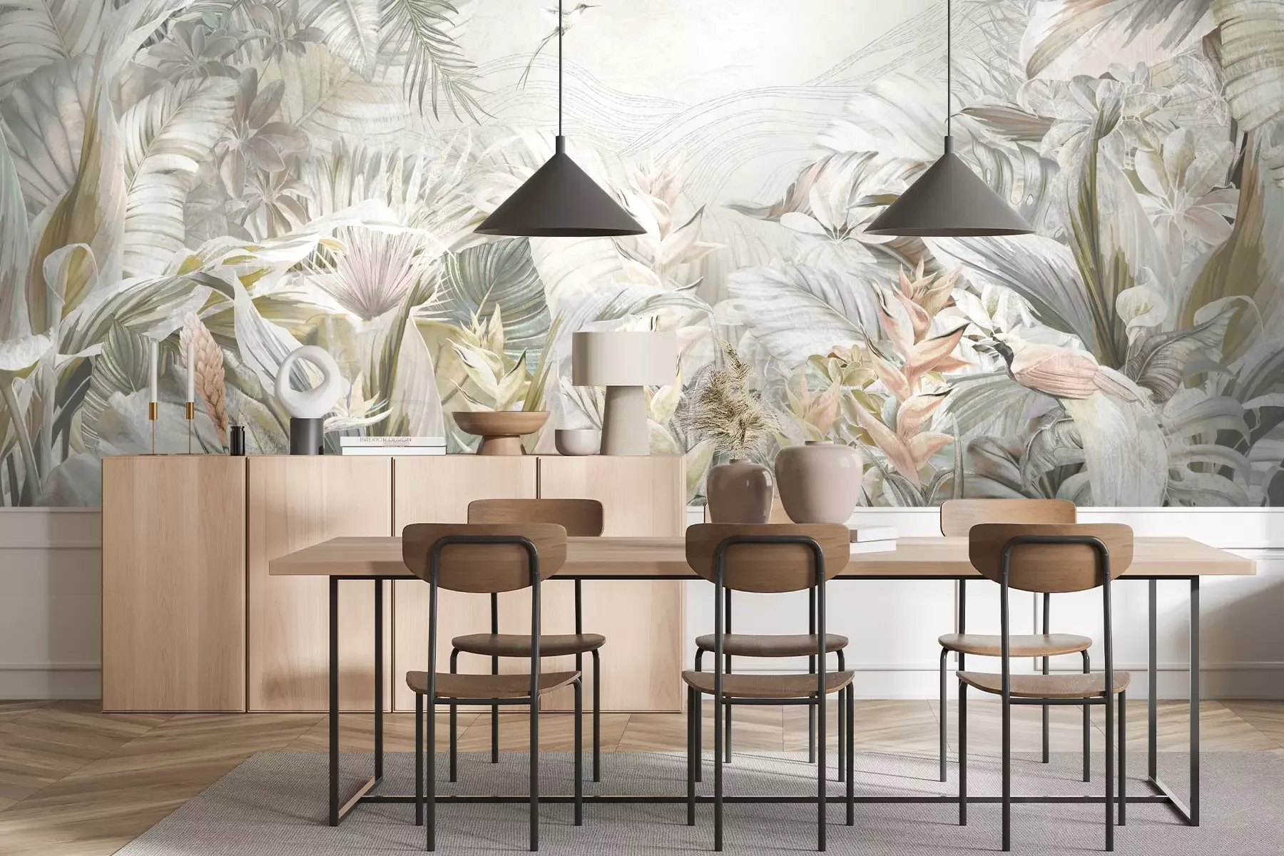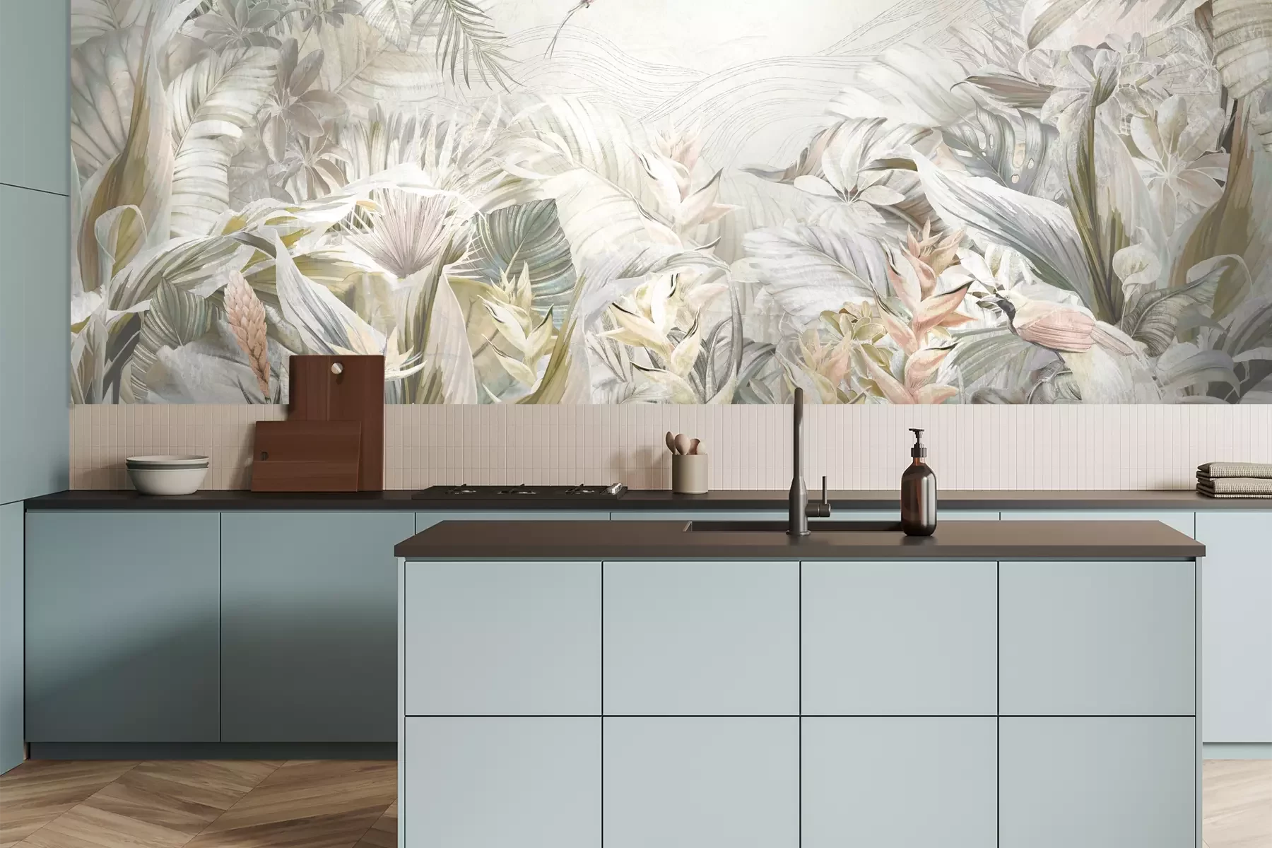 Das Material Premium+ besteht aus einer strukturierten Vinyl-Oberschicht und einem Trägermaterial (Vlies) mit einer Grammatur von 255 g/m², das kleine Unebenheiten der Wand zuverlässig kaschiert. Die feine Sandstruktur verleiht der Oberfläche eine luxuriöse Haptik, während das halbmatte Finish die Tiefe der Farben betont. Das Material ist dampfdurchlässig – so kann diese Fototapete auch in Küchen und Badezimmern eingesetzt werden. Die maximale Breite einer Tapetenbahn beträgt 100 cm. Bei größeren Abmessungen besteht die Fototapete aus mehreren gleich großen Bahnen. Der Kleber wird direkt auf die Wand aufgetragen, und die Fototapete wird auf Stoß angebracht, was für einen ästhetischen Effekt ohne sichtbare Fugen sorgt. Die Oberfläche ist pflegeleicht und kann bei Bedarf sanft mit einem feuchten Tuch abgewischt werden.