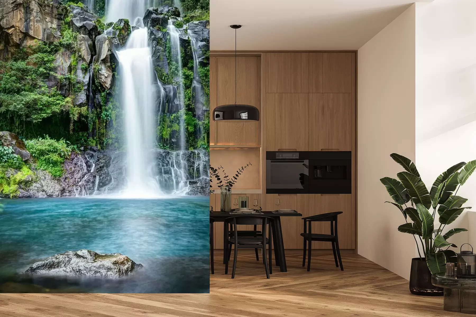 Das Material Premium+ besteht aus einer strukturierten Vinyl-Oberschicht und einem Trägermaterial (Vlies) mit einer Grammatur von 255 g/m², das kleine Unebenheiten der Wand zuverlässig kaschiert. Die feine Sandstruktur verleiht der Oberfläche eine luxuriöse Haptik, während das halbmatte Finish die Tiefe der Farben betont. Das Material ist dampfdurchlässig – so kann diese Fototapete auch in Küchen und Badezimmern eingesetzt werden. Die maximale Breite einer Tapetenbahn beträgt 100 cm. Bei größeren Abmessungen besteht die Fototapete aus mehreren gleich großen Bahnen. Der Kleber wird direkt auf die Wand aufgetragen, und die Fototapete wird auf Stoß angebracht, was für einen ästhetischen Effekt ohne sichtbare Fugen sorgt. Die Oberfläche ist pflegeleicht und kann bei Bedarf sanft mit einem feuchten Tuch abgewischt werden.