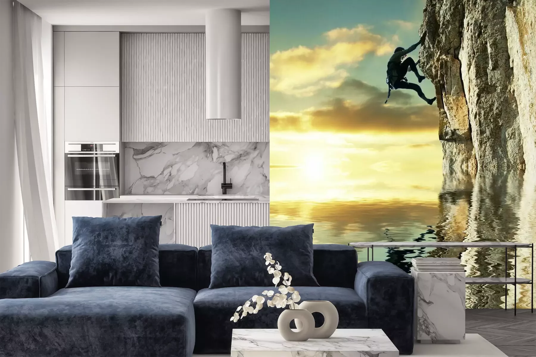 Das Material Premium+ besteht aus einer strukturierten Vinyl-Oberschicht und einem Trägermaterial (Vlies) mit einer Grammatur von 255 g/m², das kleine Unebenheiten der Wand zuverlässig kaschiert. Die feine Sandstruktur verleiht der Oberfläche eine luxuriöse Haptik, während das halbmatte Finish die Tiefe der Farben betont. Das Material ist dampfdurchlässig – so kann diese Fototapete auch in Küchen und Badezimmern eingesetzt werden. Die maximale Breite einer Tapetenbahn beträgt 100 cm. Bei größeren Abmessungen besteht die Fototapete aus mehreren gleich großen Bahnen. Der Kleber wird direkt auf die Wand aufgetragen, und die Fototapete wird auf Stoß angebracht, was für einen ästhetischen Effekt ohne sichtbare Fugen sorgt. Die Oberfläche ist pflegeleicht und kann bei Bedarf sanft mit einem feuchten Tuch abgewischt werden.