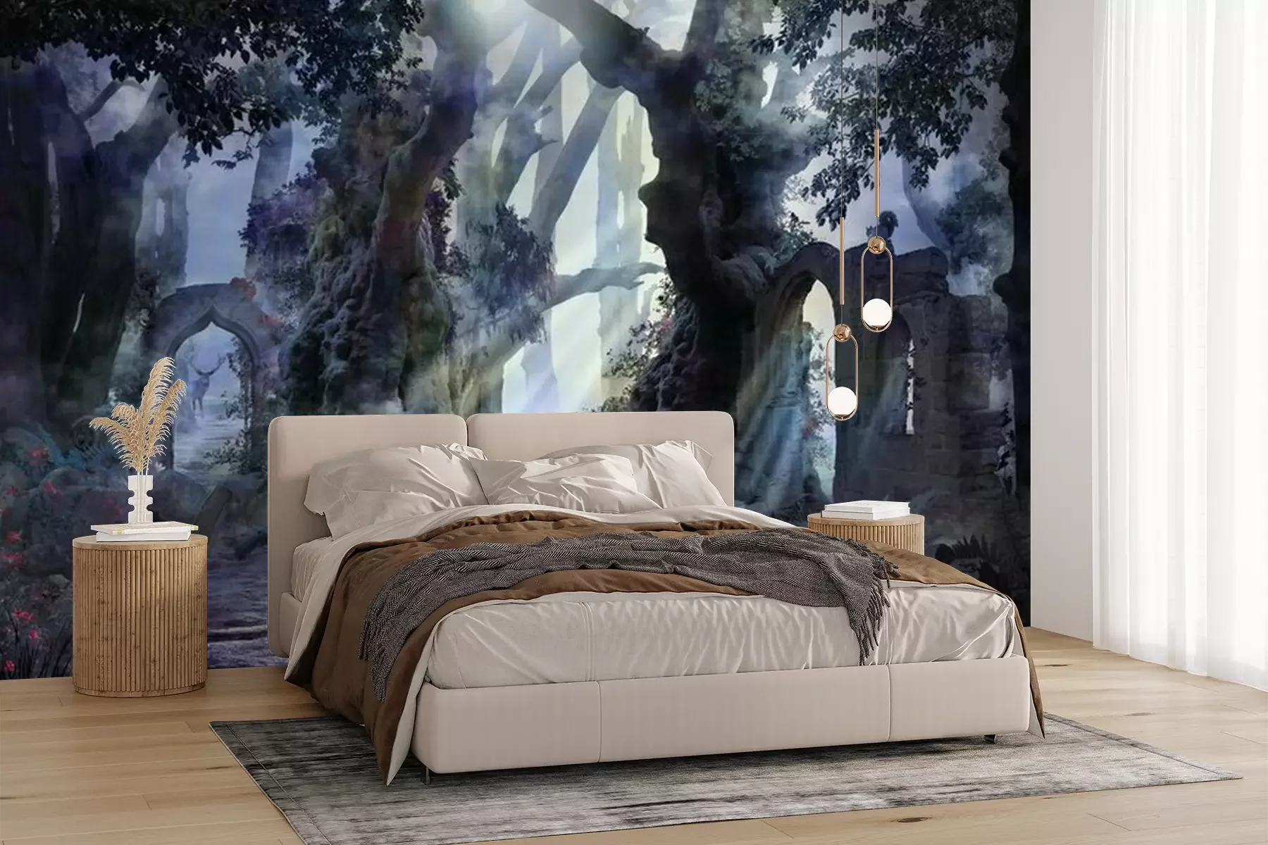 Das Material Premium+ besteht aus einer strukturierten Vinyl-Oberschicht und einem Trägermaterial (Vlies) mit einer Grammatur von 255 g/m², das kleine Unebenheiten der Wand zuverlässig kaschiert. Die feine Sandstruktur verleiht der Oberfläche eine luxuriöse Haptik, während das halbmatte Finish die Tiefe der Farben betont. Das Material ist dampfdurchlässig – so kann diese Fototapete auch in Küchen und Badezimmern eingesetzt werden. Die maximale Breite einer Tapetenbahn beträgt 100 cm. Bei größeren Abmessungen besteht die Fototapete aus mehreren gleich großen Bahnen. Der Kleber wird direkt auf die Wand aufgetragen, und die Fototapete wird auf Stoß angebracht, was für einen ästhetischen Effekt ohne sichtbare Fugen sorgt. Die Oberfläche ist pflegeleicht und kann bei Bedarf sanft mit einem feuchten Tuch abgewischt werden.
