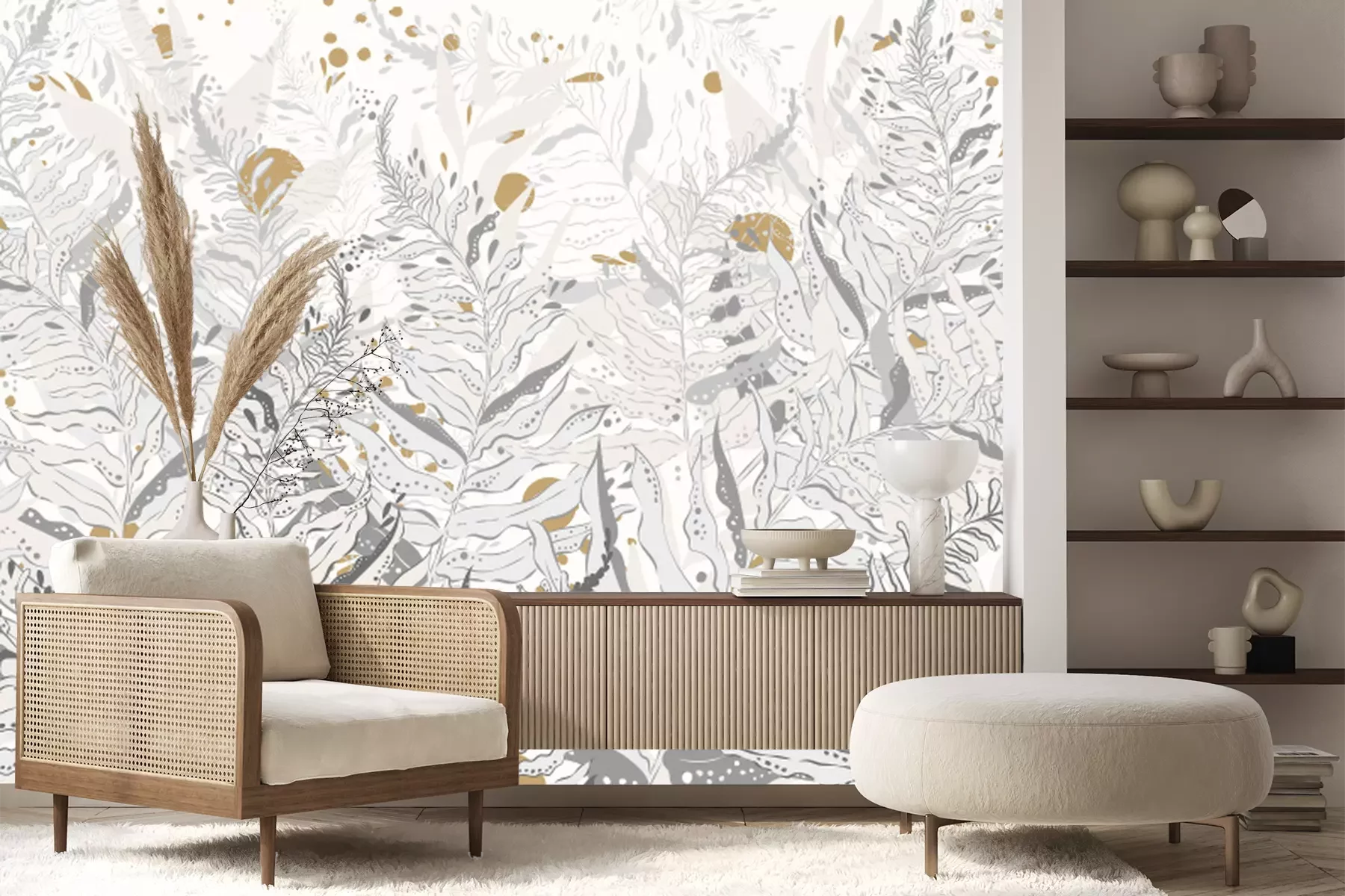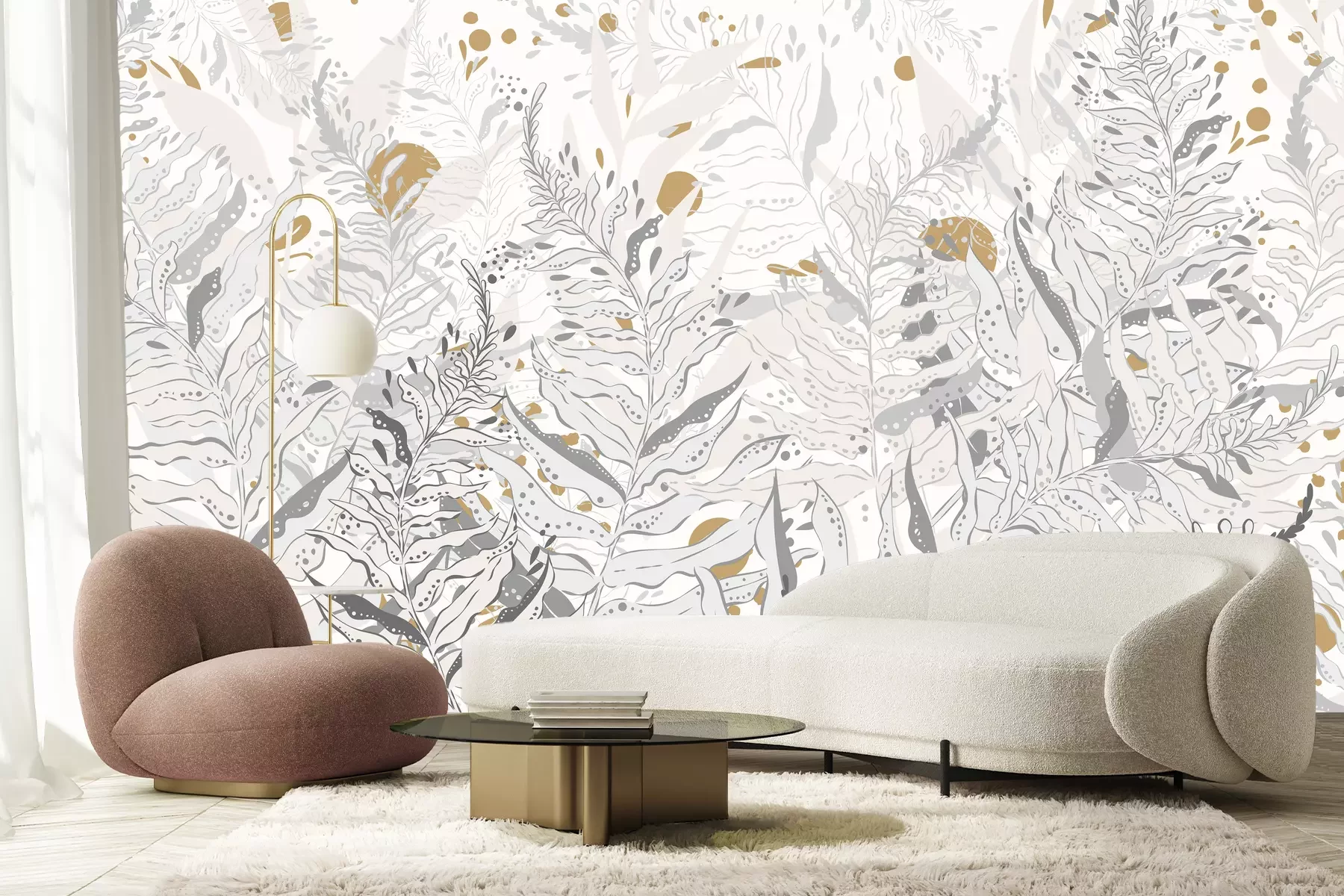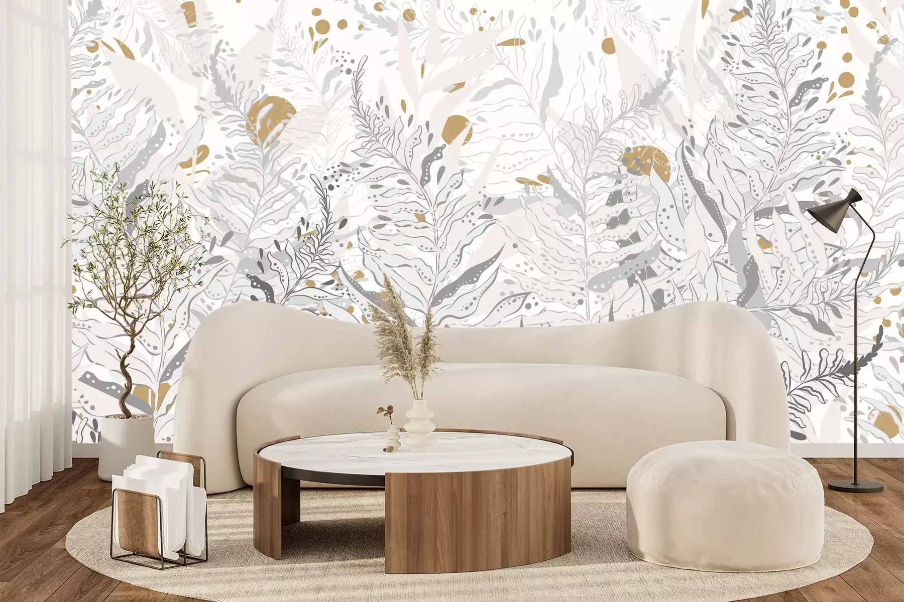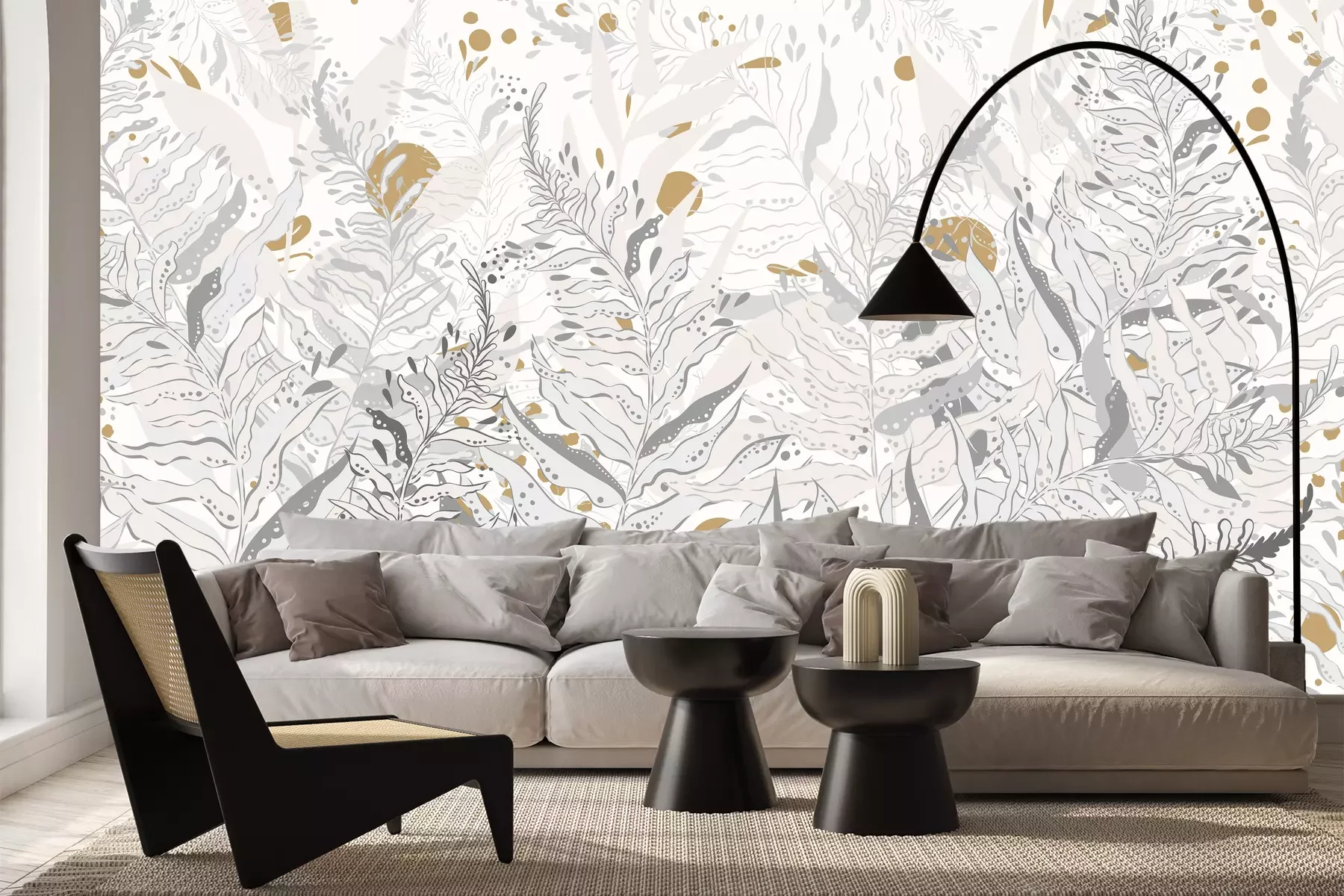 *Der Rabatt gilt nicht für Klebstoffe, Zubehör und Geschenkkarten.Wenn Sie auf der Suche nach einer Wanddekoration sind, die auffällig, zeitlos und universell ist, haben wir eine tolle Lösung für Sie: eine mit Pflanzen gefüllte Fototapete. Blätter sind ein äußerst interessantes Motiv, da sie in vielen verschiedenen Arrangements gut zur Geltung kommen. Zudem liegen von der Natur inspirierte Muster immer im Trend und sind daher eine perfekte Wahl, wenn Sie ein Element in Ihre Einrichtung integrieren möchten, das über viele Jahre hinweg die Augen der Bewohner erfreuen wird. Ein weiterer Vorteil dieser Fototapete? Pflanzen bringen die Natur ins Zuhause, so dass man sich der Natur näher fühlen kann, selbst wenn man in der Stadt wohnt. Dies ist ein einfacher Weg, um die Einrichtung nicht nur gemütlicher, sondern auch optisch ansprechender zu gestalten. Die Natur beruhigt die Sinne und hilft, sich zu entspannen. Daher ist ein solches Motiv an der Wand ein hervorragender Hintergrund für entspannte Momente im Wohn- oder Schlafzimmer. Dazu trägt auch die Farbgebung dieser Fototapete. Blätter sind in hellen Grautönen dargestellt, wodurch das Muster nicht zu einem Akzent wird, der um jeden Preis Aufmerksamkeit erregen will. Die Komposition wird durch senfgelbe Elemente bereichert, die wunderbar mit den Grautönen harmonieren. Eine großartige Idee ist es, Accessoires in diesem Farbton in die Einrichtung zu integrieren. Für welche Arrangements eignet sich eine solche Fototapete? Pflanzen passen perfekt zum Urban-Jungle-Stil. Ein solches Motiv bereichert einen modern eingerichteten Raum, und exotische Farne im Wohnraum lassen uns vergessen, dass draußen der Großstadtdschungel herrscht. Auch in minimalistischen Stylings präsentiert sich hervorragend eine solche Fototapete. Muster wird in einem sparsam eingerichteten Raum zum dominierenden Element und durchbricht den asketischen Charakter des Interieurs. So behält die Einrichtung ihren minimalistischen Charme, wirkt aber nicht leer und einfallslos. Die Farbgebung macht sie auch zu einem hervorragenden Deko-Akzent für eine Wohnung im industriellen Stil. In Kombination mit Betonwänden oder in Grau gestrichenen Wänden präsentiert sich toll eine solche Fototapete. Blätter öffnen den Loftraum zur Natur, aber so, dass das Ganze harmonisch wirkt.