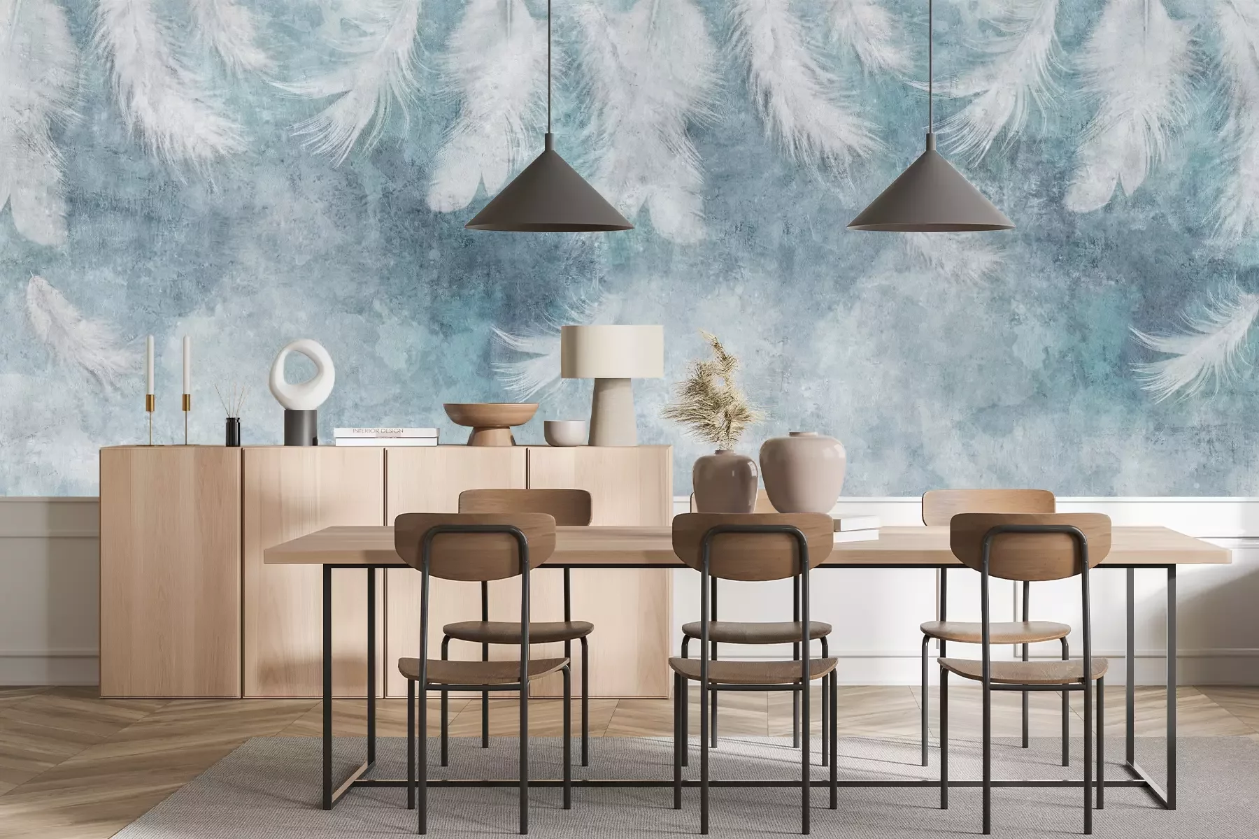 Das Material Premium+ besteht aus einer strukturierten Vinyl-Oberschicht und einem Trägermaterial (Vlies) mit einer Grammatur von 255 g/m², das kleine Unebenheiten der Wand zuverlässig kaschiert. Die feine Sandstruktur verleiht der Oberfläche eine luxuriöse Haptik, während das halbmatte Finish die Tiefe der Farben betont. Das Material ist dampfdurchlässig – so kann diese Fototapete auch in Küchen und Badezimmern eingesetzt werden. Die maximale Breite einer Tapetenbahn beträgt 100 cm. Bei größeren Abmessungen besteht die Fototapete aus mehreren gleich großen Bahnen. Der Kleber wird direkt auf die Wand aufgetragen, und die Fototapete wird auf Stoß angebracht, was für einen ästhetischen Effekt ohne sichtbare Fugen sorgt. Die Oberfläche ist pflegeleicht und kann bei Bedarf sanft mit einem feuchten Tuch abgewischt werden.