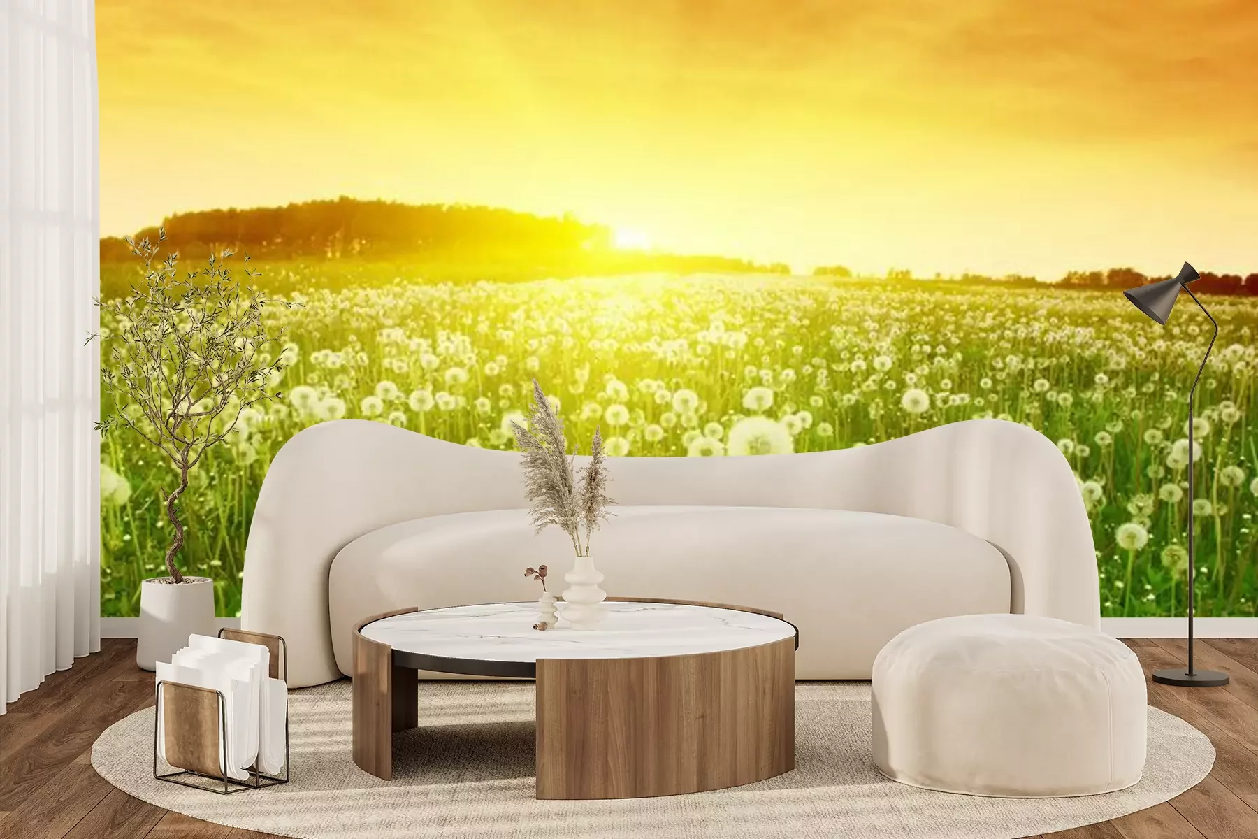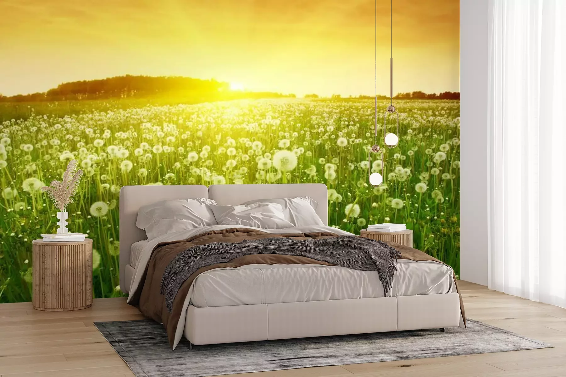 Fototapete Feld mit Löwenzahn bei Sonnenuntergang