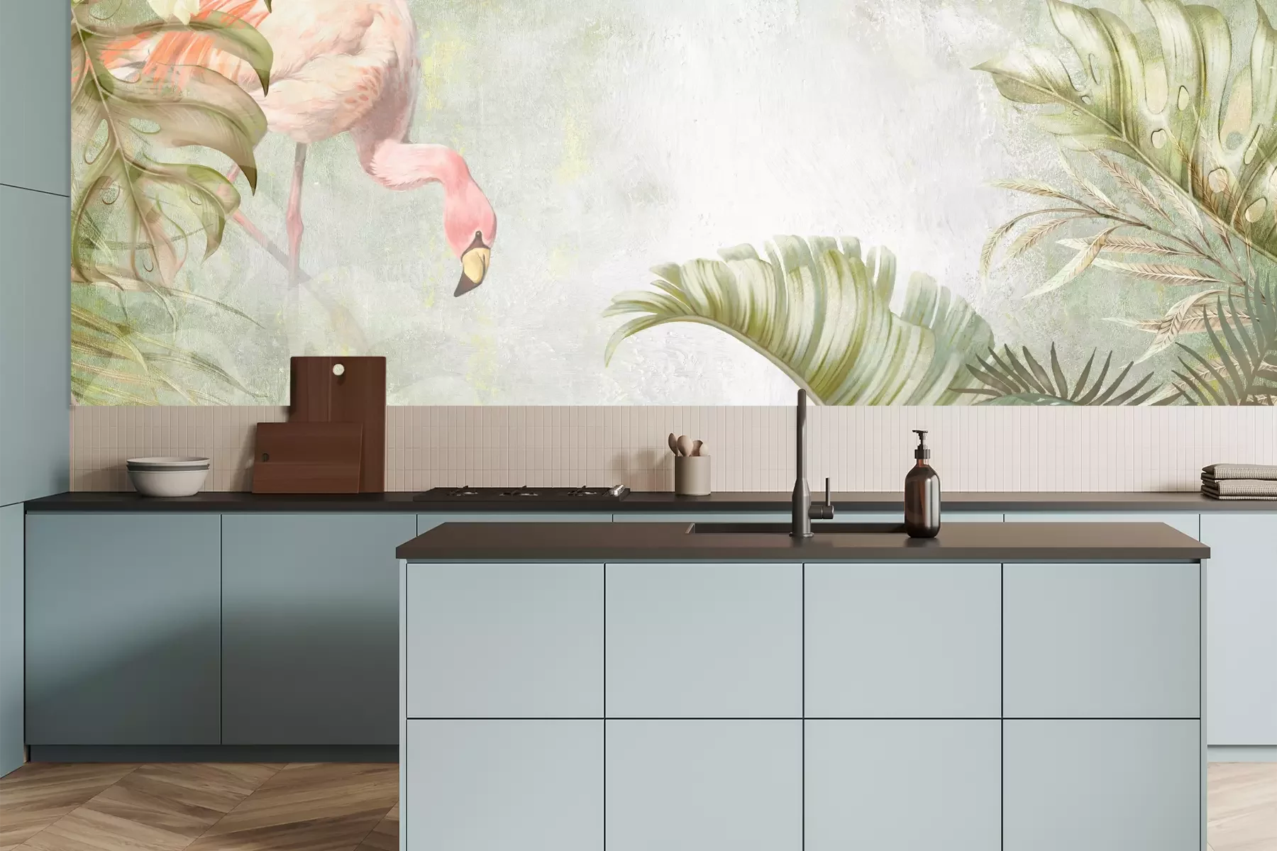 Das Material Premium+ besteht aus einer strukturierten Vinyl-Oberschicht und einem Trägermaterial (Vlies) mit einer Grammatur von 255 g/m², das kleine Unebenheiten der Wand zuverlässig kaschiert. Die feine Sandstruktur verleiht der Oberfläche eine luxuriöse Haptik, während das halbmatte Finish die Tiefe der Farben betont. Das Material ist dampfdurchlässig – so kann diese Fototapete auch in Küchen und Badezimmern eingesetzt werden. Die maximale Breite einer Tapetenbahn beträgt 100 cm. Bei größeren Abmessungen besteht die Fototapete aus mehreren gleich großen Bahnen. Der Kleber wird direkt auf die Wand aufgetragen, und die Fototapete wird auf Stoß angebracht, was für einen ästhetischen Effekt ohne sichtbare Fugen sorgt. Die Oberfläche ist pflegeleicht und kann bei Bedarf sanft mit einem feuchten Tuch abgewischt werden.