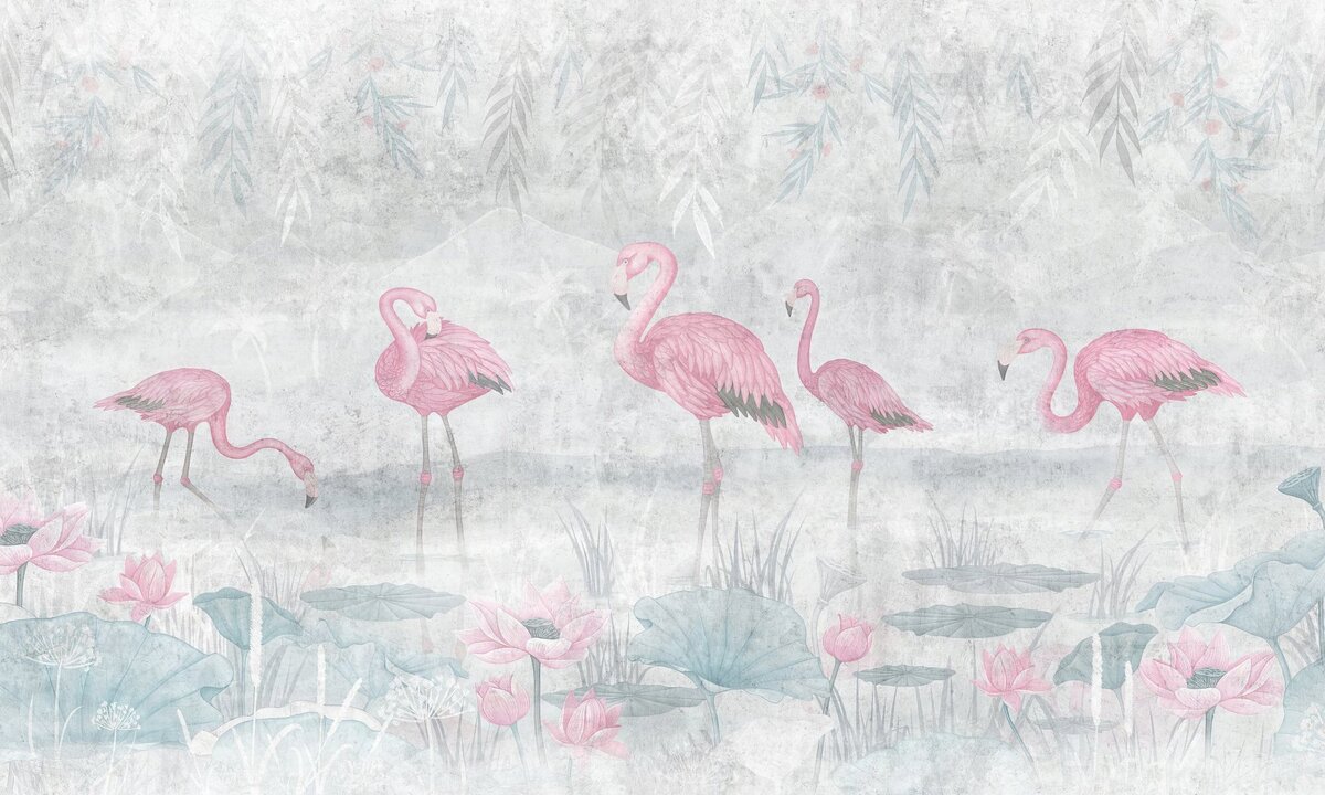 Fototapete: Flamingos auf dem Wasser im Aquarellstil mit Pflanzen