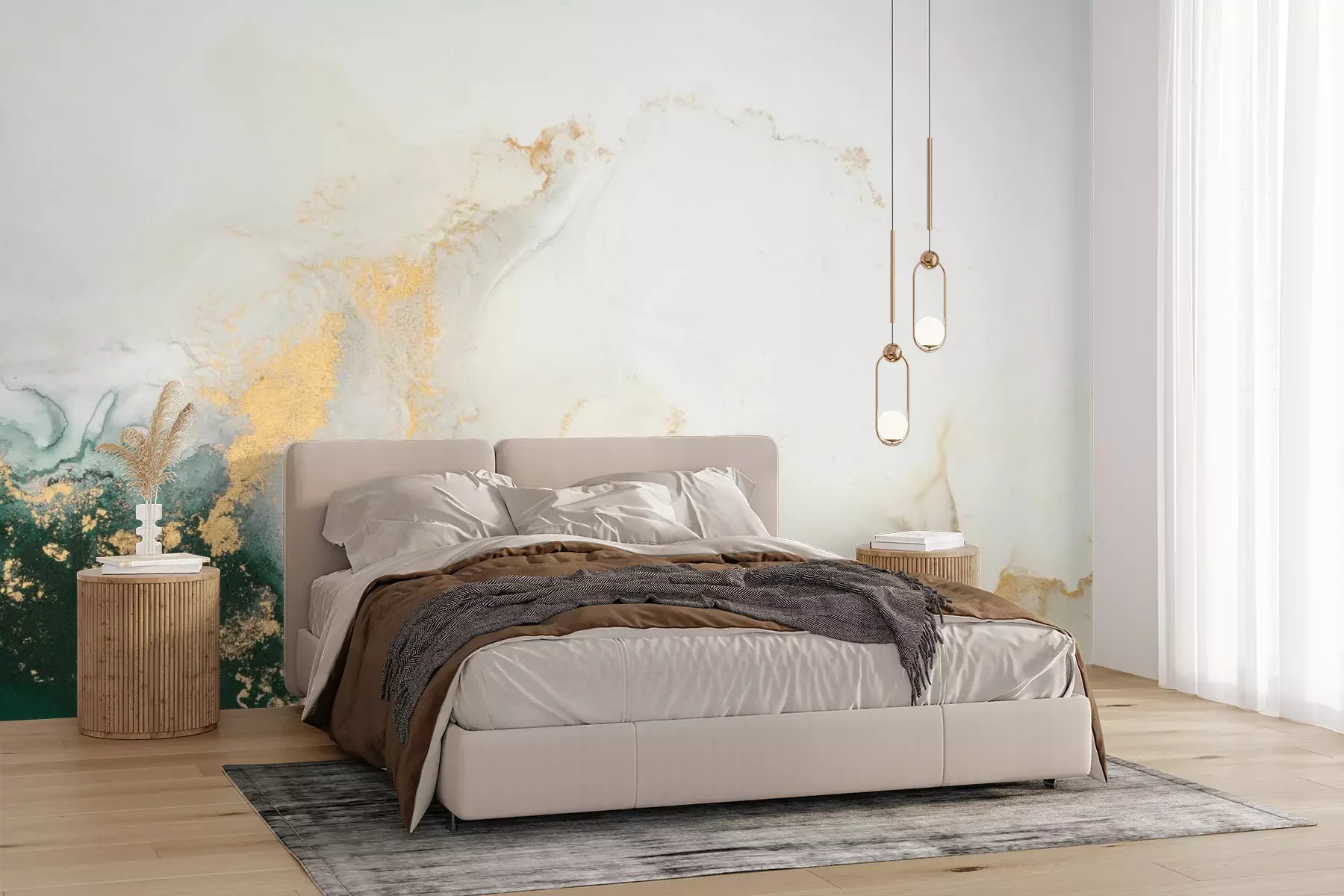 Das Material Premium+ besteht aus einer strukturierten Vinyl-Oberschicht und einem Trägermaterial (Vlies) mit einer Grammatur von 255 g/m², das kleine Unebenheiten der Wand zuverlässig kaschiert. Die feine Sandstruktur verleiht der Oberfläche eine luxuriöse Haptik, während das halbmatte Finish die Tiefe der Farben betont. Das Material ist dampfdurchlässig – so kann diese Fototapete auch in Küchen und Badezimmern eingesetzt werden. Die maximale Breite einer Tapetenbahn beträgt 100 cm. Bei größeren Abmessungen besteht die Fototapete aus mehreren gleich großen Bahnen. Der Kleber wird direkt auf die Wand aufgetragen, und die Fototapete wird auf Stoß angebracht, was für einen ästhetischen Effekt ohne sichtbare Fugen sorgt. Die Oberfläche ist pflegeleicht und kann bei Bedarf sanft mit einem feuchten Tuch abgewischt werden.