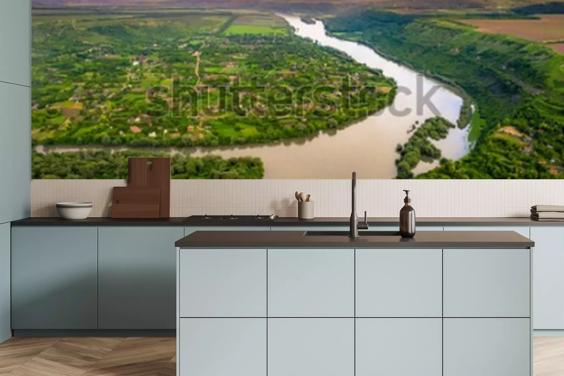 Fototapete Fluss im Wald bei Sonnenuntergang