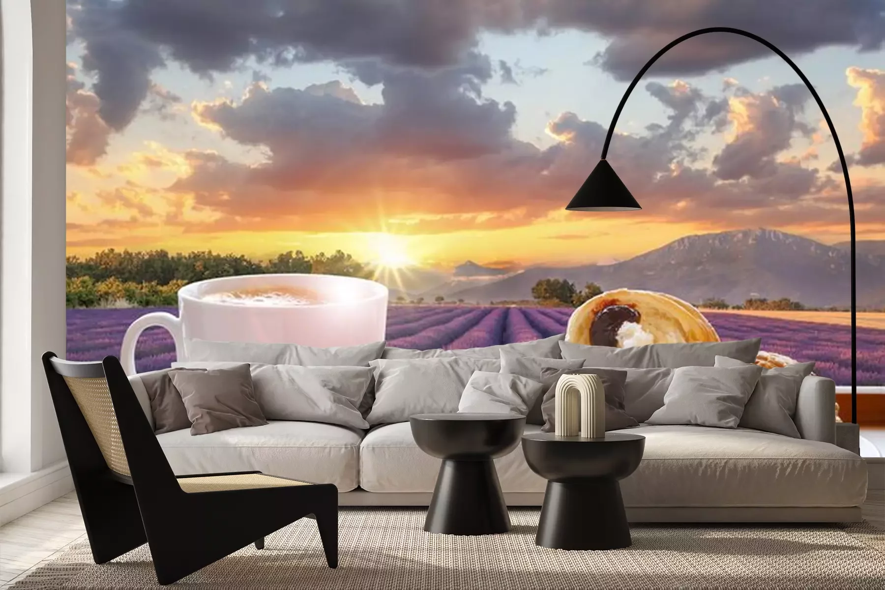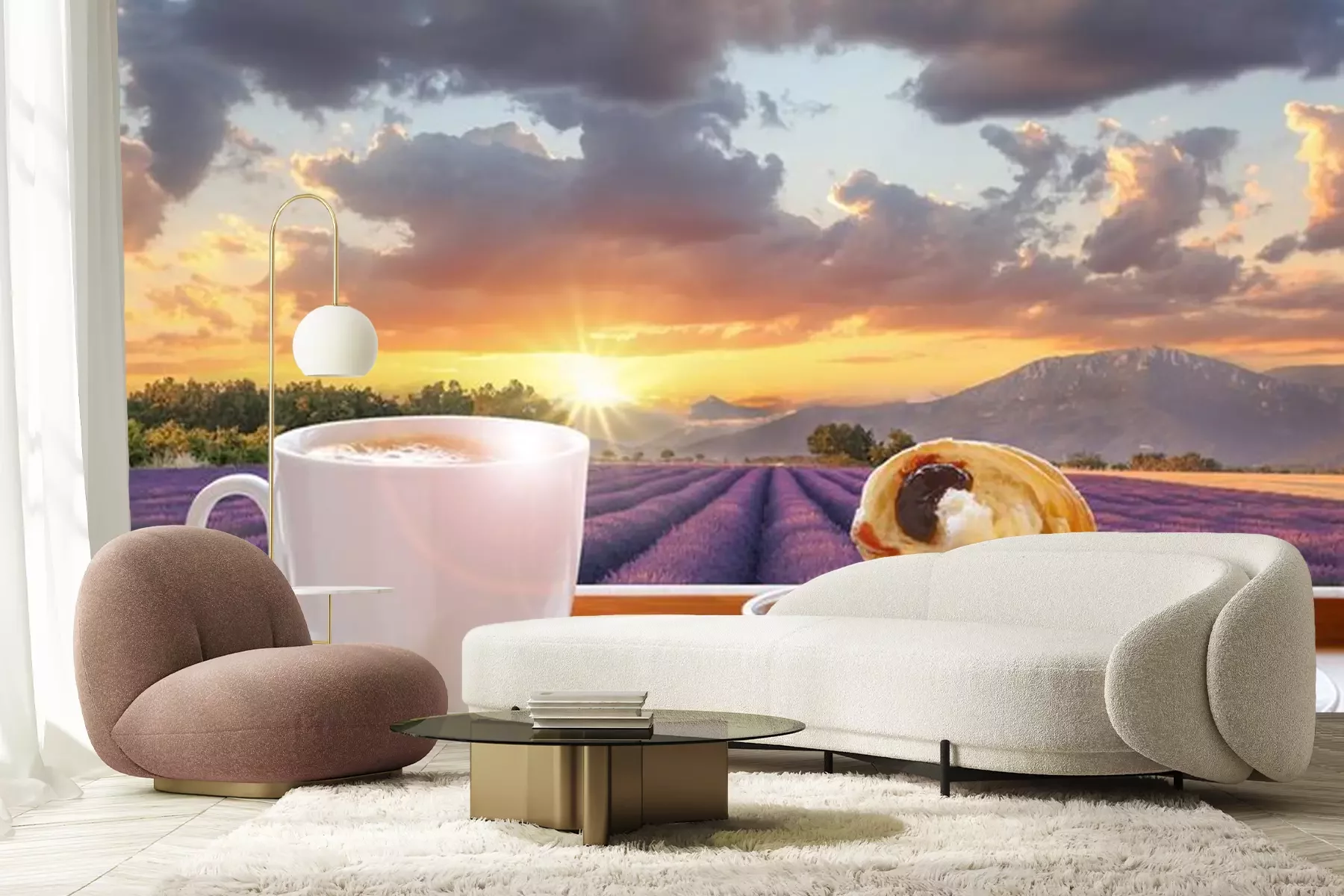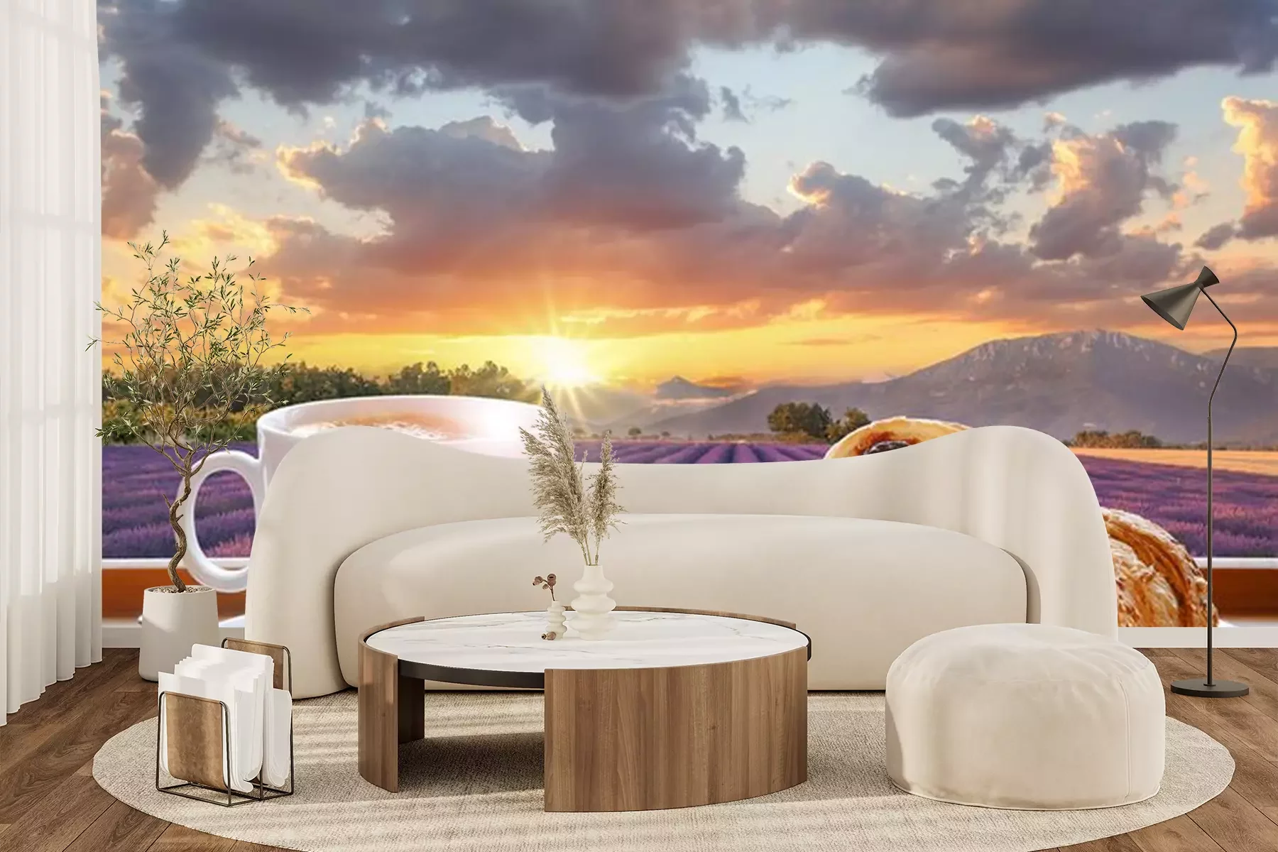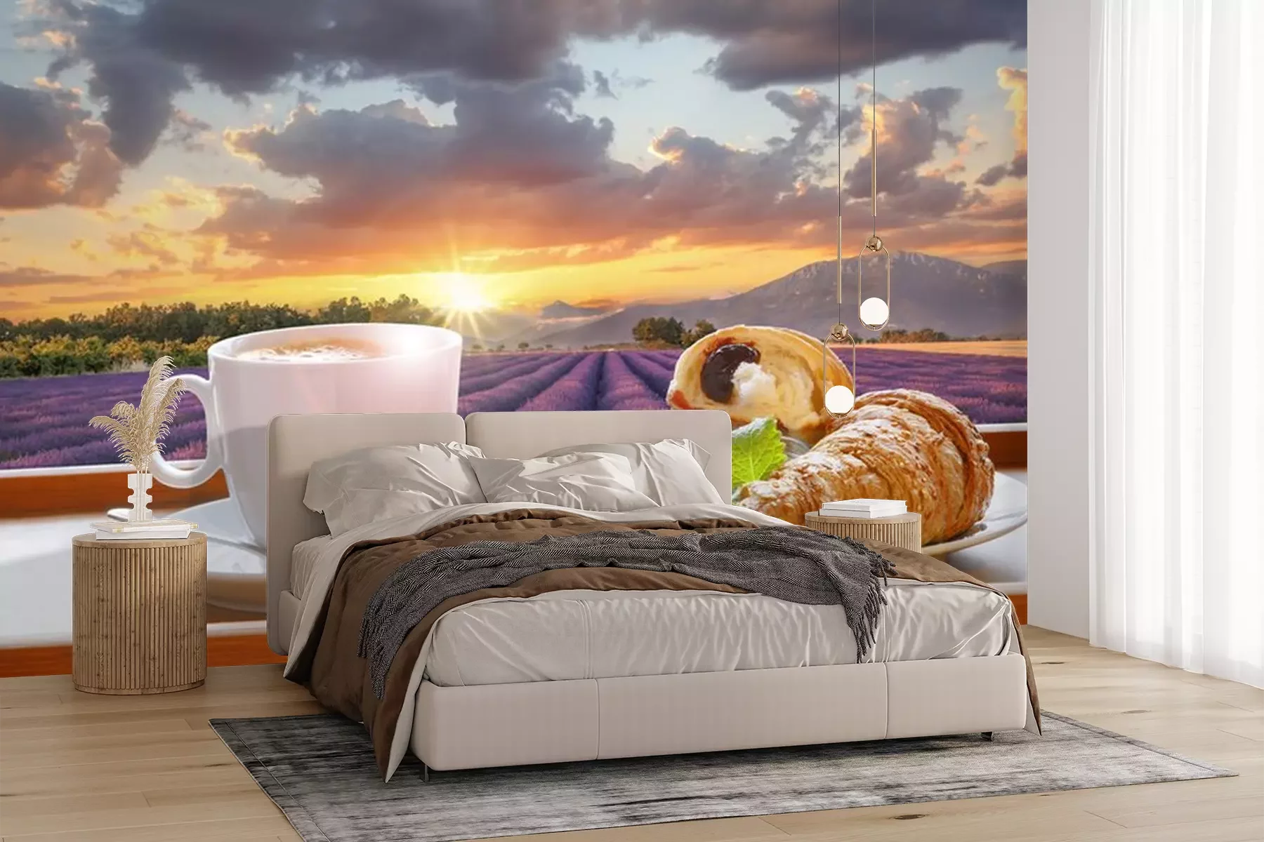 Fototapete Französische Landschaft mit Croissant und Kaffee
