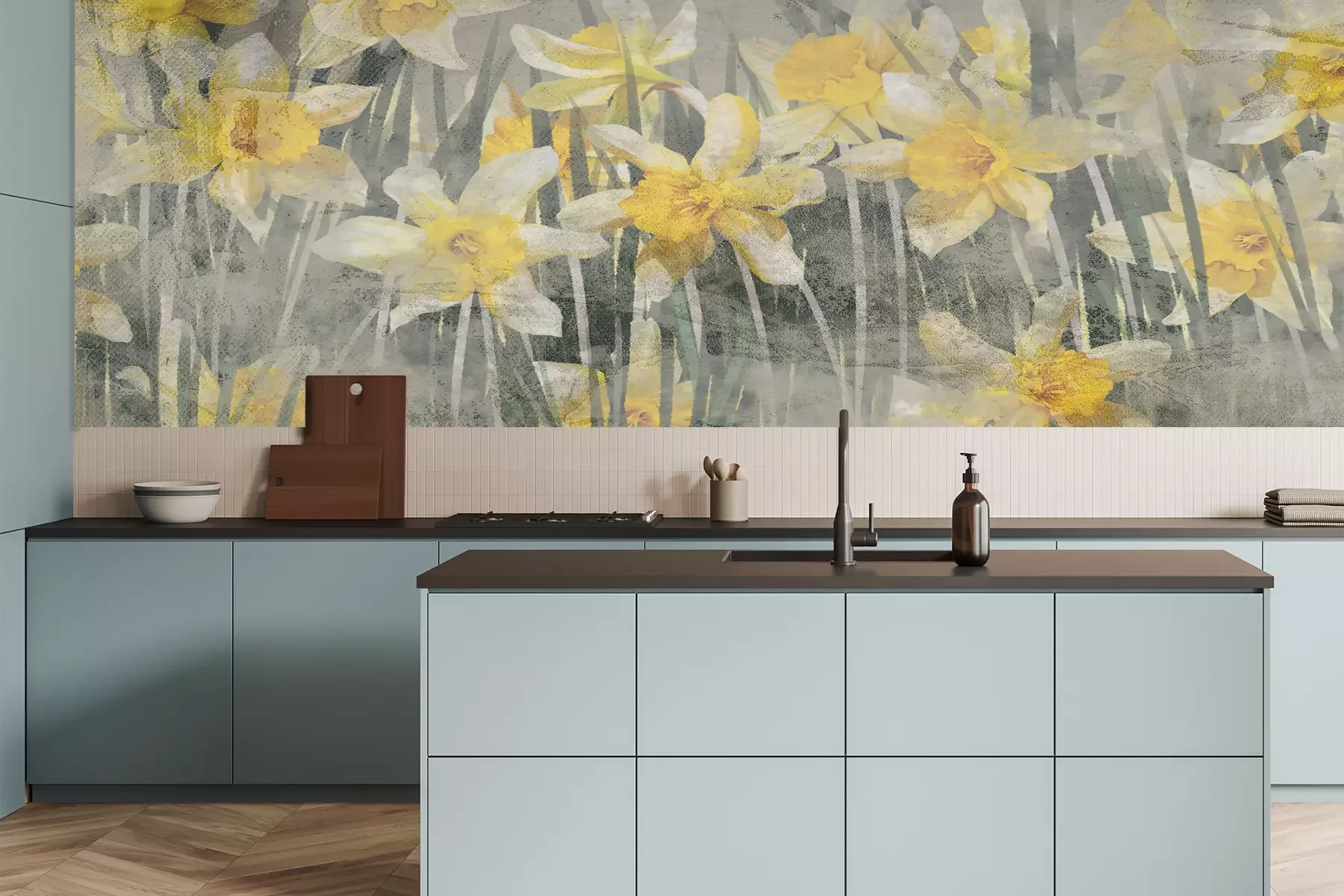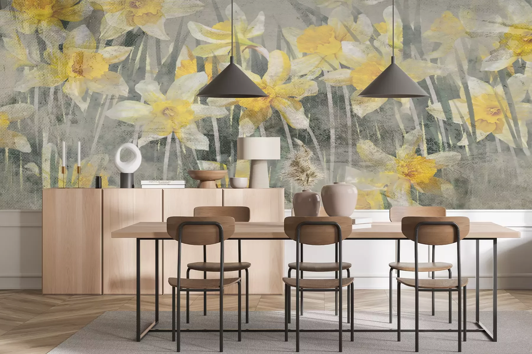 Blumen an Zweigen im Vintage-StilWir haben für dich ein gutes Beispiel für das dekorative Potenzial einer Fototapete. Blumen, die darauf erscheinen, basieren nicht auf einem Foto. Es handelt sich auch nicht um ein gewöhnliches Muster, sondern um eine Komposition, die ein Gemälde mit Farben perfekt imitiert. Das macht unser Angebot zu etwas mehr als nur einer beeindruckenden Wanddekoration. Eine solche Fototapete mit Blumen ist das Rezept für ein echtes Kunstwerk im Interieur. Denn obwohl es sich um einen Druck handelt, ist er auf den ersten Blick nicht von einem authentischen Gemälde zu unterscheiden. Der Raum erhält also eine Dekoration in Form eines faszinierenden Murals! Ein weiterer Vorteil dieses Musters ist die perfekte Farbauswahl. Dies ist gleichzeitig eine dezente und auffällige Fototapete. Blumen sind unglaublich energiegeladen und man kann nicht gleichgültig an ihnen vorbeigehen, aber gleichzeitig bietet der eher graue als grüne Hintergrund einen perfekten Kontrast und verleiht der Komposition einen ausgewogenen Charakter. Welche Atmosphäre bringen in die Wohnung solche Blumen? Fototapete mit Narzissen sorgt für eine fröhliche und frühlingshafte Stimmung in der Einrichtung, die dich jeden Tag in eine ausgezeichnete Laune versetzen wird. Und welche Einrichtung solltest du haben, um dich für zu ein solches Motiv entscheiden zu können, wie diese Blumen? Fototapete sieht sicherlich in einem Retro-Arrangement gut aus, da das Muster den Eindruck eines leicht verblassten Drucks erweckt. So erhält das Arrangement einen authentisch altmodischen Look. Auch in einem industriellen Wohnzimmer wirst du einen tollen Effekt erzielen. Ein Raum in Grautönen gewinnt an Glanz und Leichtigkeit, wenn du ihn mit gelben Akzenten durchbrichst, die perfekt passen. Du wirst überrascht sein, wie viel eine solche Deko im Raum verändern, wie unsere Fototapete! Blumen werden auch eine schöne Krönung für ein Schlafzimmer im Öko-Stil sein. Sie passen zu dunklen Holzmöbeln und grünen Textilien. Das Muster wird zu einem beruhigenden Hintergrund, der dich nach einem ganzen Tag entspannen lässt. Wenn du in der Küche eine leere Wand hast, an der der Esstisch steht, setze auf eine blumige Fototapete. Natur in Form einer blühenden Wiese oder eines Blumenbeets fördert die gute Stimmung beim gemeinsamen Essen mit der Familie.