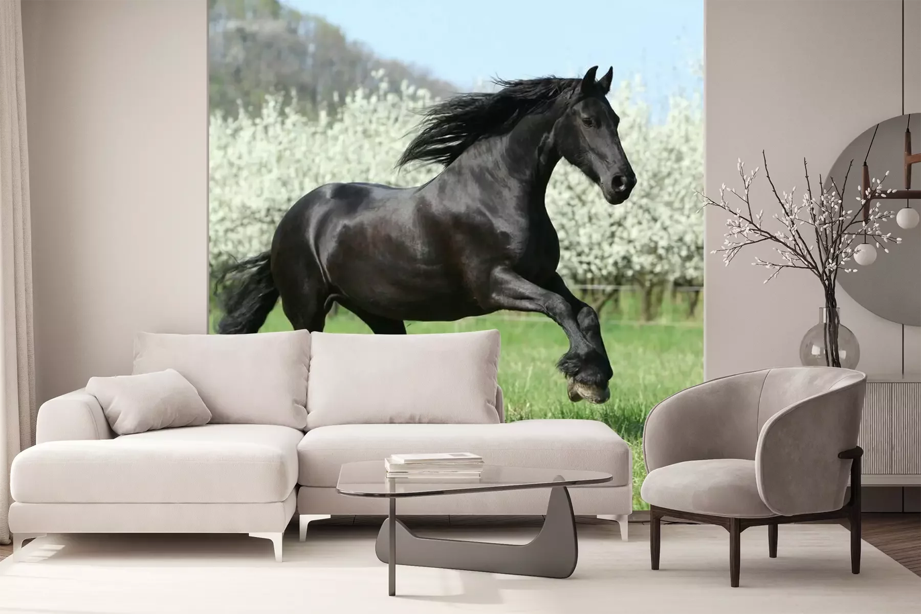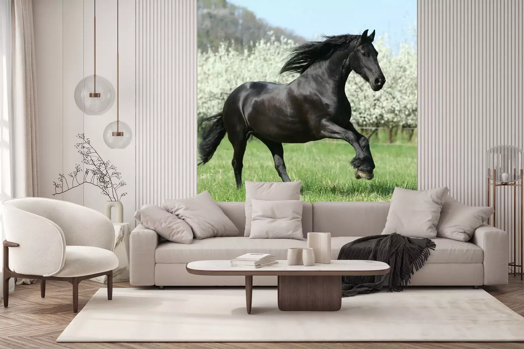 Ein schwarzes Pferd galoppiert über das GrasFototapete