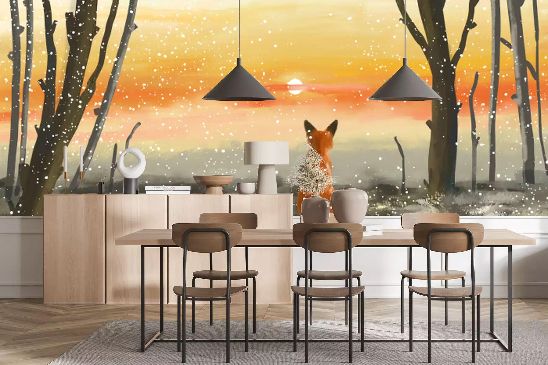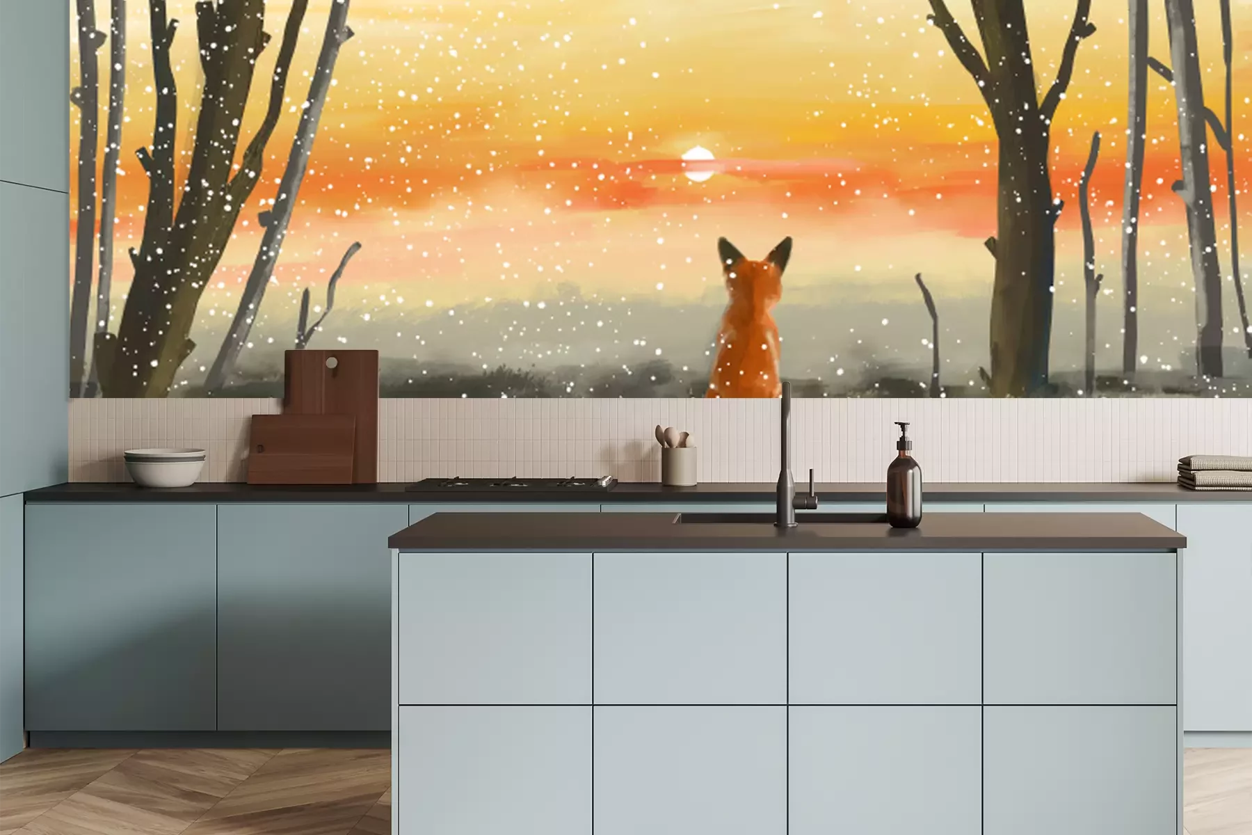 Fototapete Fuchs im Winterwald bei Sonnenuntergang