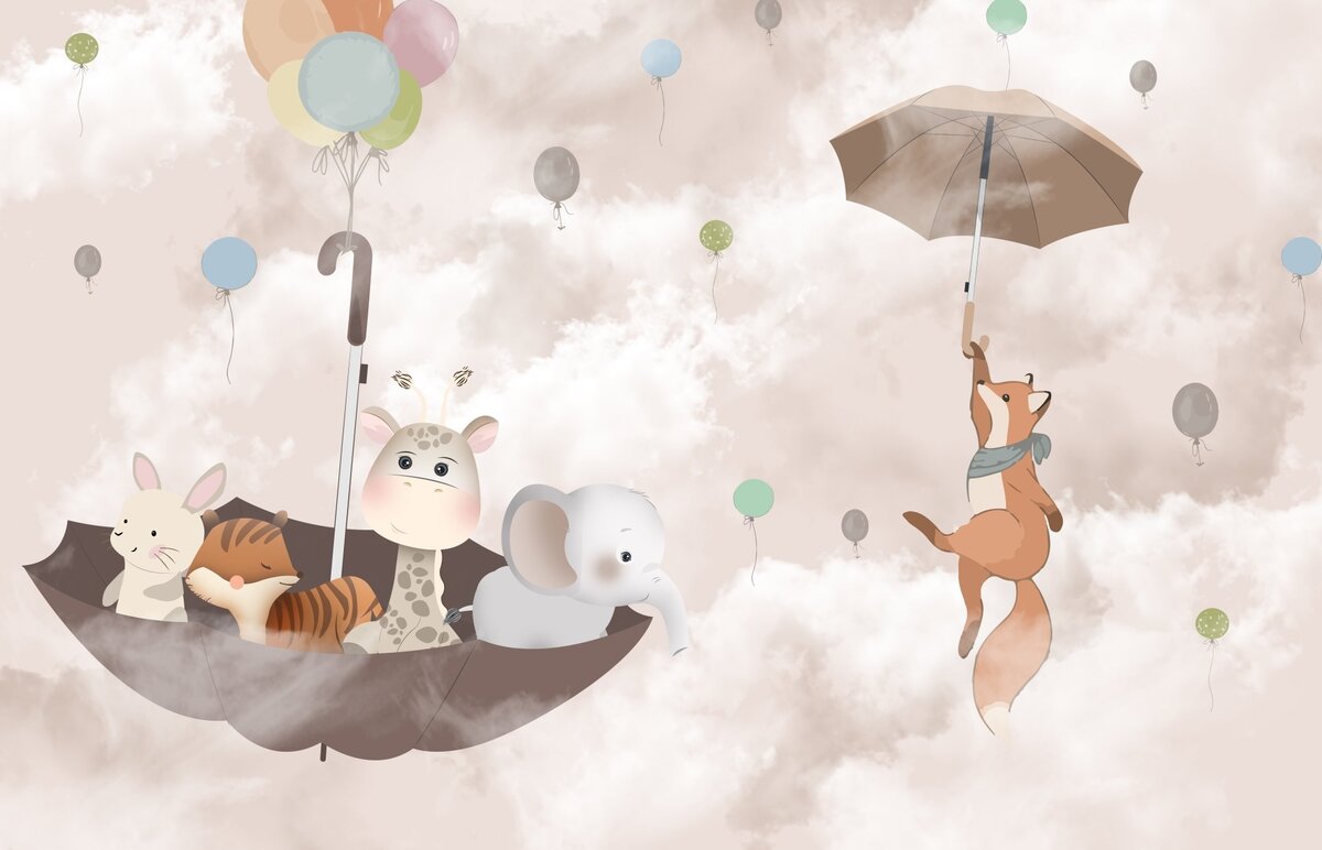 Fototapete: Fuchs mit einer Giraffe und einem Elefanten auf einem Regenschirm in den Wolken