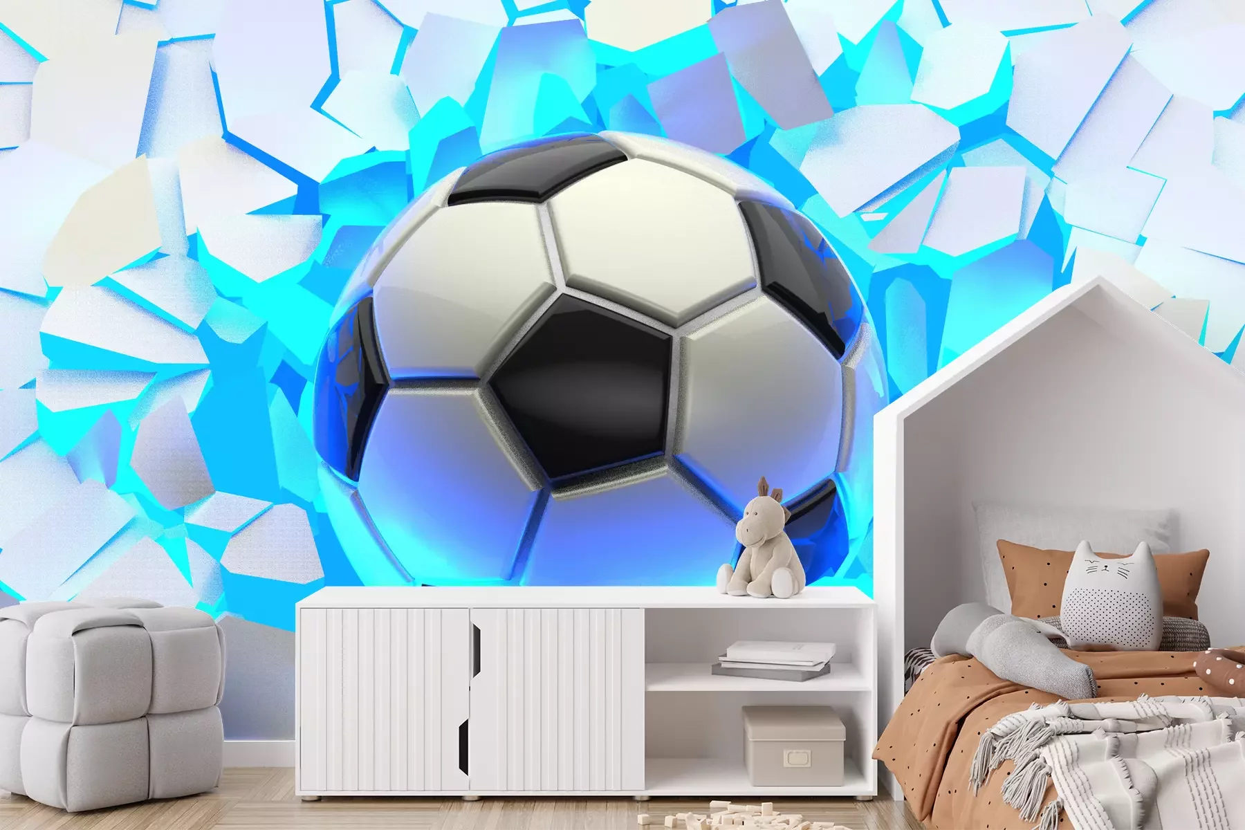 Die hier präsentierte Fototapete für Jungenzimmer mit Fußballmotiv ist eine hervorragende Lösung, wenn sich dein Kind für Sport interessiert. So wird die Wanddekoration nicht nur zur Ausschmückung im Raum, sondern auch zu einer Möglichkeit, die Leidenschaft des Kindes zu betonen. Besonders auffällig ist der dreidimensionale Charakter dieser Fototapete. Fußball 3D, der durch eine gebrochene Wand in den Raum zu fliegen scheint, ist ein sehr auffälliges Dekorationselement, das den Raum optisch vergrößert. Ein solches Wandmotiv lässt das Zimmer visuell in einen zusätzlichen Raum übergehen, was die Wahrnehmung der Raumgröße verändert. Ein wichtiger Aspekt sind die Farben dieser Fototapete. Fußball ist zwar im traditionellen Duo Schwarz-Weiß gehalten, aber was sofort ins Auge fällt, ist der neonblaue Schein, der den Ball umgibt. Genau dieses Element macht diese Fototapete für Jungenzimmer so ausdrucksstark. Das Muster erweckt den Eindruck, als würde es leuchten, was das Kind mit Sicherheit anspricht, da das Zimmer dadurch einen einzigartigen Look erhält. Dank der Möglichkeit, die Größe unserer Fototapete an die Wand anzupassen, die du dekorieren möchtest, kannst du problemlos sowohl ein kleines als auch ein geräumiges Kinderzimmer gestalten. Obwohl es sich nicht um eine völlig abstrakte Fototapete handelt, da sie im sportlichen Kontext verankert ist, ist die Komposition überraschend genug, um einen wirklich einzigartigen Effekt im Raum zu erzielen. Das hier dargestellte Motiv sieht sowohl im Zimmer eines kleinen Jungen als auch in einer jugendlichen Einrichtung hervorragend aus. Ein weiterer Vorteil dieser sportlichen, abstrakten Fototapete ist, dass ein fußballbegeistertes Kind nicht so schnell aus dieser Dekoration herauswächst. Ein idealer Platz für ein solches Motiv ist eine Wand in der Nähe der Spielecke oder des Schreibtischs. Einen großartigen visuellen Effekt erzielst du, wenn sich im Zimmer weitere blaue Elemente befinden. Diese passen perfekt zum neonblauen Schein der Fototapete. Fußball auf diesem Muster fügt sich dadurch noch besser in dein Raumkonzept ein.
