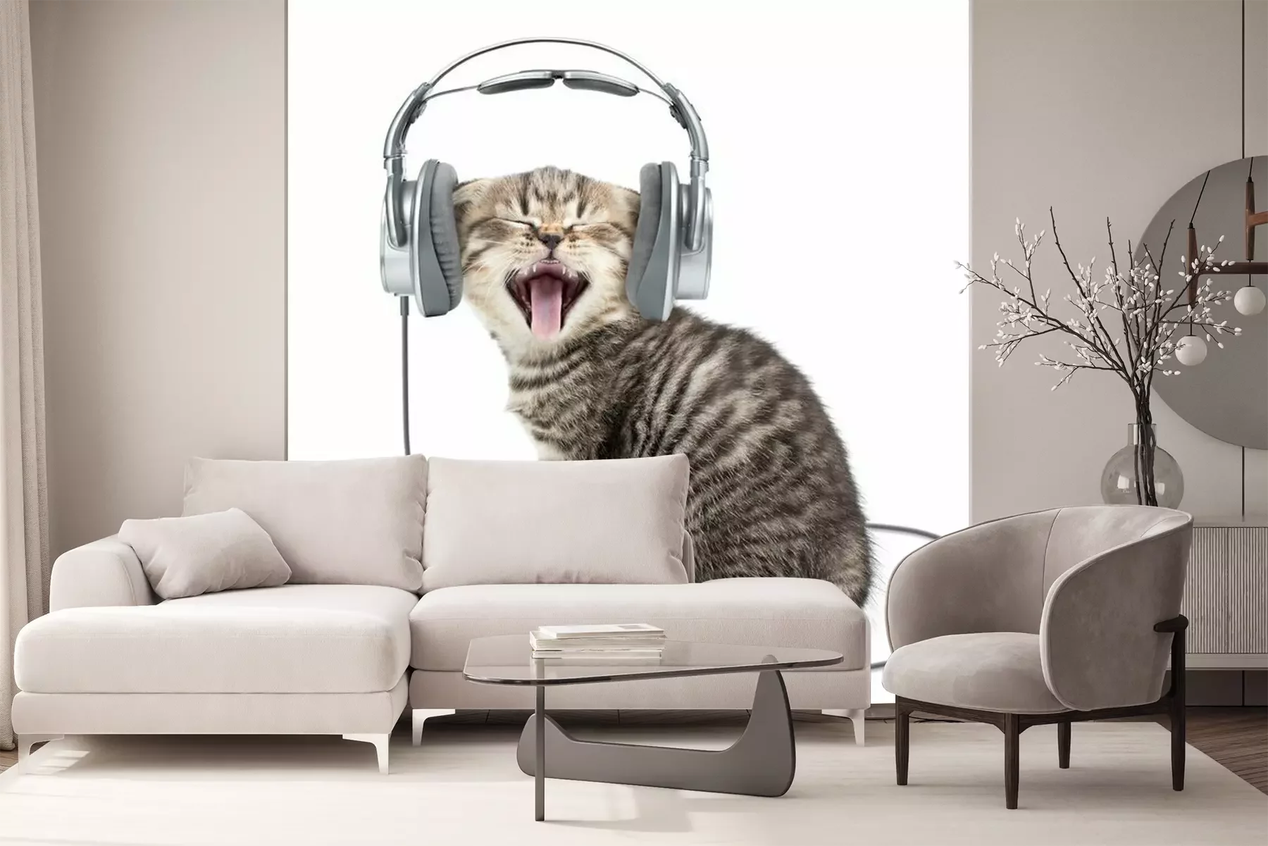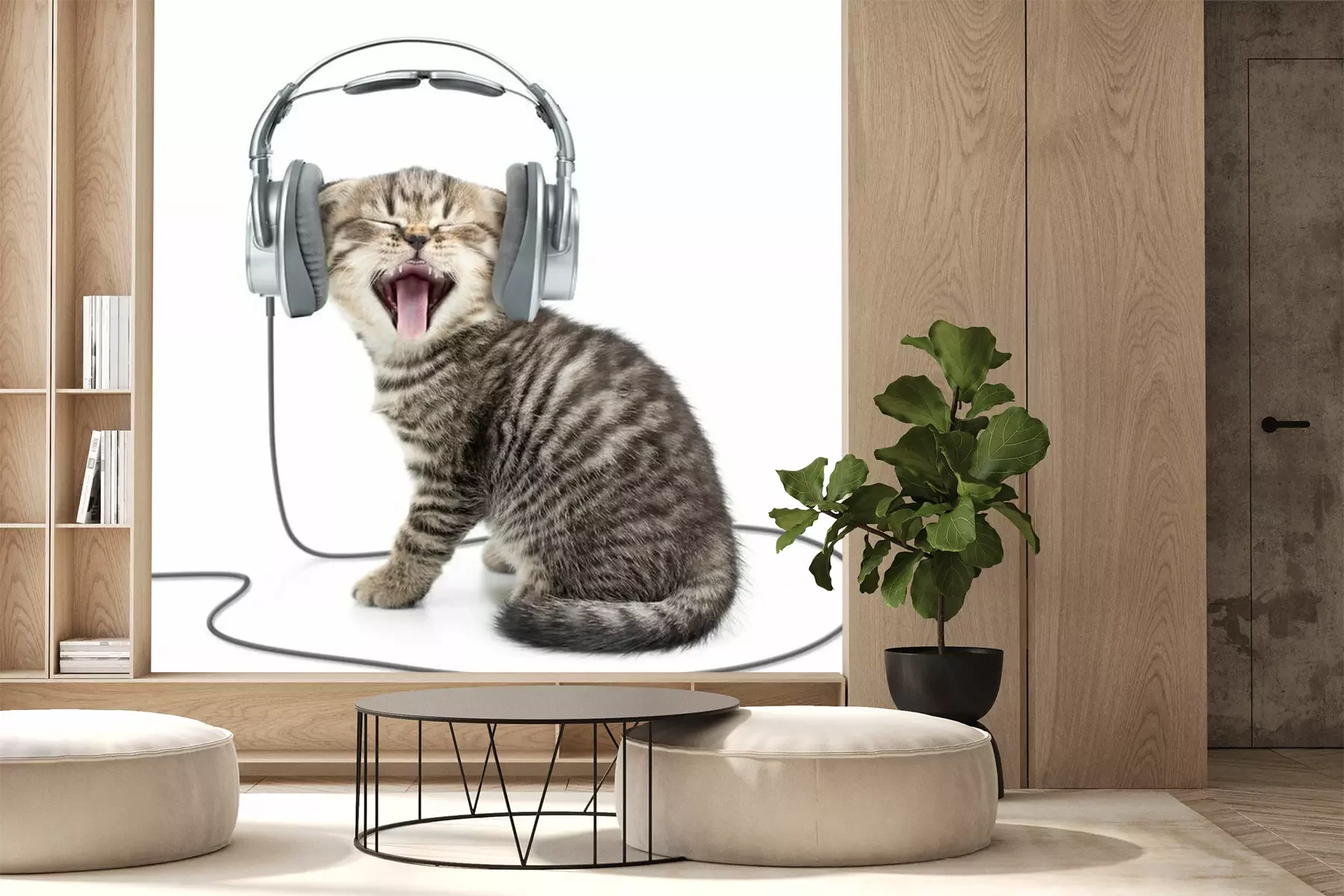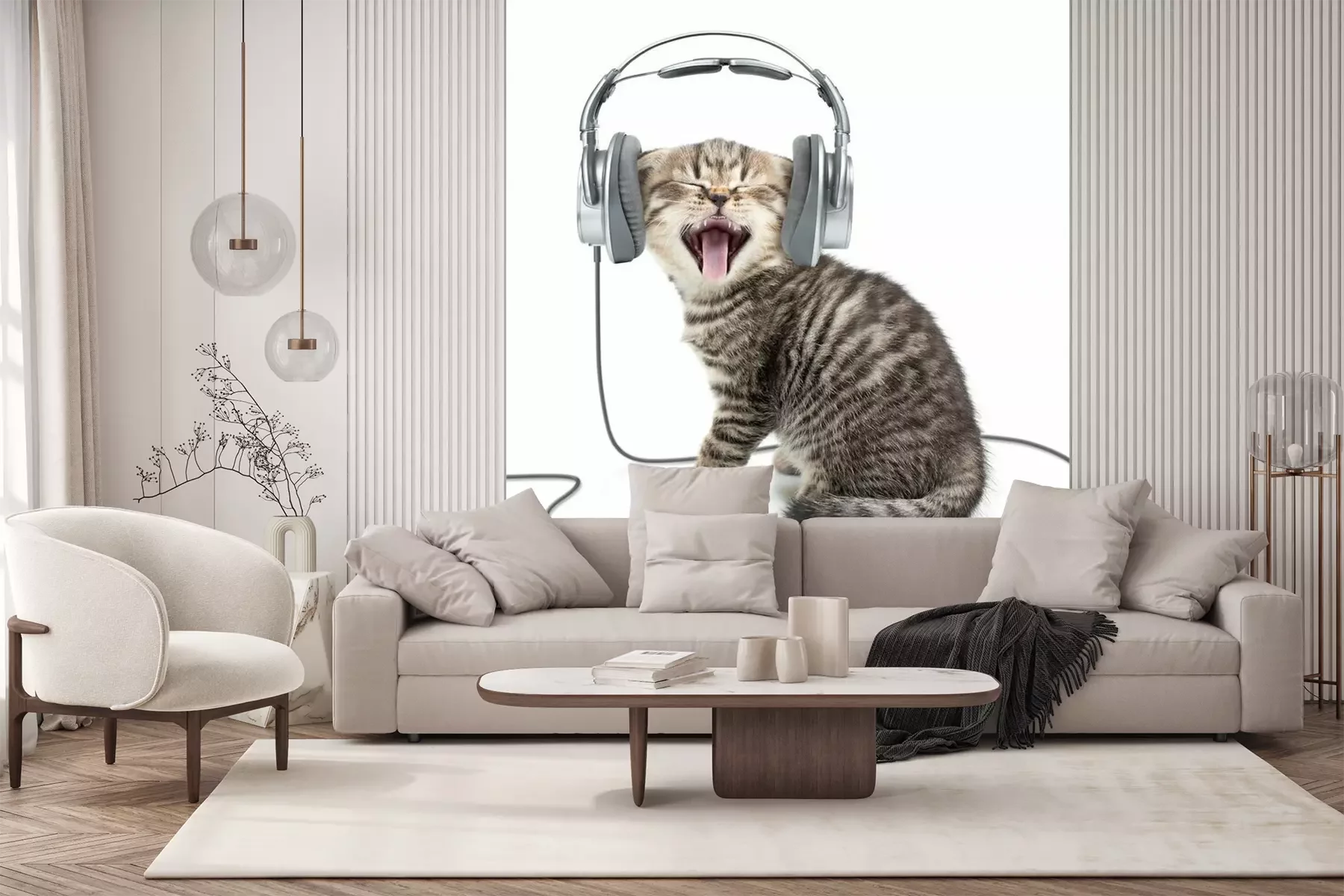 Fototapete Gähnendes Kätzchen mit Kopfhörer
