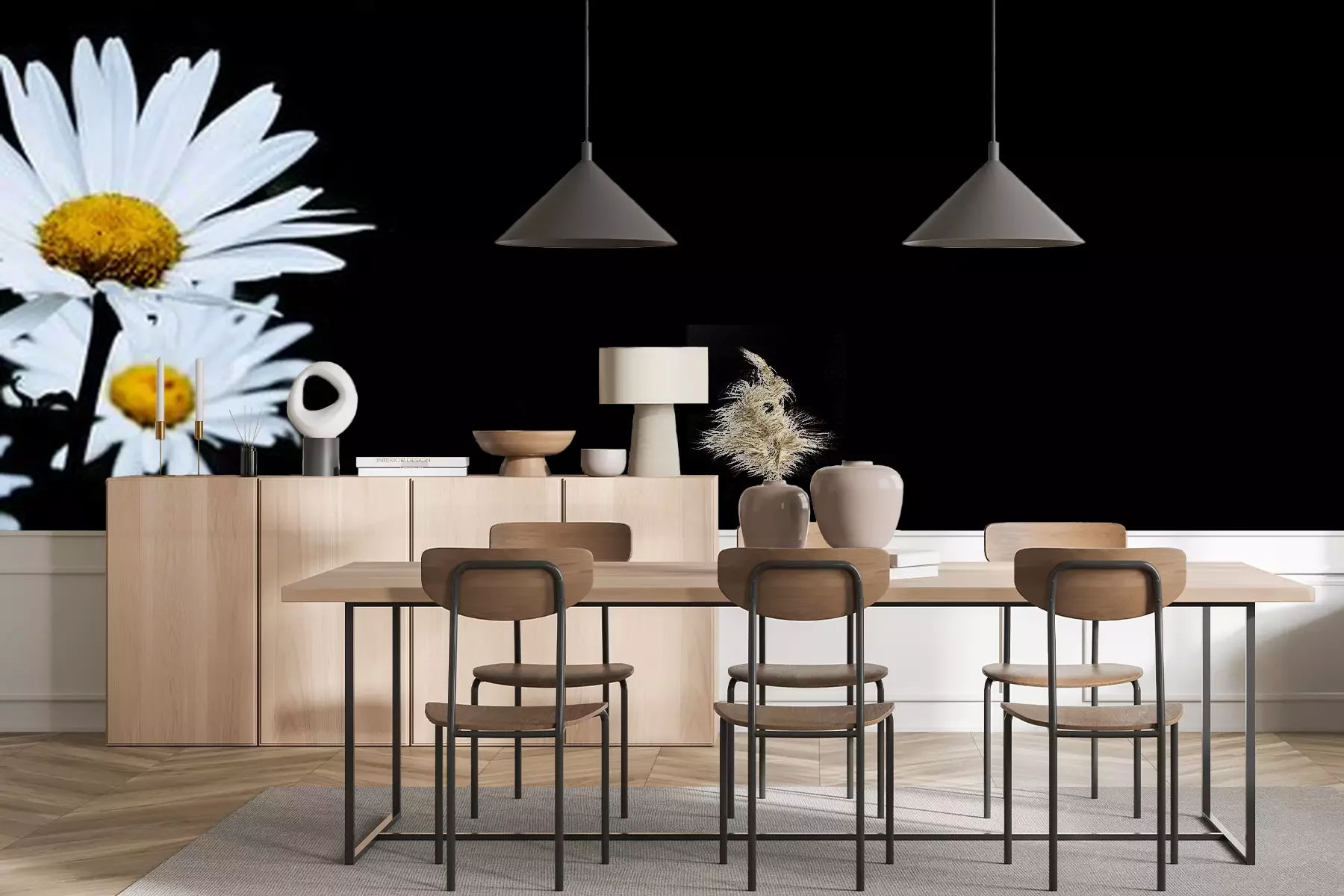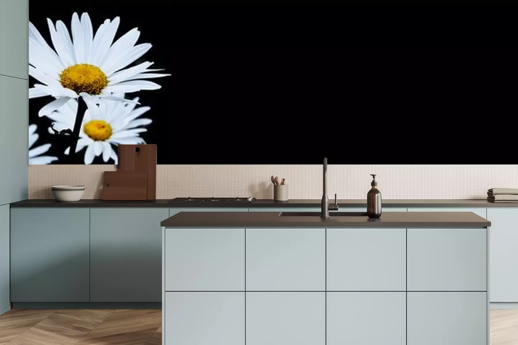Fototapete Gänseblümchen auf schwarzem Hintergrund