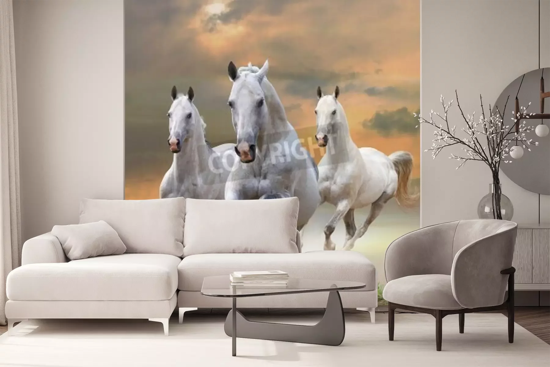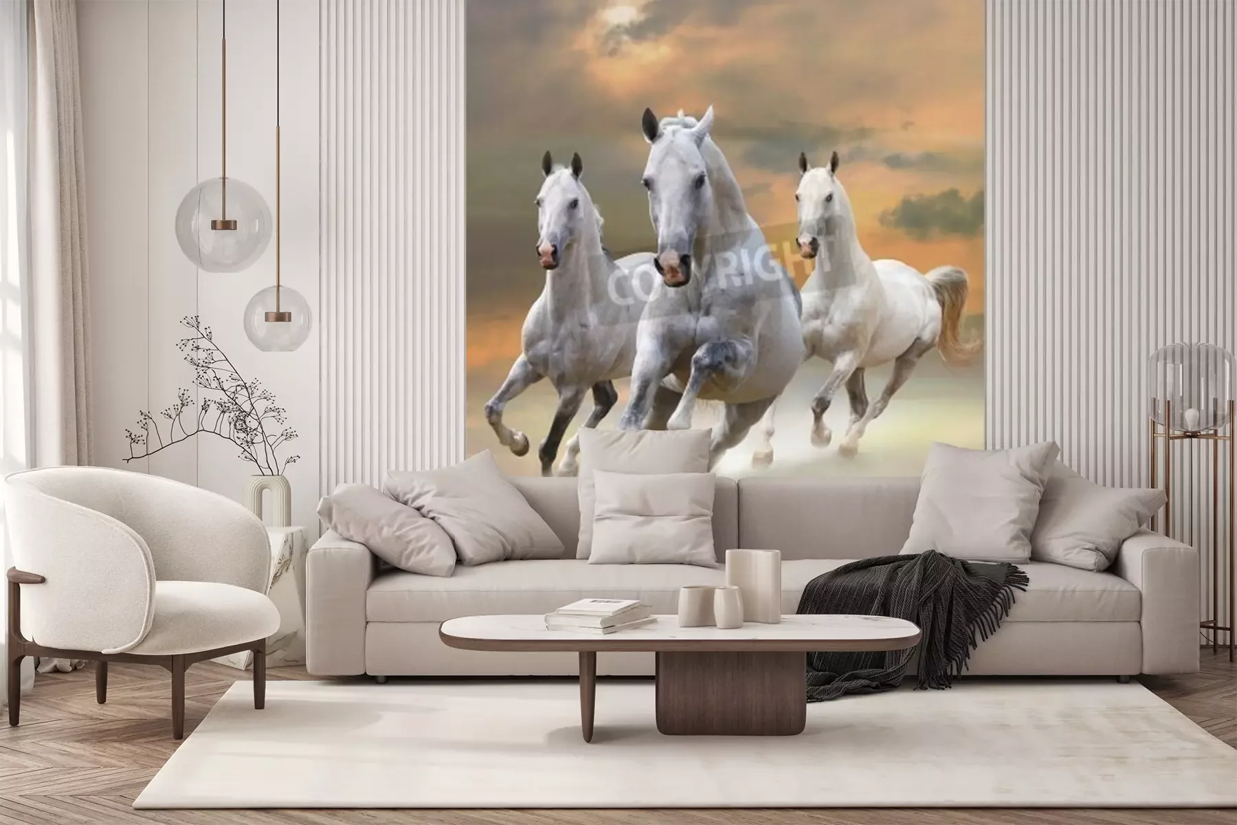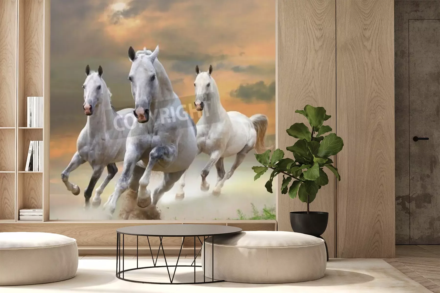 Fototapete Galoppierende pferde bei sonnenuntergang