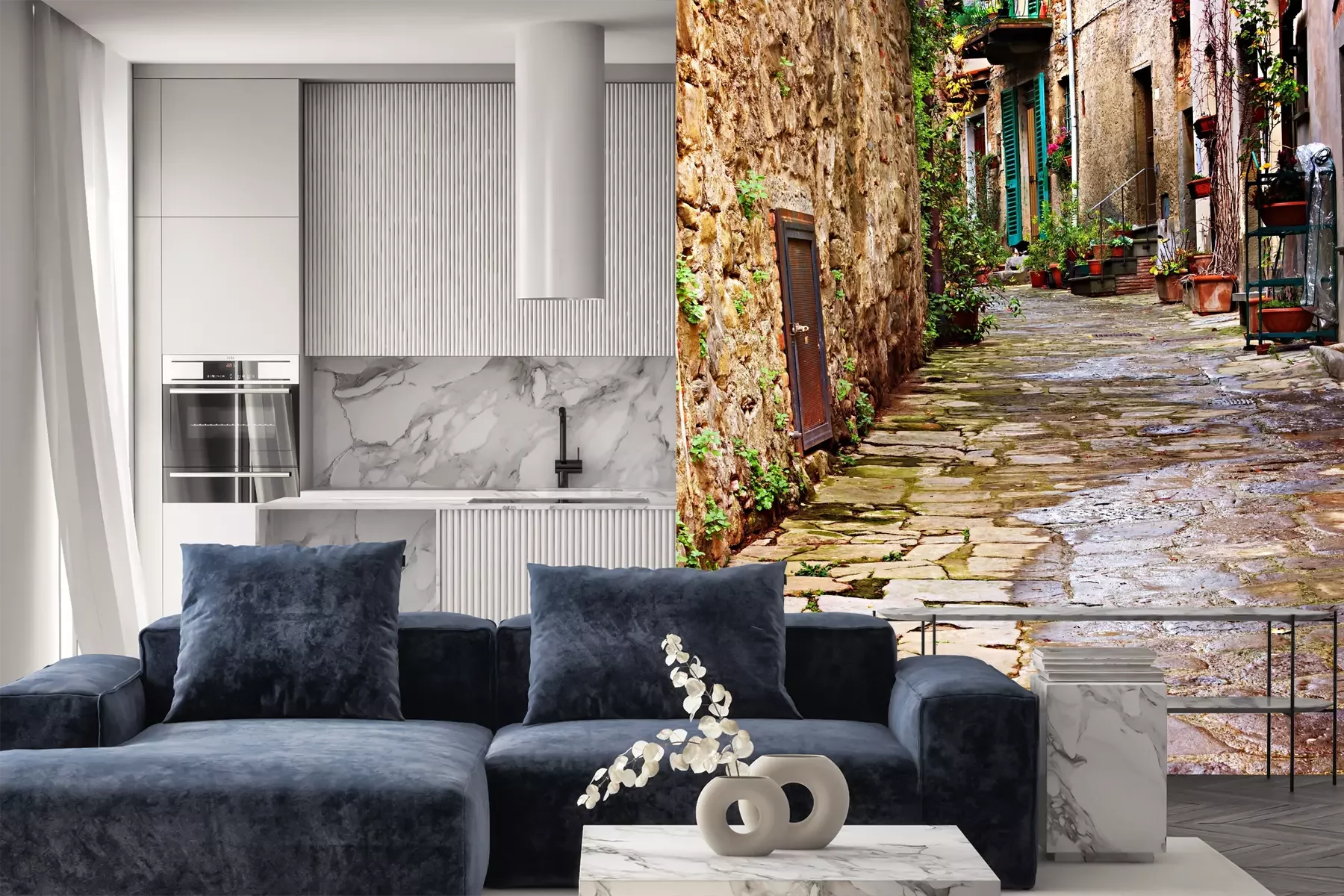 Das Material Premium+ besteht aus einer strukturierten Vinyl-Oberschicht und einem Trägermaterial (Vlies) mit einer Grammatur von 255 g/m², das kleine Unebenheiten der Wand zuverlässig kaschiert. Die feine Sandstruktur verleiht der Oberfläche eine luxuriöse Haptik, während das halbmatte Finish die Tiefe der Farben betont. Das Material ist dampfdurchlässig – so kann diese Fototapete auch in Küchen und Badezimmern eingesetzt werden. Die maximale Breite einer Tapetenbahn beträgt 100 cm. Bei größeren Abmessungen besteht die Fototapete aus mehreren gleich großen Bahnen. Der Kleber wird direkt auf die Wand aufgetragen, und die Fototapete wird auf Stoß angebracht, was für einen ästhetischen Effekt ohne sichtbare Fugen sorgt. Die Oberfläche ist pflegeleicht und kann bei Bedarf sanft mit einem feuchten Tuch abgewischt werden.
