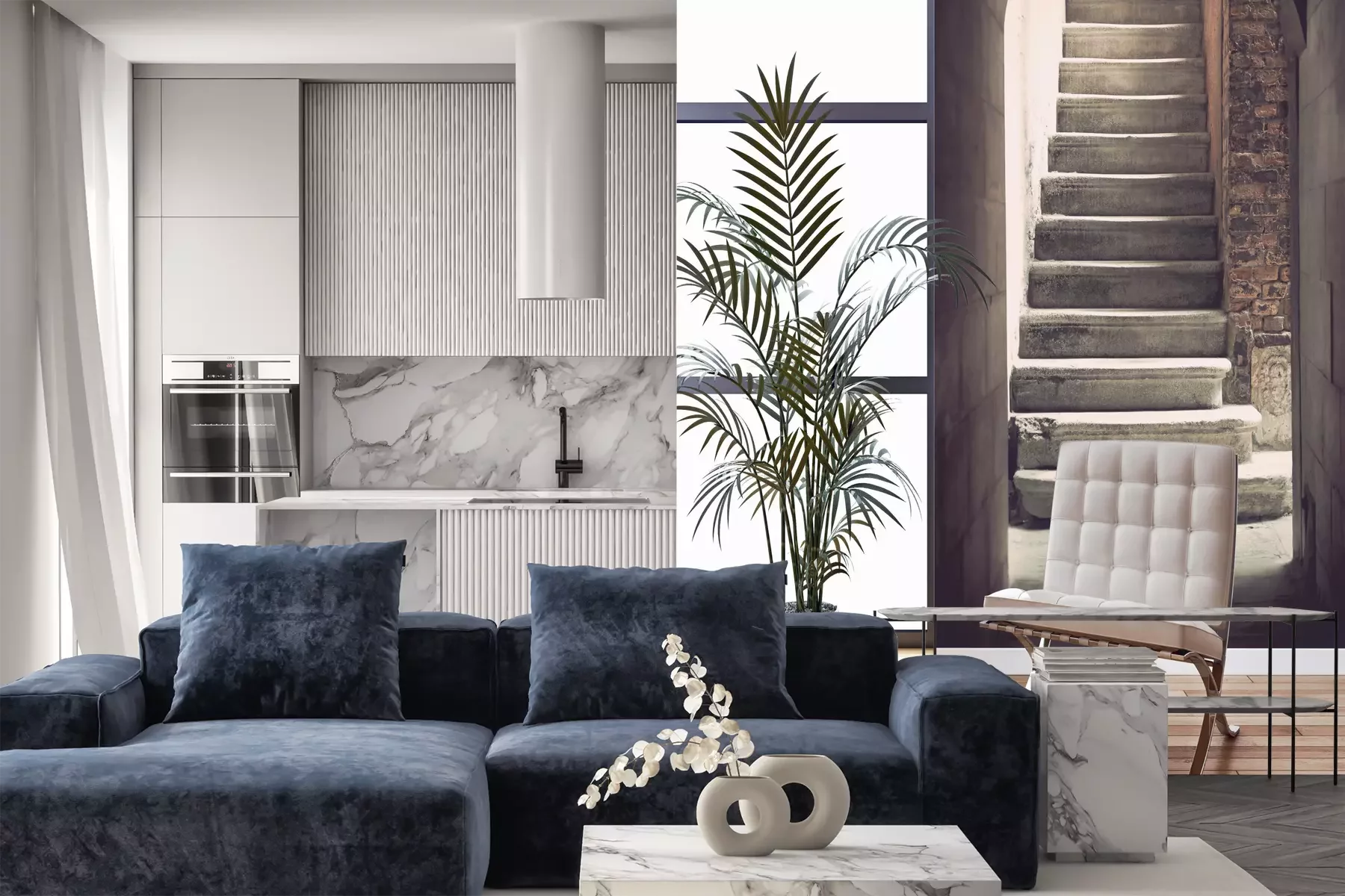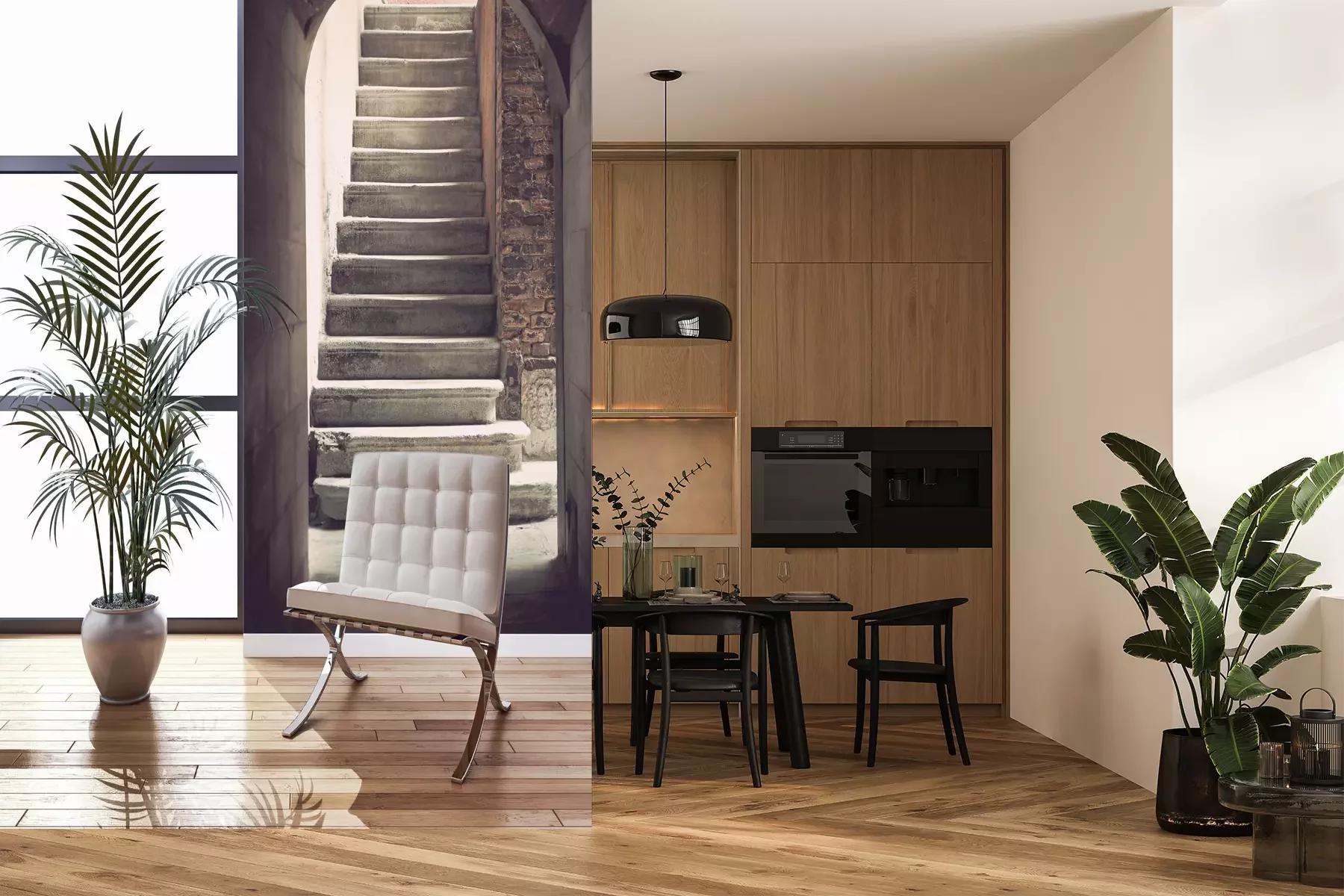Das Material Premium+ besteht aus einer strukturierten Vinyl-Oberschicht und einem Trägermaterial (Vlies) mit einer Grammatur von 255 g/m², das kleine Unebenheiten der Wand zuverlässig kaschiert. Die feine Sandstruktur verleiht der Oberfläche eine luxuriöse Haptik, während das halbmatte Finish die Tiefe der Farben betont. Das Material ist dampfdurchlässig – so kann diese Fototapete auch in Küchen und Badezimmern eingesetzt werden. Die maximale Breite einer Tapetenbahn beträgt 100 cm. Bei größeren Abmessungen besteht die Fototapete aus mehreren gleich großen Bahnen. Der Kleber wird direkt auf die Wand aufgetragen, und die Fototapete wird auf Stoß angebracht, was für einen ästhetischen Effekt ohne sichtbare Fugen sorgt. Die Oberfläche ist pflegeleicht und kann bei Bedarf sanft mit einem feuchten Tuch abgewischt werden.